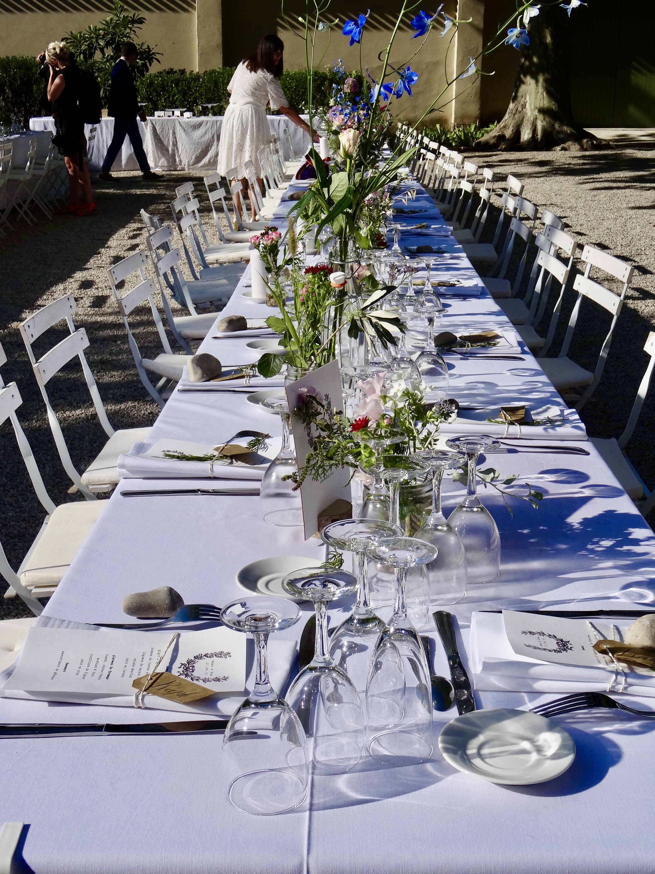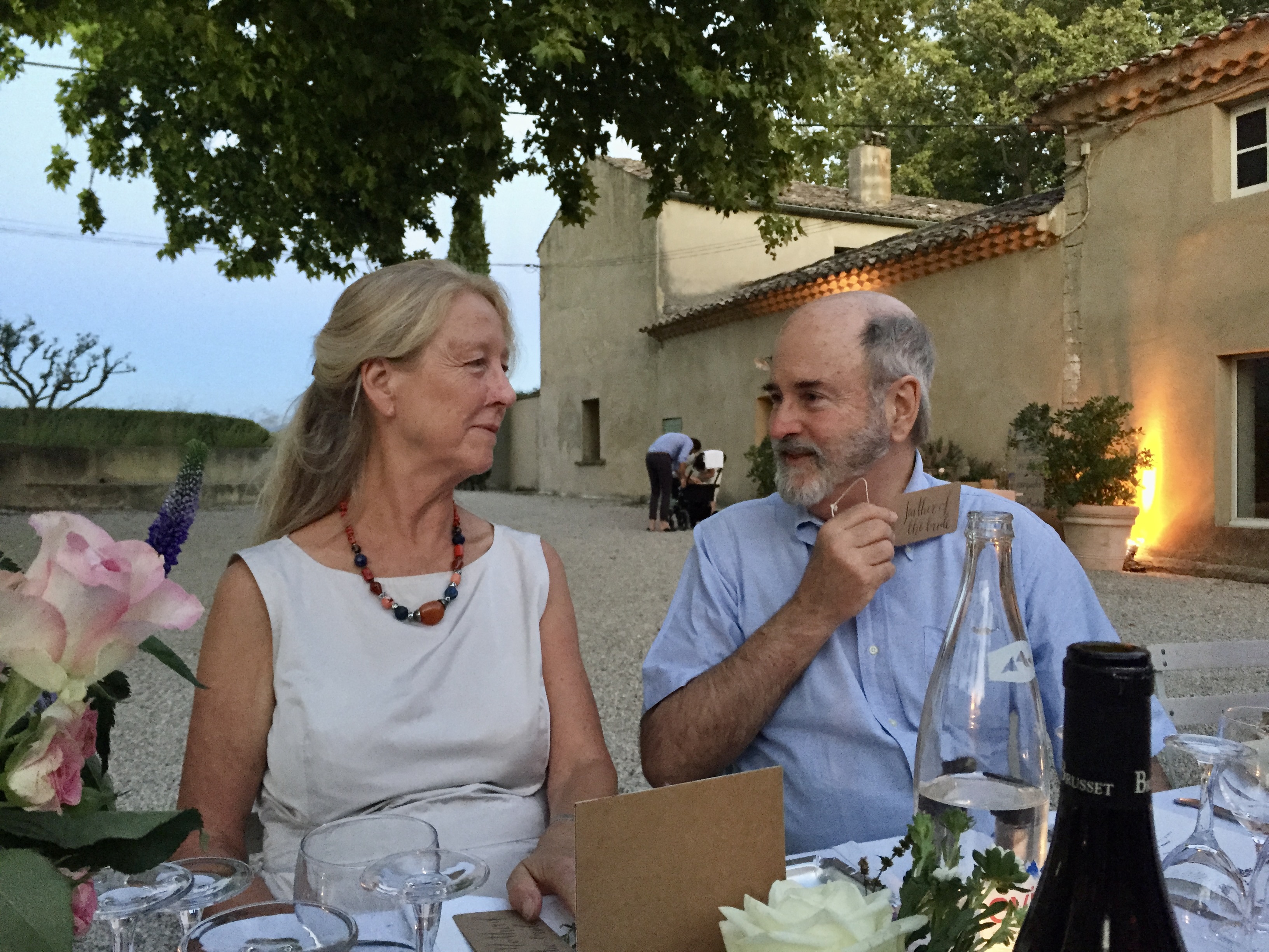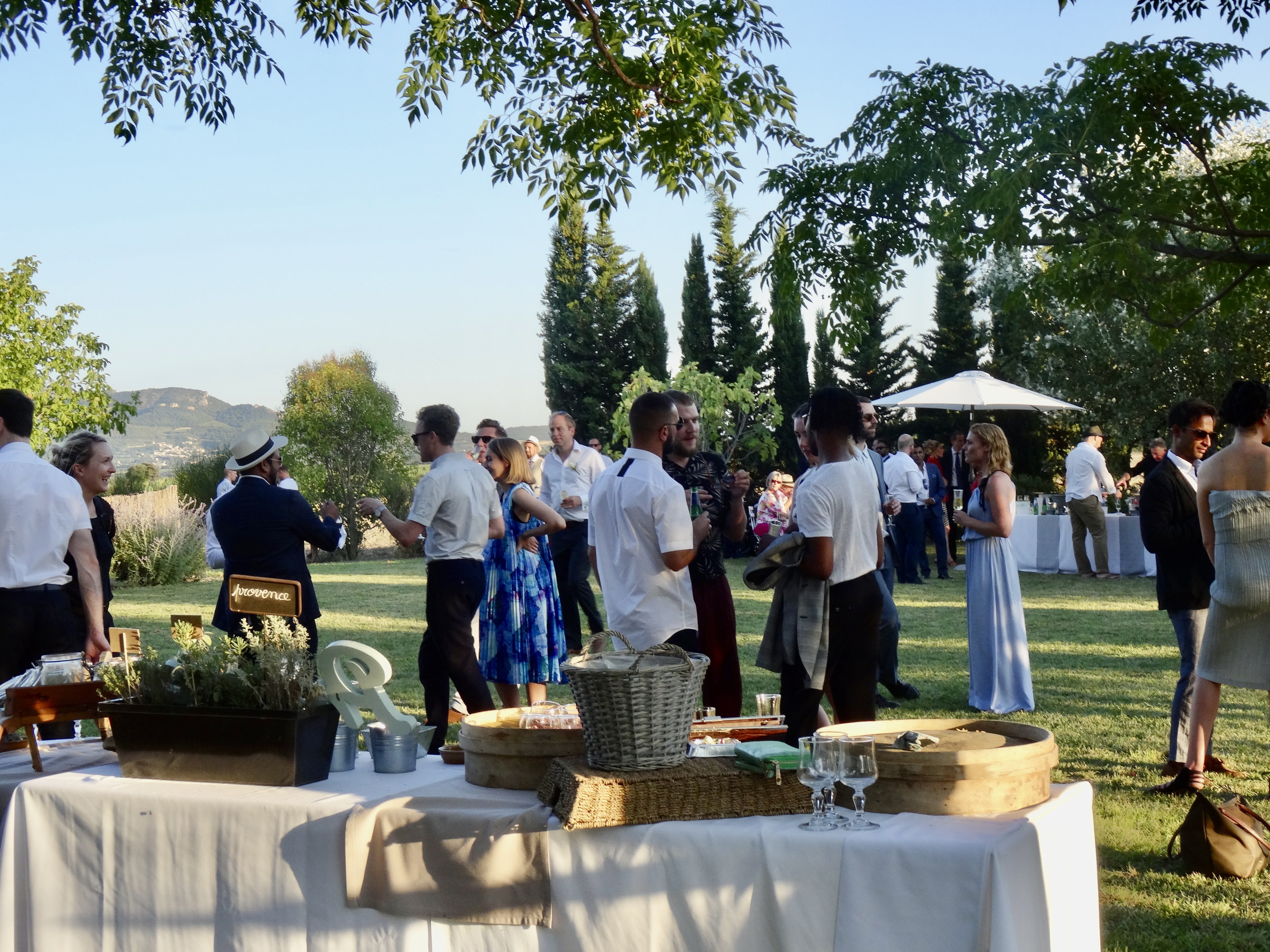 The reception was held at L’Ameillaud in Cairanne (or just over the line into Raisteau).. It’s a vast working vineyard with an old — century or more — farmhouse and also a large contemporary villa that sleeps about 12 or more.. The grounds include a very large meadow, scores of sycamore trees and olive and fig trees. When we first arrived everyone was served a lemony water to cool down (weather wasn’t super-hot.. but it was warm). .. and then we proceeded into the meadow where they were serving an array of appetizers including gazpacho and local cheeses and crudité and miniature everything.. with champagne.. Eventually there were the toasts (including one by Richard).. While we were all having champagne and these incredible small plates.. the children were apparently served dinner (smart).. At about 9 pm (about three hours later).. we all walked to the dinner area.. The space (outside) was set up with two extremely long tables (place settings pre-determined) — about 50 people per table — 25 to each side.. The tables were clearly organized by age — with the 40 and under crowd at one table (with the bride and groom in the center of that table) and the hmmm over 45ers at the other table. I fell to the latter group. The place settings were sparkling… Imagine seeing a row of or a setting of 200 glasses on each table (4 glasses per person x 50 people at each table).. white linen table cloths and settings. At each place setting there was a carefully composed packet with the menu, napkin, silverware, a sprig of rosemary all tied with a simple burlap cord on which was a luggage tag sort of card with the name of the person sitting there — all calligraphy done by the bride,.. On top of this was a beautiful smooth rock (for utilitarian purposes to keep everything from blowing away).. Flowers were all wild flowers placed in all sorts of jars everyone has been saving for months.. and they were placed in the center of each table going the full length.. pretty much touching.. so maybe 250 jars of flowers?? and small tea candles everywhere…
