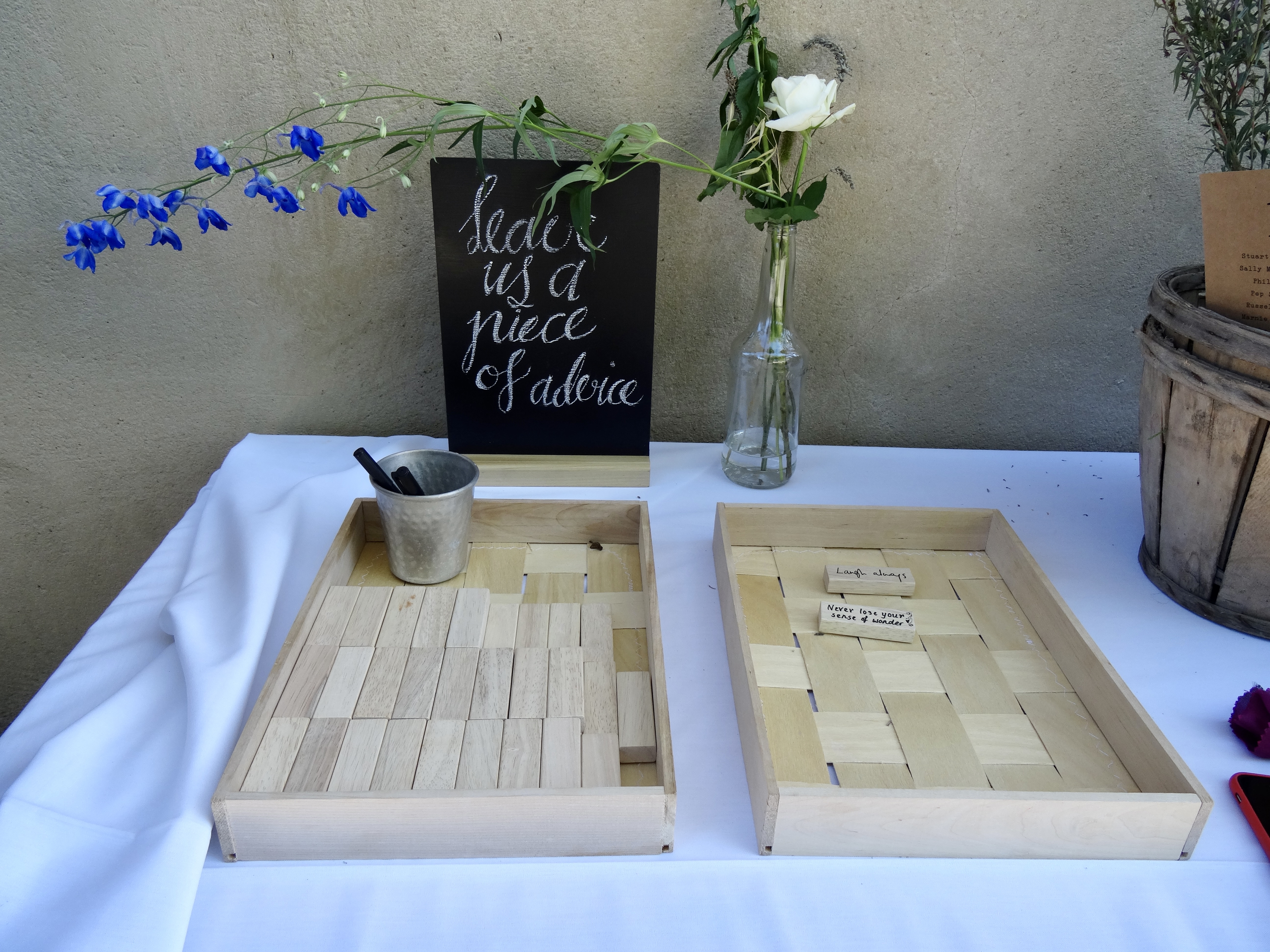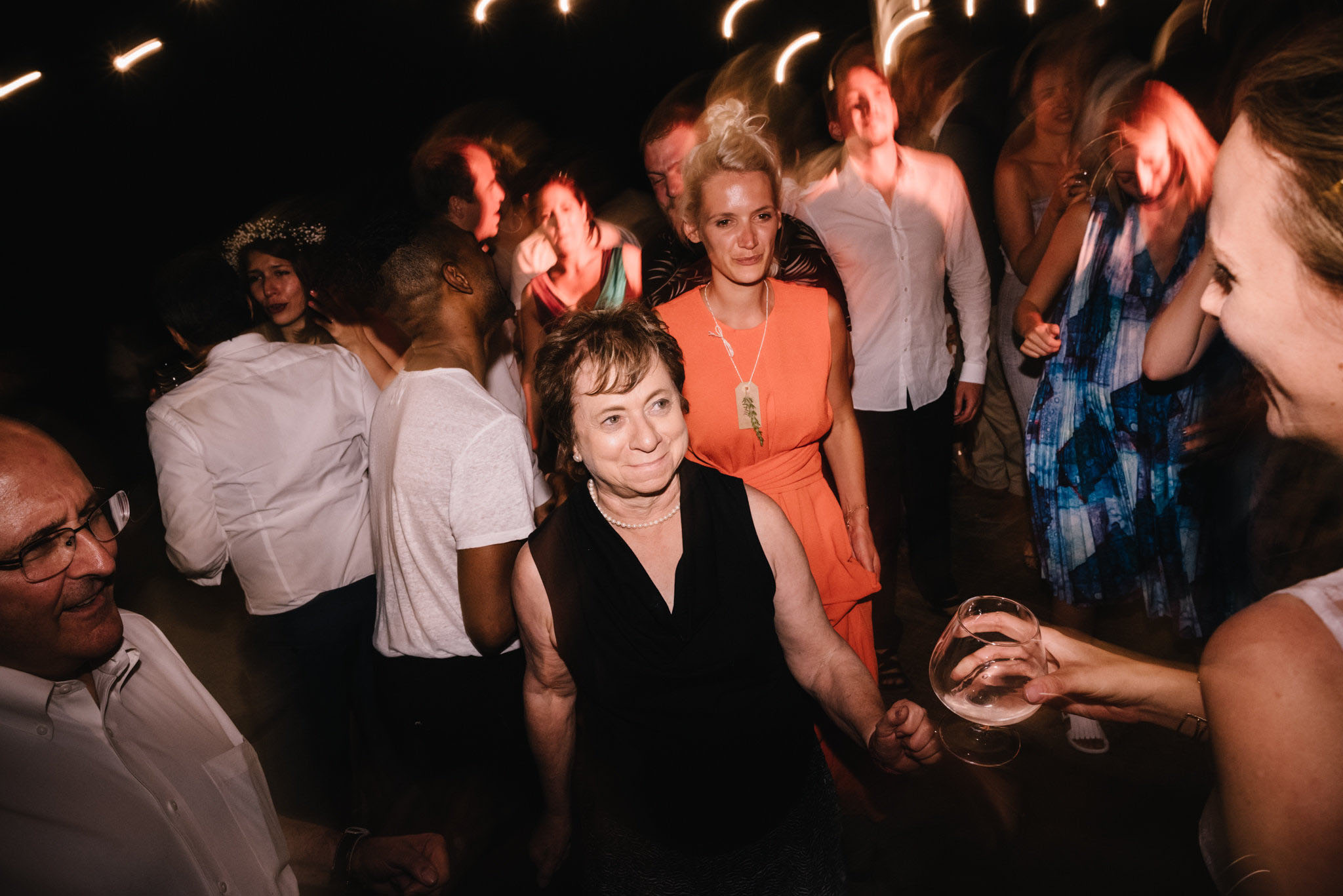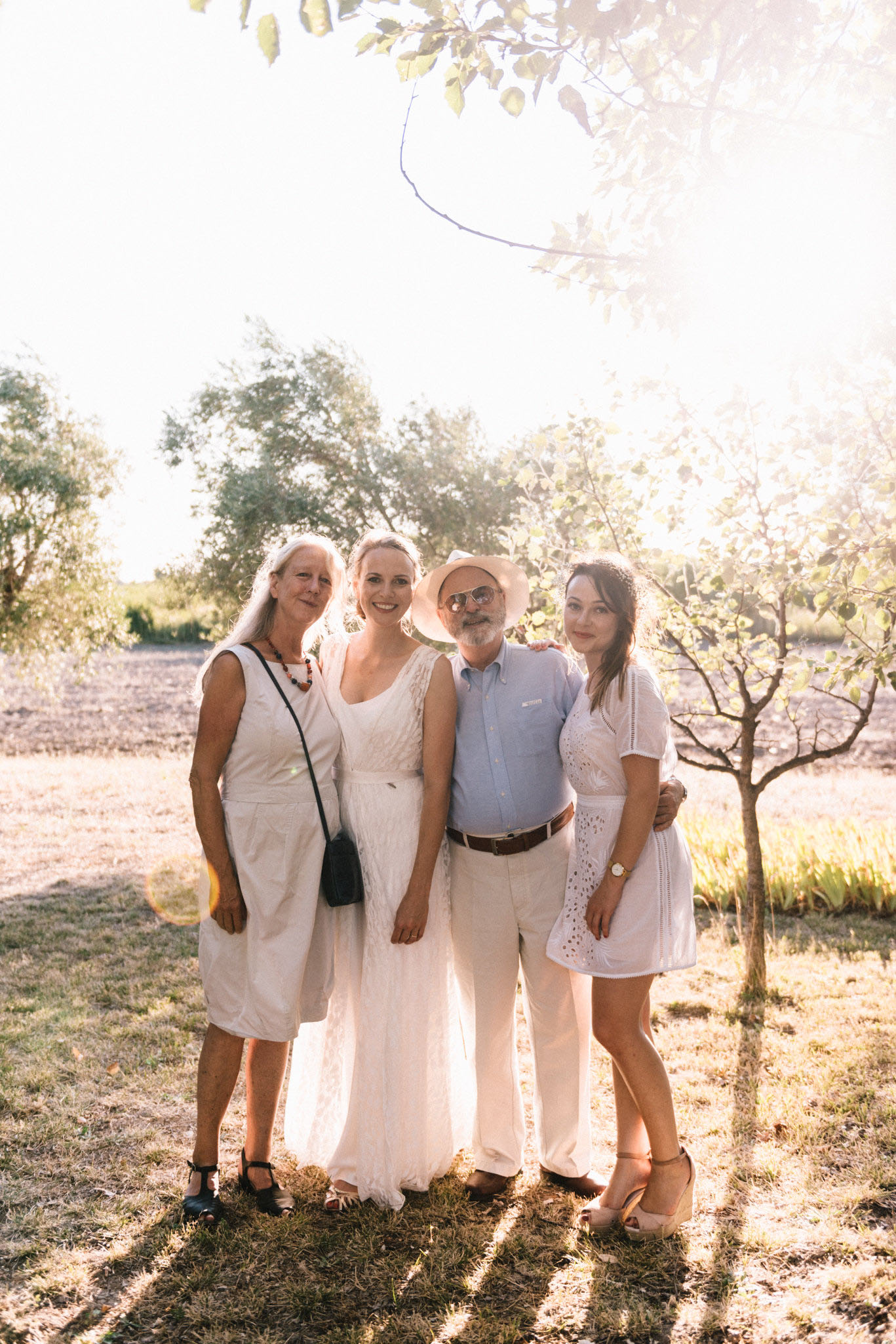 The reception was held at L’Ameillaud in Cairanne (or just over the line into Raisteau).. It’s a vast working vineyard with an old — century or more — farmhouse and also a large contemporary villa that sleeps about 12 or more.. The grounds include a very large meadow, scores of sycamore trees and olive and fig trees. When we first arrived everyone was served a lemony water to cool down (weather wasn’t super-hot.. but it was warm). .. and then we proceeded into the meadow where they were serving an array of appetizers including gazpacho and local cheeses and crudité and miniature everything.. with champagne.. Eventually there were the toasts (including one by Richard).. While we were all having champagne and these incredible small plates.. the children were apparently served dinner (smart).. At about 9 pm (about three hours later).. we all walked to the dinner area.. The space (outside) was set up with two extremely long tables (place settings pre-determined) — about 50 people per table — 25 to each side.. The tables were clearly organized by age — with the 40 and under crowd at one table (with the bride and groom in the center of that table) and the hmmm over 45ers at the other table. I fell to the latter group. The place settings were sparkling… Imagine seeing a row of or a setting of 200 glasses on each table (4 glasses per person x 50 people at each table).. white linen table cloths and settings. At each place setting there was a carefully composed packet with the menu, napkin, silverware, a sprig of rosemary all tied with a simple burlap cord on which was a luggage tag sort of card with the name of the person sitting there — all calligraphy done by the bride,.. On top of this was a beautiful smooth rock (for utilitarian purposes to keep everything from blowing away).. Flowers were all wild flowers placed in all sorts of jars everyone has been saving for months.. and they were placed in the center of each table going the full length.. pretty much touching.. so maybe 250 jars of flowers?? and small tea candles everywhere…