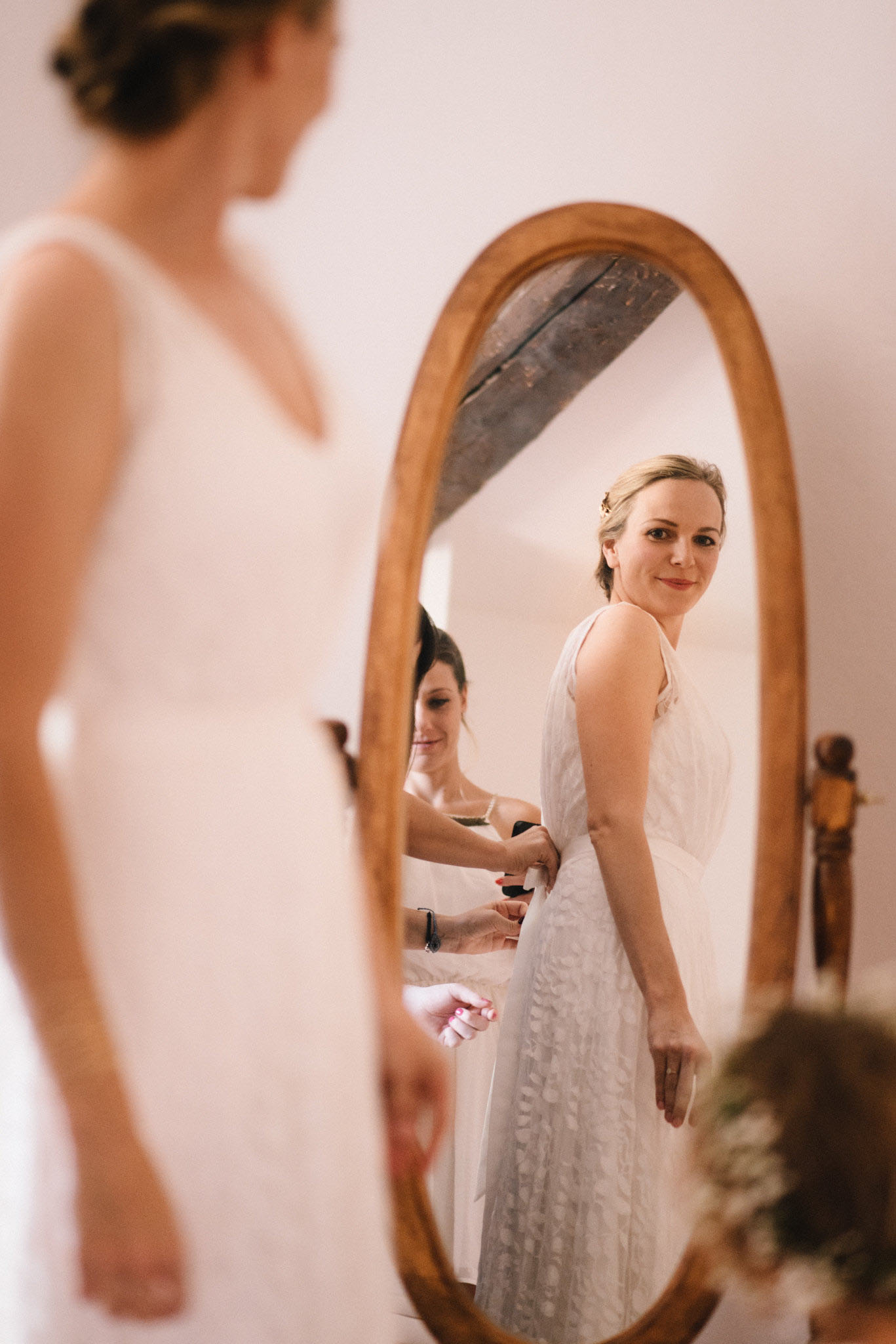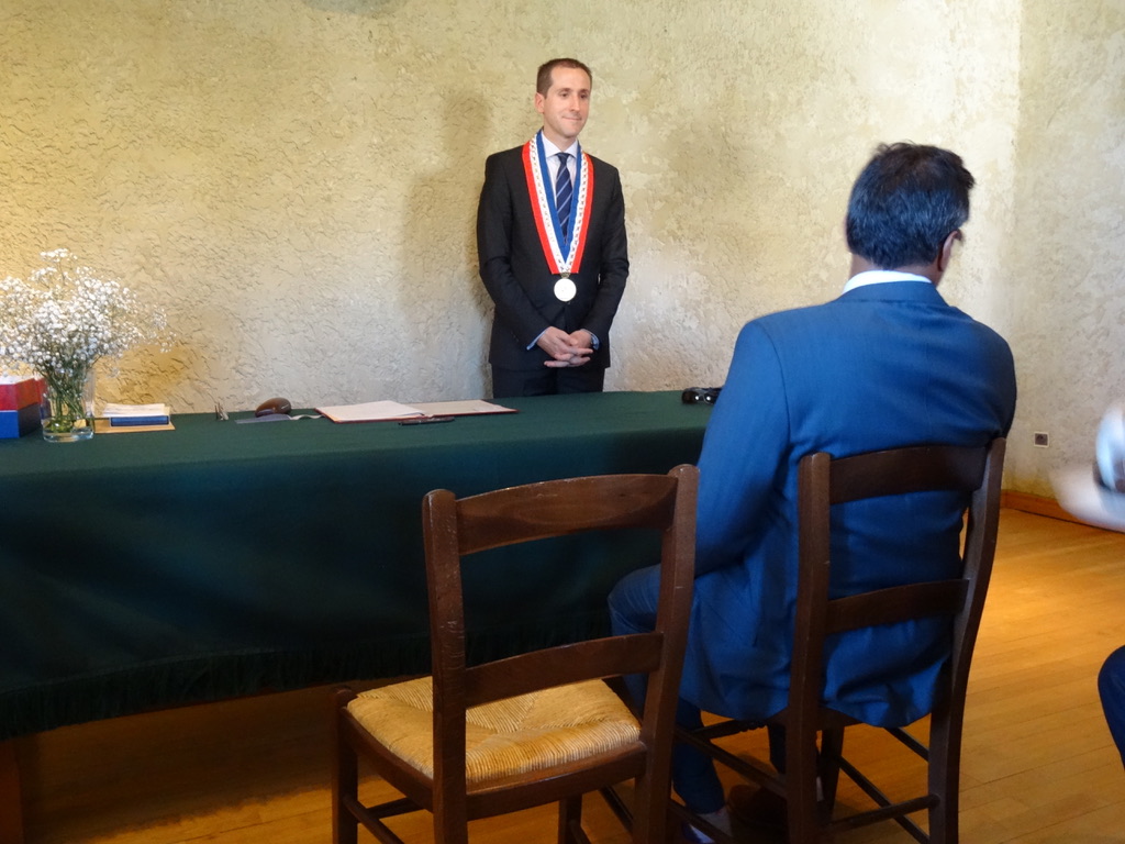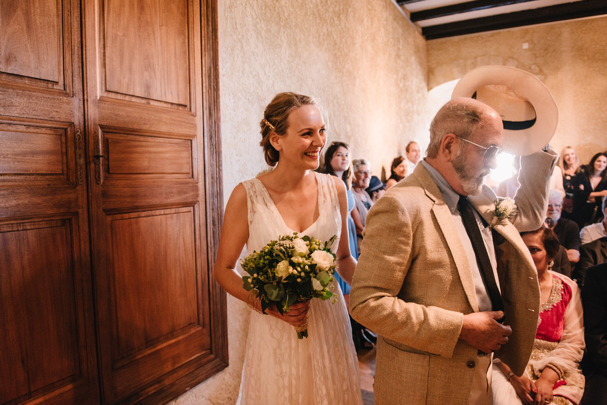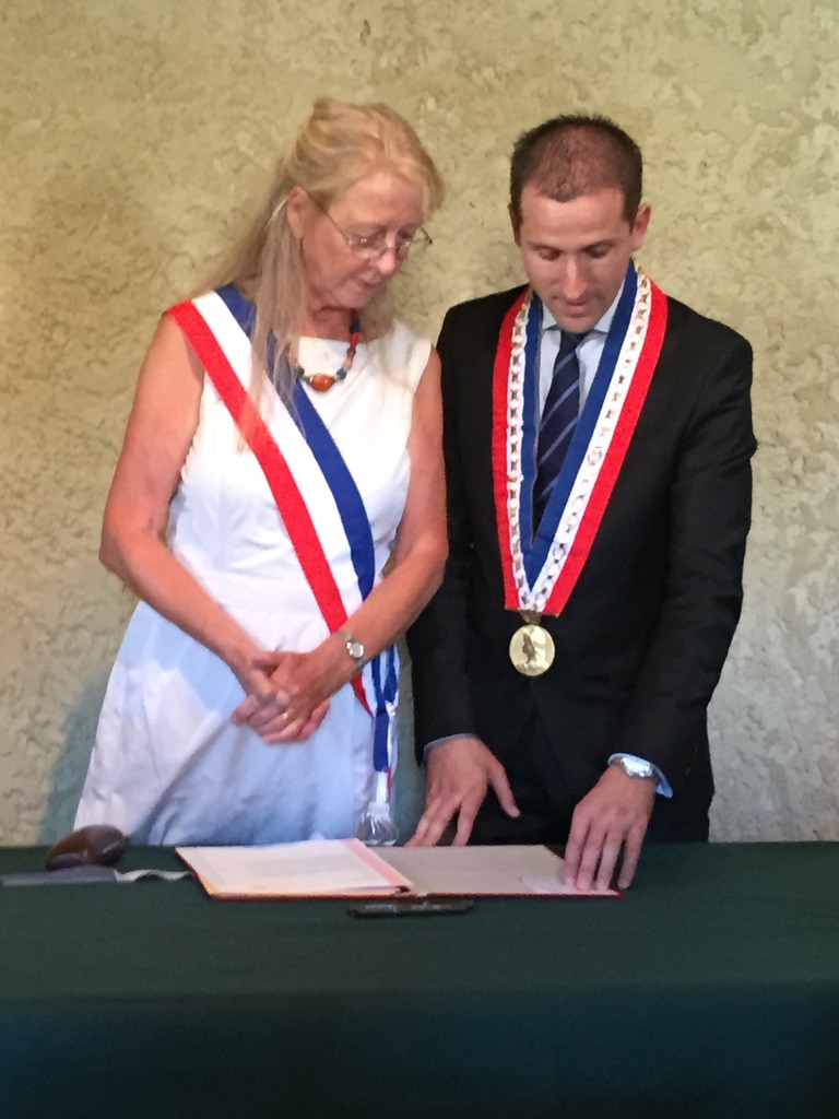 Anyway, the mayor and the other officiant (who in this case was my sister-in-law and also the mother of the bride) wearing the official sashes of the Republique of France (red, white, blue sashes that go across the chest and back.. with the Mayor’s having gold stars and Elizabeth’s being pretty straight forward.. walk up the stairs first.. followed by bride and groom.. and then the parents of the bride and groom and then the wedding party and then all the guests.. But Emma switched it a bit.. and so she came in last and made a grand entrance.. although she had to squeeze between all the people.. I should also note that since the donjon is in the center of the vieux village (with only about 25 houses surrounding it.. ) anyone who wasn’t coming to the wedding was looking out their window to watch the whole thing. The setup is a “desk” at the front of the room with two chairs behind and two in front.. So the groom sits alone on one of the chairs after he comes inside.. The officiants are on the other side of the desk.. The groom’s back is to the audience. Then once the bride comes in, she sits next to the groom. (Until she came, it looked like Hem was facing an inquisition)