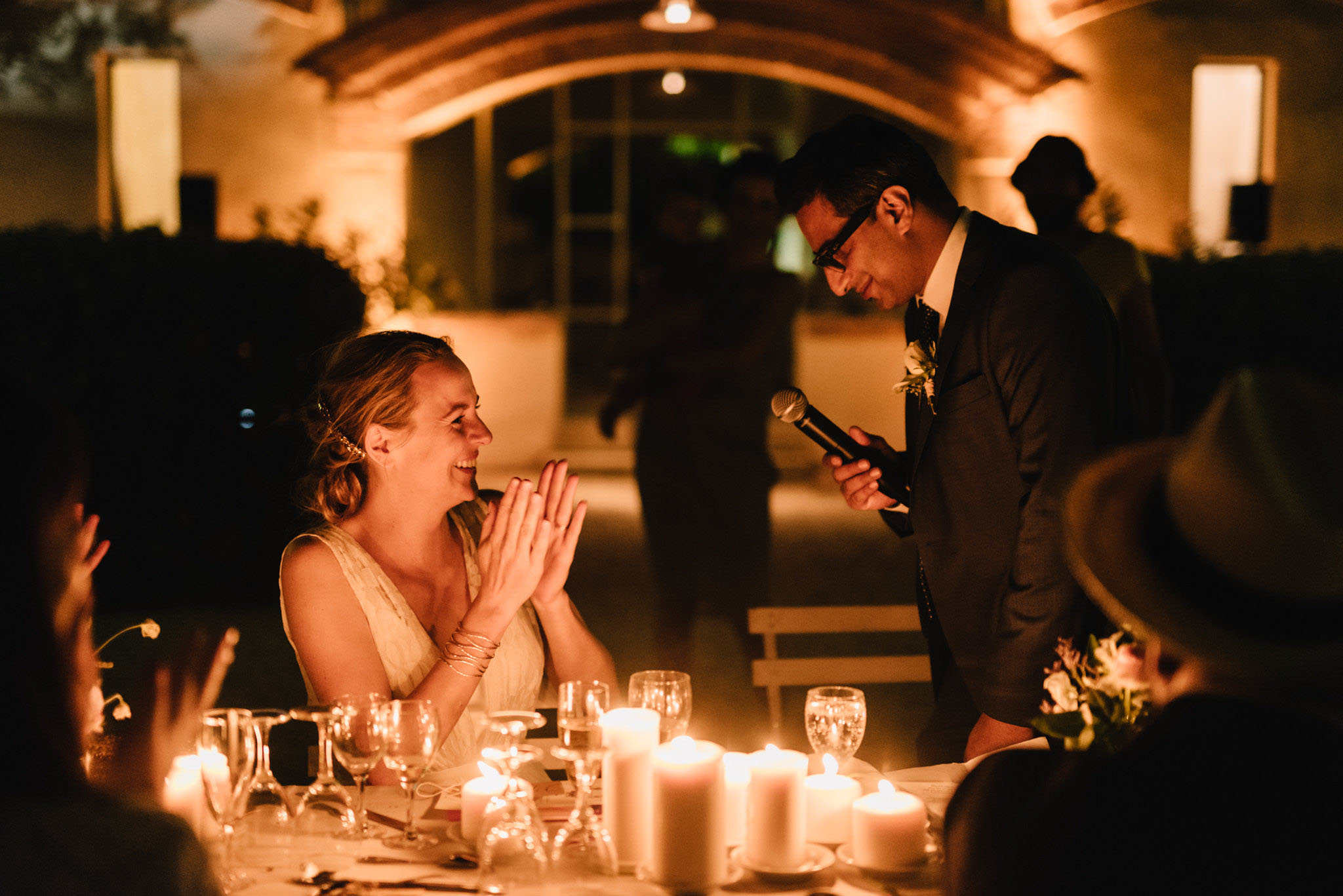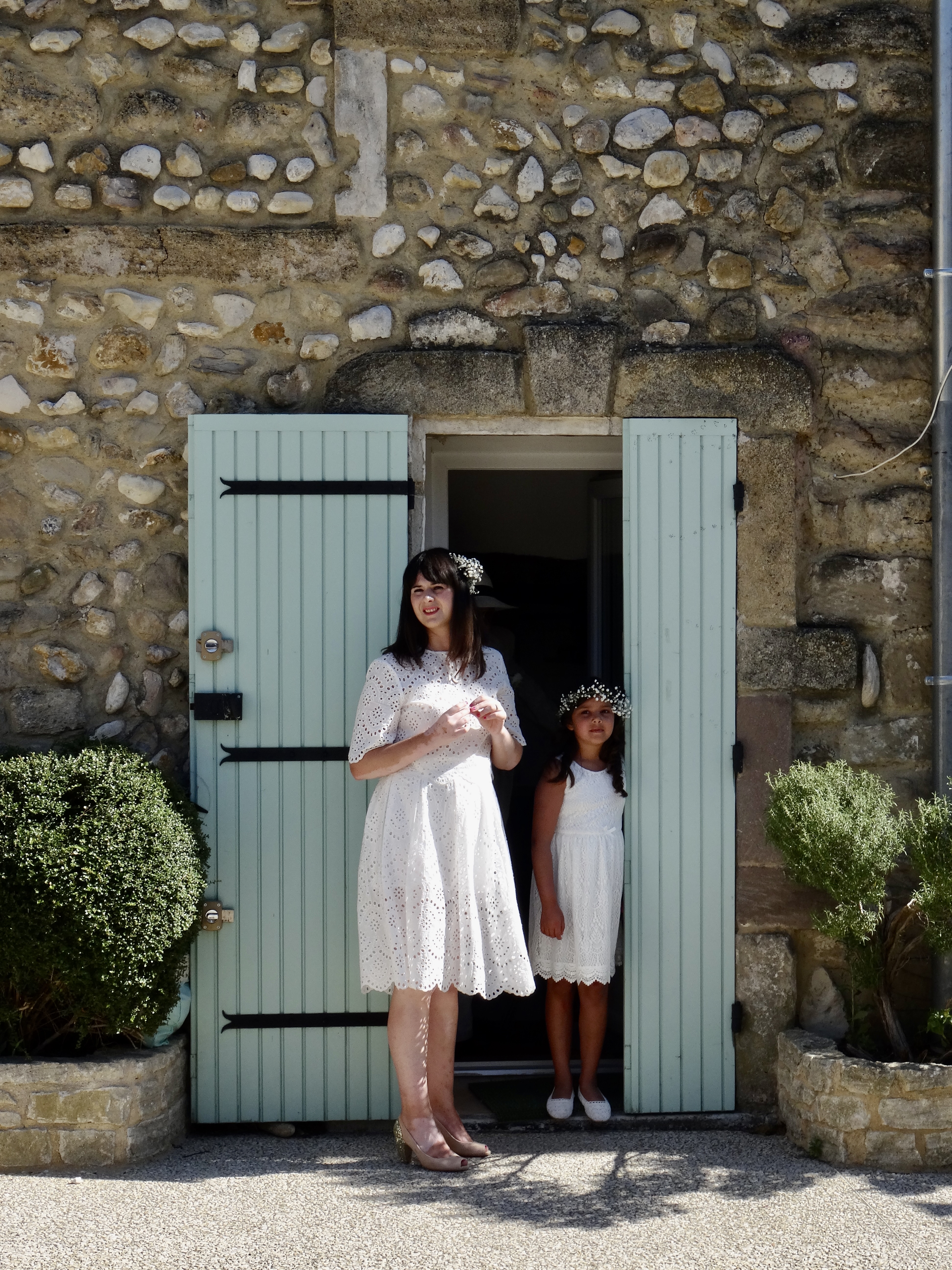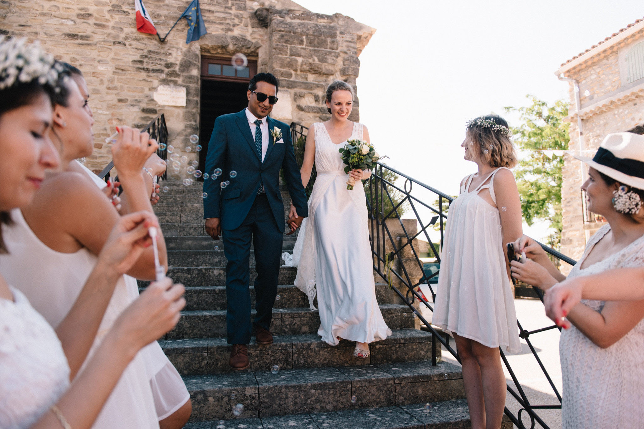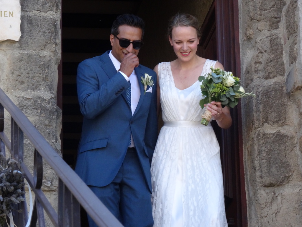 With Emma and Hem seated in their chairs, the ceremony began. It’s quite official with a reading of a whole set of appropriate laws guiding marriage in France — took about 15 minutes. It was read in French and then roughly translated into English. Elizabeth (who I might have explained is an elected member of the town council — apparently a big deal… and interesting that in France property owners can be elected to certain offices even if they are not citizens — take that Donald Trump!) did the entire ceremony bilingually — very impressive and the French commented how totally proficient she is (Elizabeth is British). As the mom, she also got a bit choked up at the start which was totally sweet. There were three questions that required responses and they were said in French.. There was a lot of laughter when Hem said “yes” to the first question which asked (in French, which he doesn’t speak) if he has entered into another marriage contract.. This was all quickly corrected and the subsequent queries were all fine. Then the Mayor read some big declaration — only in French — and then it was over (kiss the bride…) And then the couple was presented with some official “gifts” from the village (which I assume all couples married in Cairanne receive) — a book on the history of the village; a booklet about the history of the donjon; and the “medal” of the city which has Cairanne’s seal on it.. And then they walked out and down.. and actually walked down the hill from the ramparts into the “lower village” (followed by most guests) to waiting buses to chauffeur everyone from the village to the wedding venue — vineyards about 3KM away.. Our car was parked close by so we drove to the venue (because we had some tasks assigned to us, including finishing getting the flowers on the dinner tables — they had been done earlier but it was windy and there was fear that they would fall over).. Oh… they throw lavender and do bubbles.. I was up close, and covered in all that lavender.. smelled good… and it was unexpected.. apparently there were little cups of it lining the steps of the donjon that you pick up as you leave.. but I didn’t know that.
