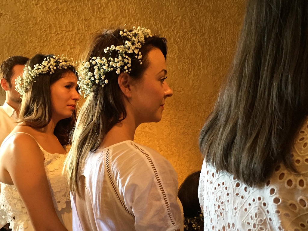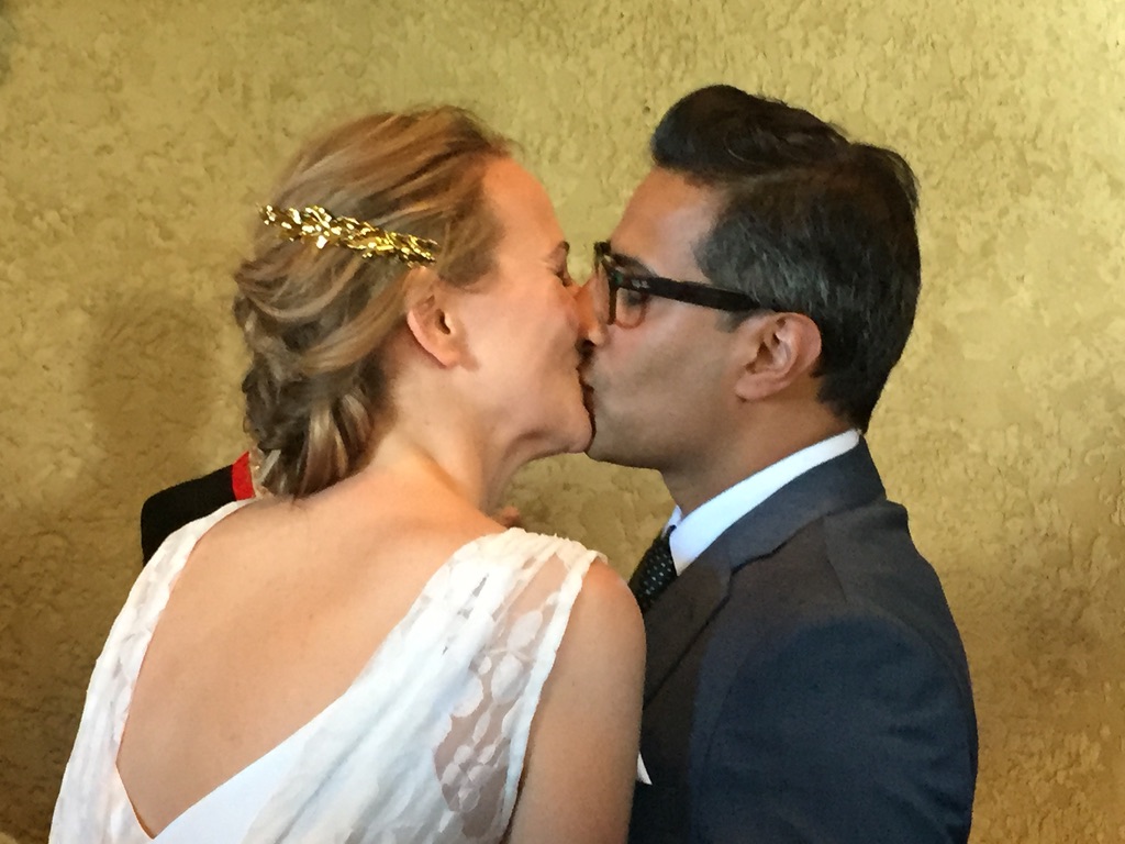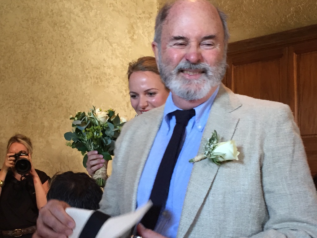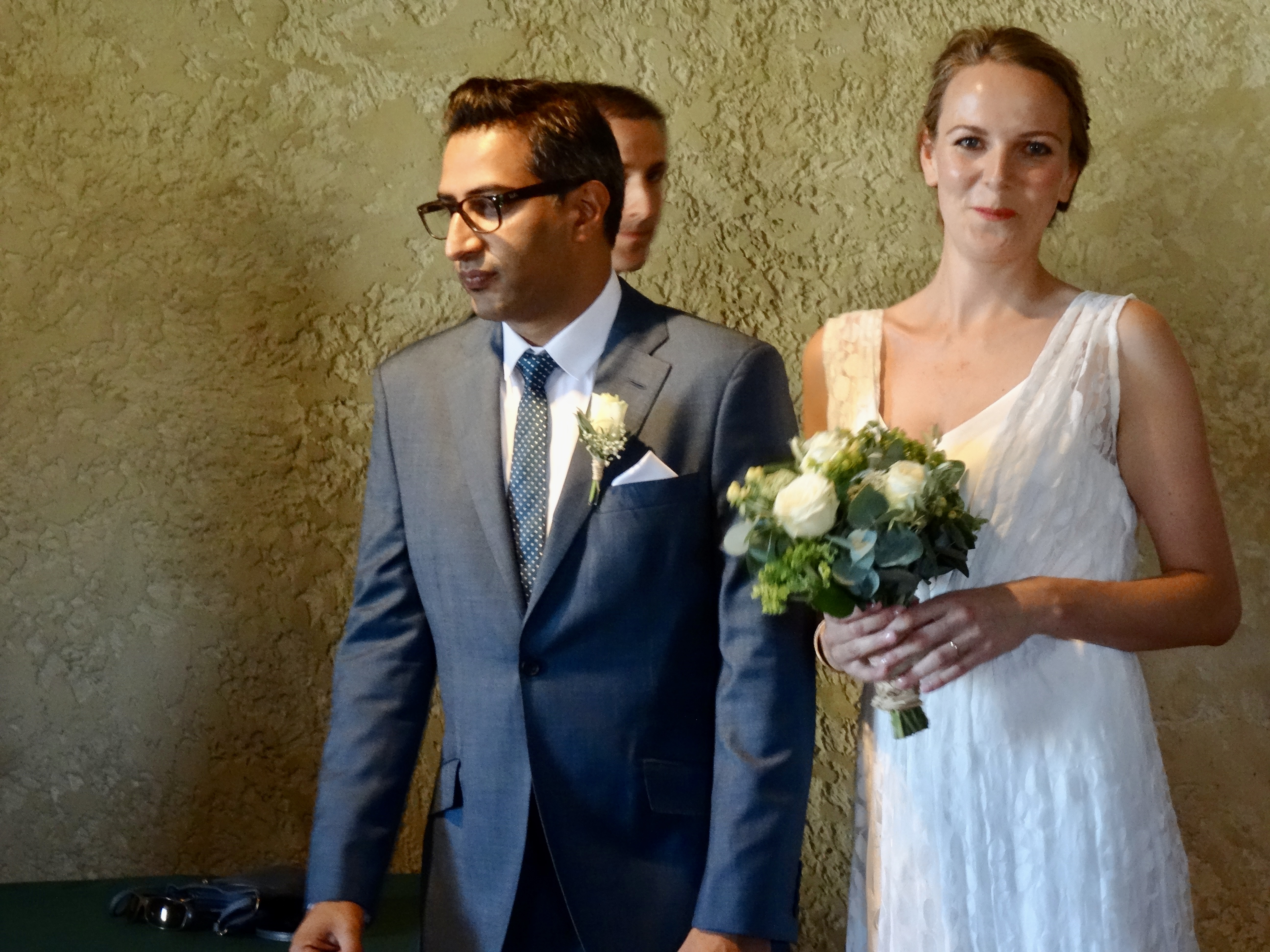 So, Emma is drop-dead gorgeous.. with long blonde hair.. about 5’11”.. and with impeccable taste. The dress — many of you have asked — mmm how to describe… a beautiful just off white sleeveless floor-length silk slip with V-neck front and low v neck back that just falls on the body.. On top of that she had a beautiful lace backwards “vest” that was also floor-length with a simple curved back part that graced the floor a bit. The lace “vest” had a silk ribbon at the waist that clipped in the back .. the lace part formed a V at the back all the way to the waist.. and then below the waist the lace part was totally open so that it fell comfortably to create a great shape.. I’d call the dress elegant, demure, and very sophisticated.. but also very very simple.. She had two gold hair clips flanking her hair that was pulled back and sort of braided into a loose long bun.. also wore gold sandals .. Oh the groom.. he wore a very sharp sort of dark greenish-blue suit with a great small polka dot tie that had just the right amount of blue and green.. Everything.. totally figured out.
