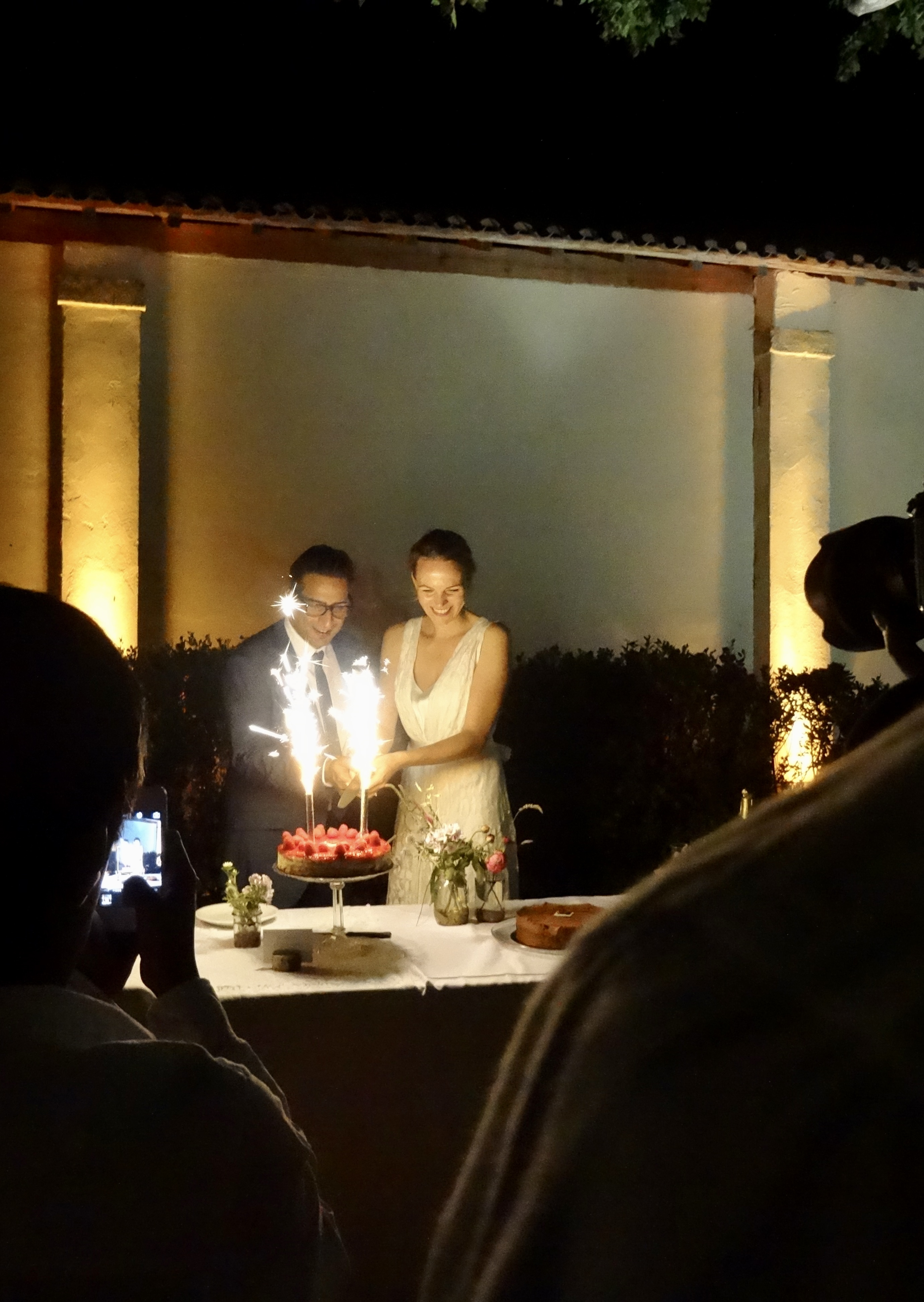 Dinner menu: spit roasted lamb (which you could see them cooking earlier), baked new potatoes, seasonal vegetables including eggplant, tomato, etc., mesclun salad.. and bread… accompanies by local white or local red wines (or champagne).. This was followed by a wonderful cheese spread on each table (in many places) with fig jam and walnut bread.. Then we finally got up to stretch just long enough to walk to the dessert table where about 8 different amazing cakes and tarts were being served.. starting with the first slice cut by Hem and Emma.. with all sorts of very large sparklers going off everywhere..