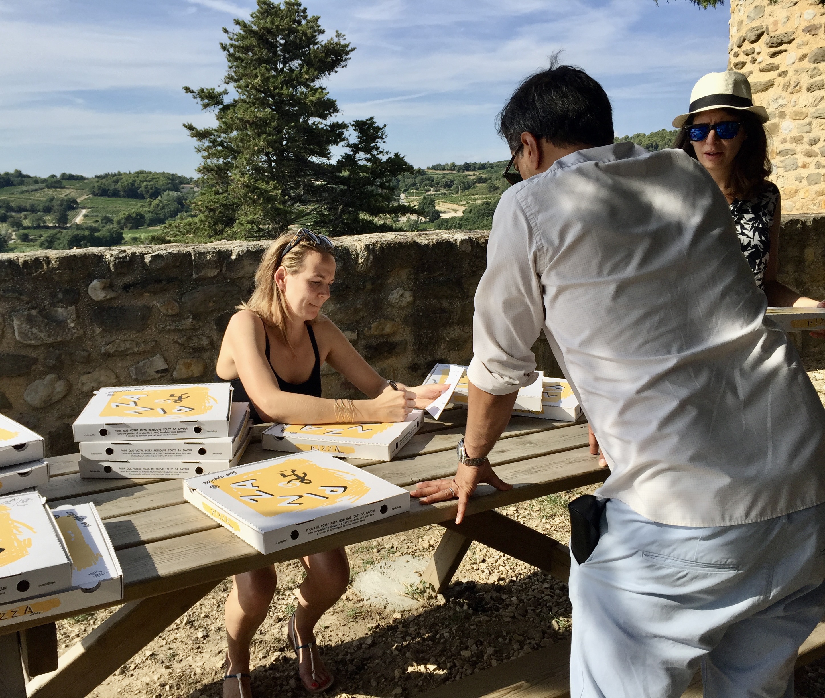 Did a little work and then headed up to the park in Cairanne (inside the ramparts, just below the old church) where everyone from the wedding was having an early evening picnic — pizzas on the grass with lots of salads. It was sort of funny to be sitting in this amazing setting having pizzas.. but so be it. There were also fierce games of Baton going on (heavy silver balls that you throw and try to get the closest to a marker).. .It’s a good game for big crowds since pretty much everyone including kids can do it.. obviously it requires skill to do it well.. but everyone can play. For a while Richard and Elizabeth’s dog (Gatsby) was meandering around without his leash.. but he’s old and was easy to bring back to the fore.