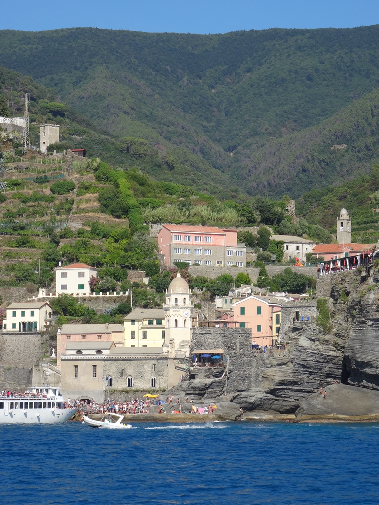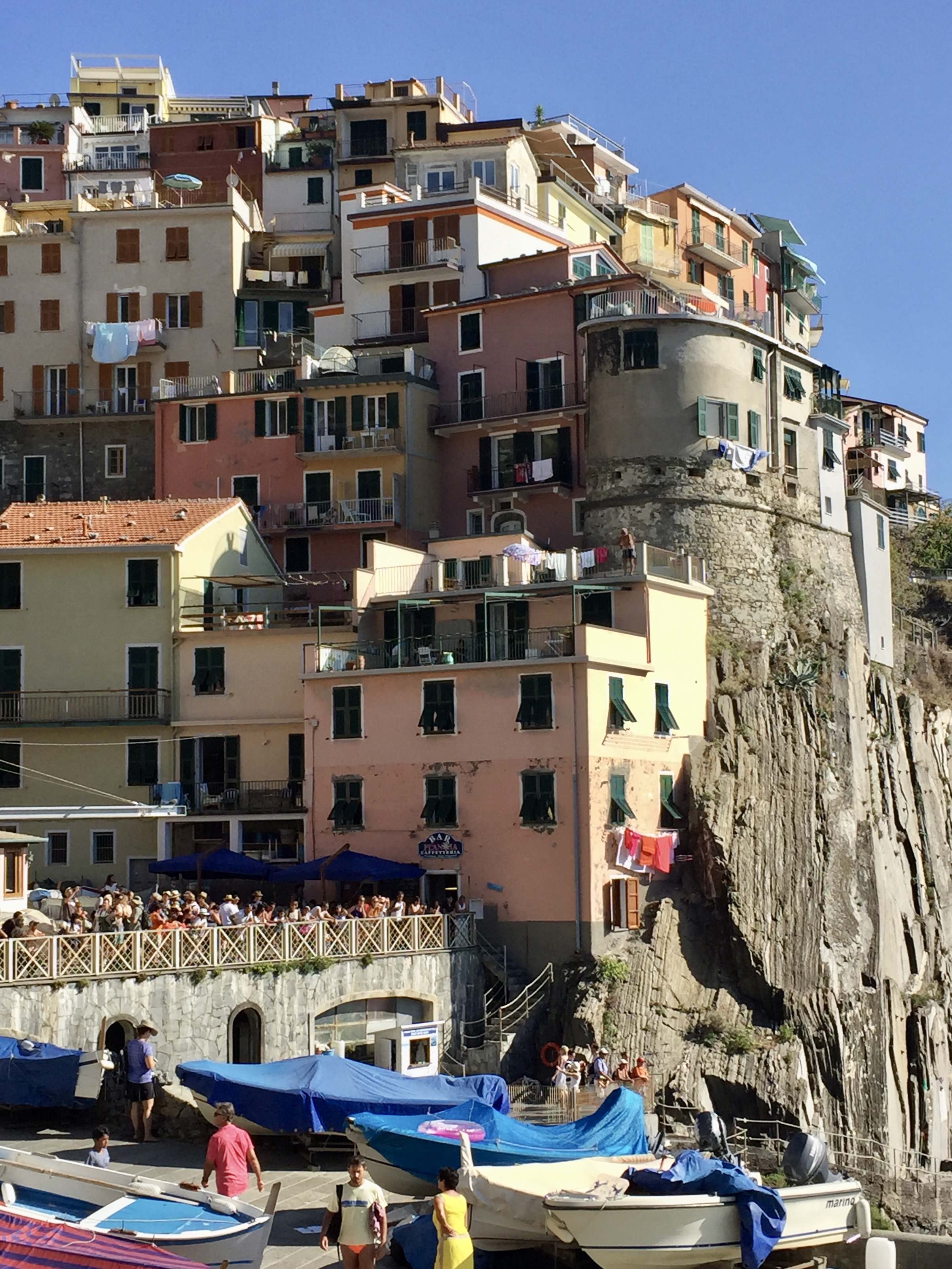 By now, Mike was more than frustrated.. Me, I’m just going with the flow! Anyway, the next train from Monterosso to Manarola was not for 2 hours (siesta time?), so we decided to see if we could find a boat to go from Monterosso to Manorola. There was a boat in an hour. Decided that would be better than the train. So off we went by ferry (again no one really sure which ferry goes in which direction and everyone giving different answers to the question. Ferry was about 45 minutes and included about 3 stops. Gave us good views of the villages. The ferry was pretty packed also. Made it to Manorola which is the prettiest town of all. By the way, disembarking from the ferry is quite a scene. There’s a long line of folks trying to get onto the ferry. They are stretched out along a very narrow winding path going downhill. On their right is a very steep drop to the Mediterranean.. and there isn’t any railing. The path is probably no more than 4 feet wide. Those of us getting off the ferry move alongside them but we are hugging along the rocks of the cliff — sharp, unexpected juttings, and attempting to navigate carefully so as not to move too far left or you might push one of those waiting to board right off the cliff! Italian planning at its best.