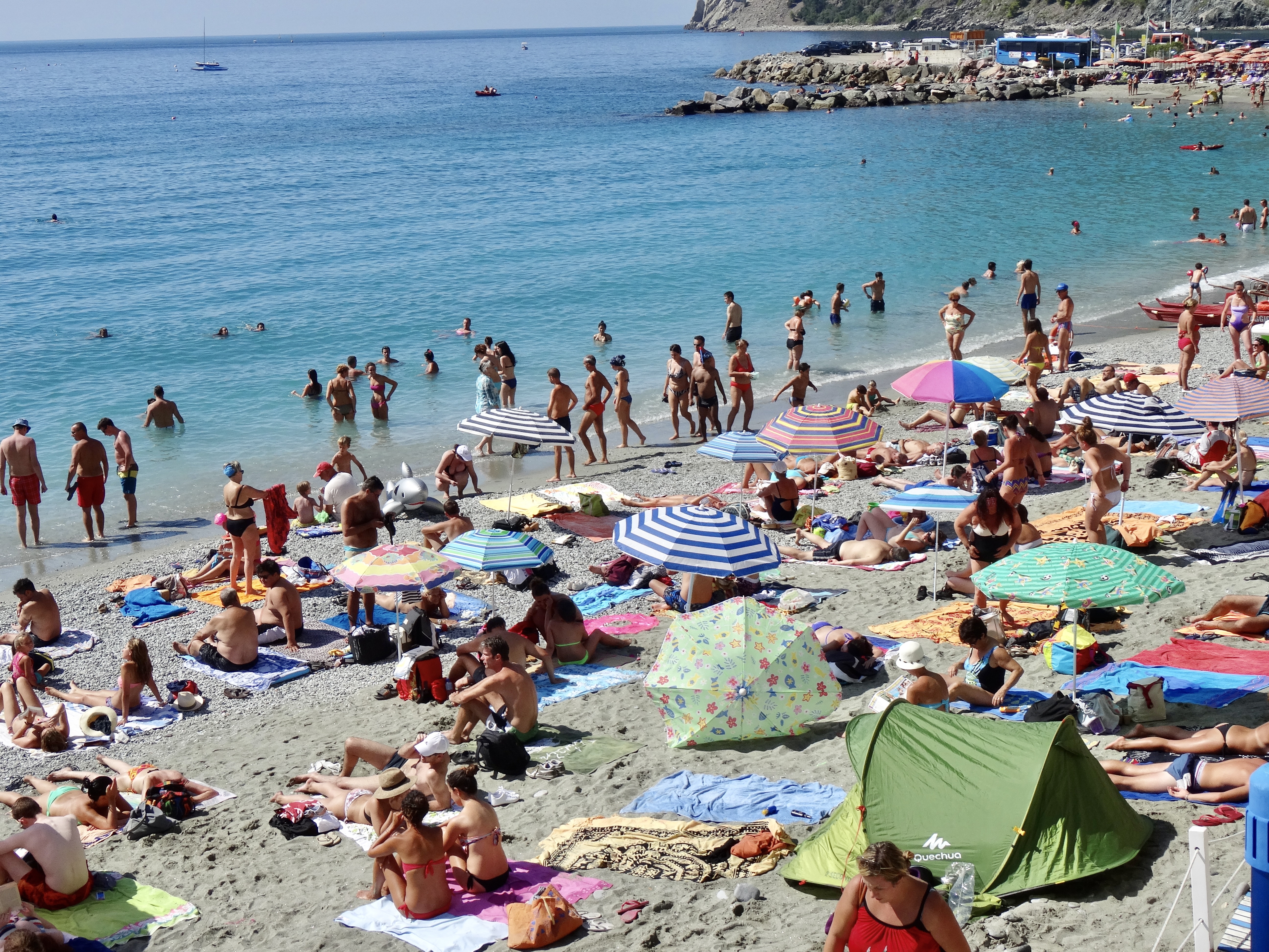 While I think I would recommend going to the Cinqueterra — I’d suggest going in the fall — like November (although it’s probably rainy season) or maybe spring (April?). I would not suggest going any time between May and September. Too hot, too many people. I’m sure many of the beach shops close in the winter and that would be good as far as I’m concerned. The sun umbrellas that pack the beaches make for a great “graphic” but I cannot imagine that it is pleasant to be so body-to-body on the beach. And, I would add that I think I’ve visited villages that are more beautiful than the Cinqueterra (like the Amalfi Coast or the hilltop villages of Italy that are not at the coast — I guess it is the coast and the swimmable beaches that bring the crowds; I’d also rather return to the beautiful “white” villages of Spain.. and more).. I suppose that if you take the hike in the hills there are streams and rivers and you can swim and be more remote.. or if you really love the beach, then maybe it’s OK.. Just not my most favorite place.. I’ll take Turin over this.