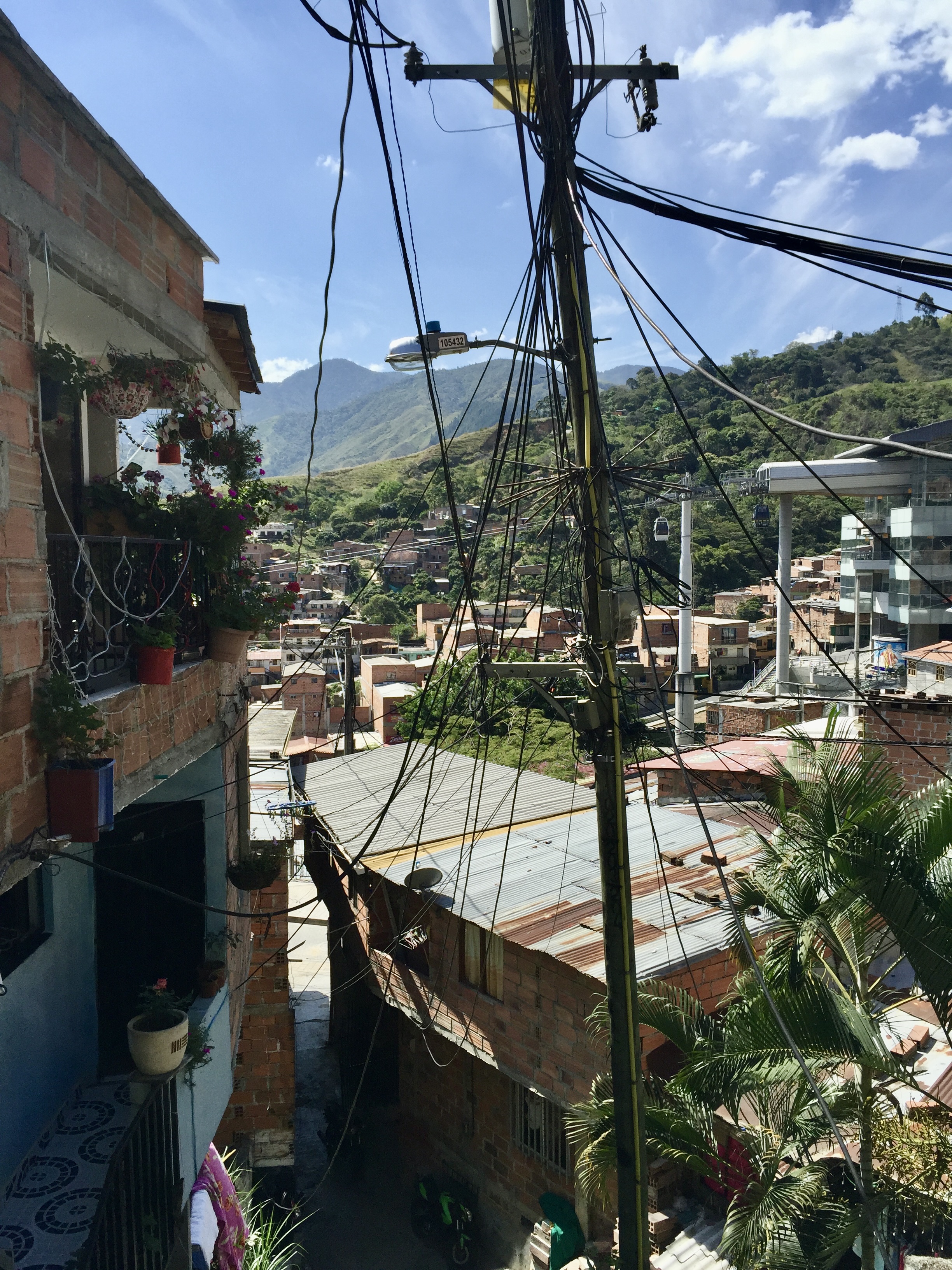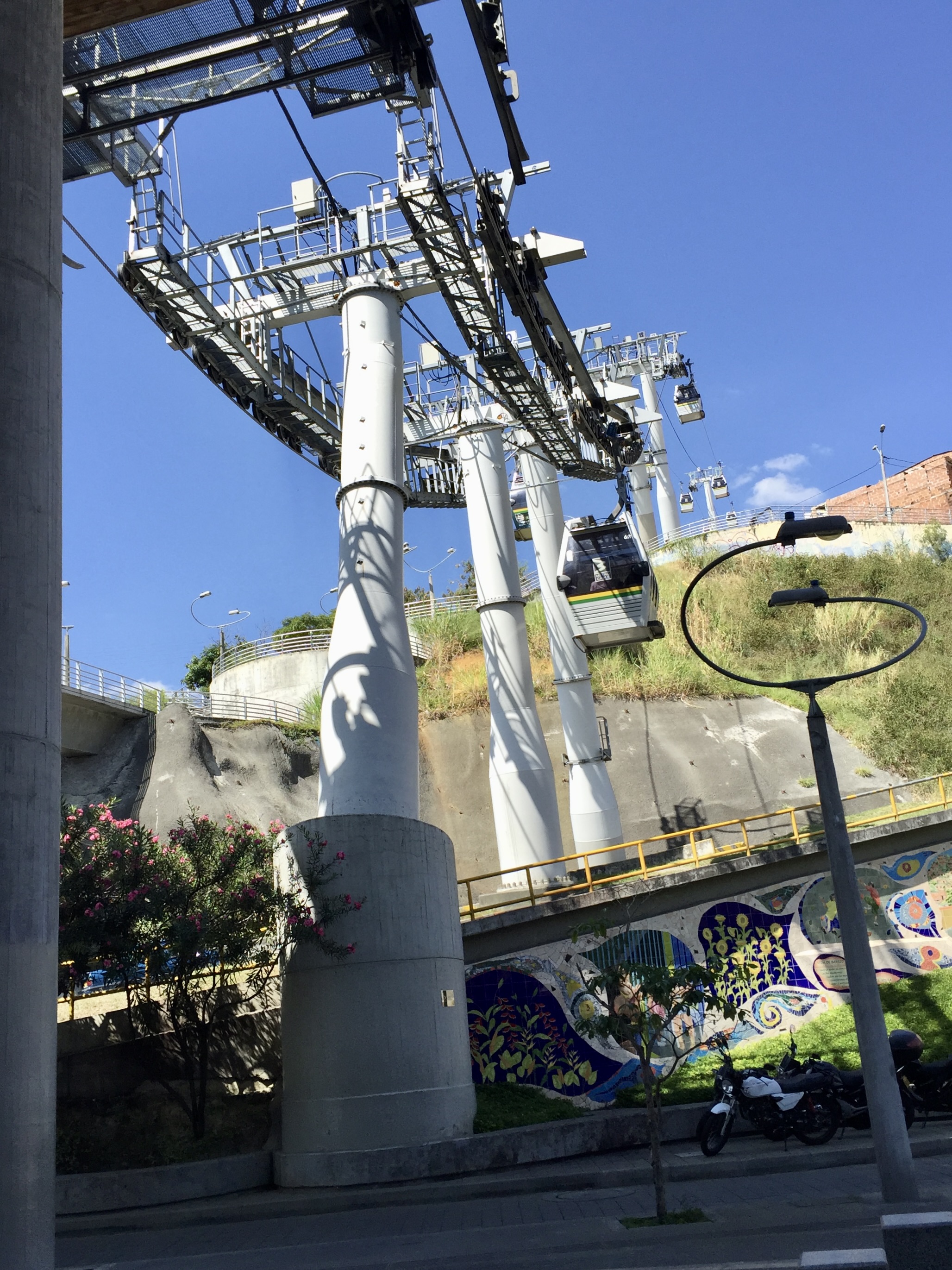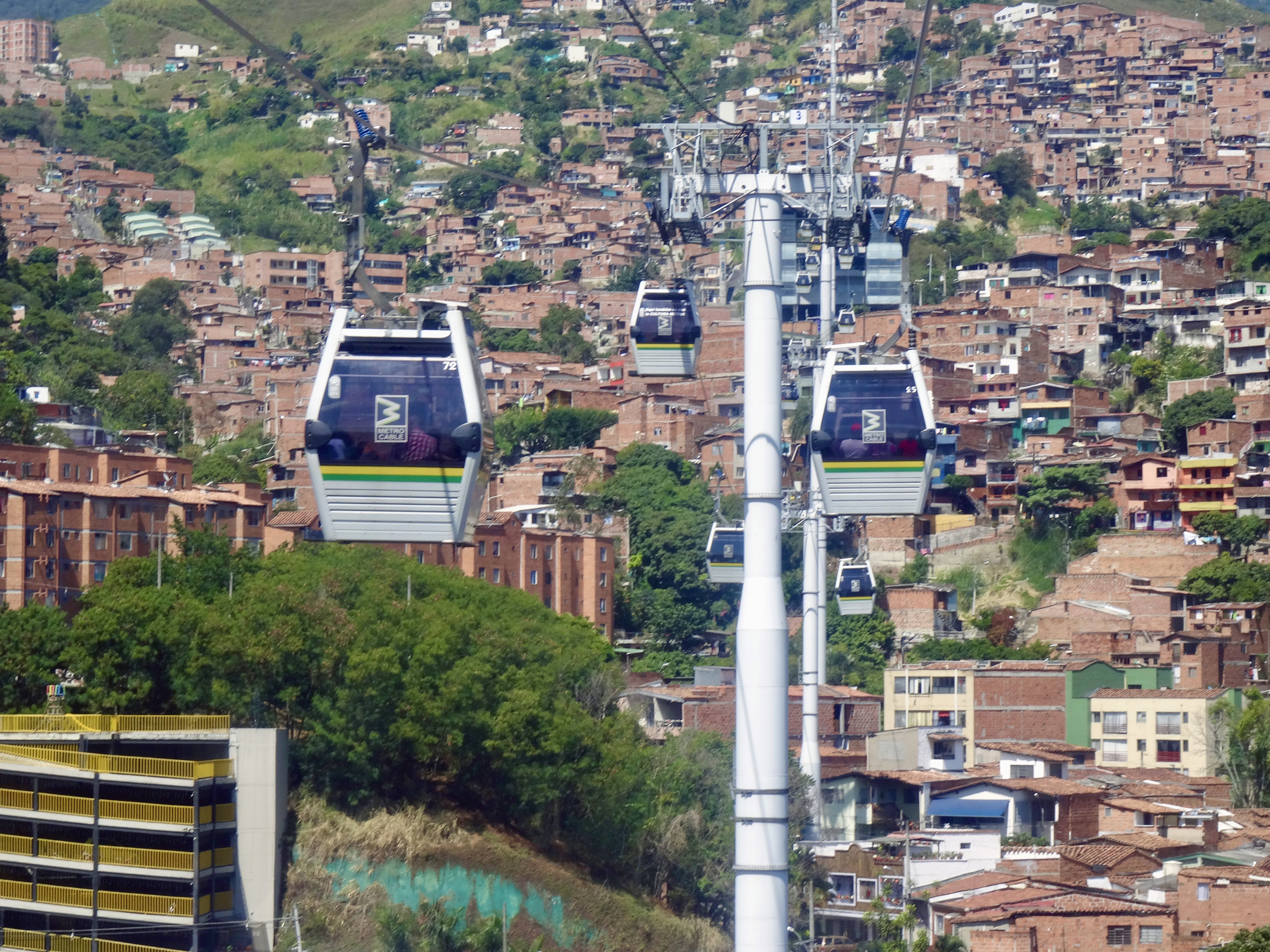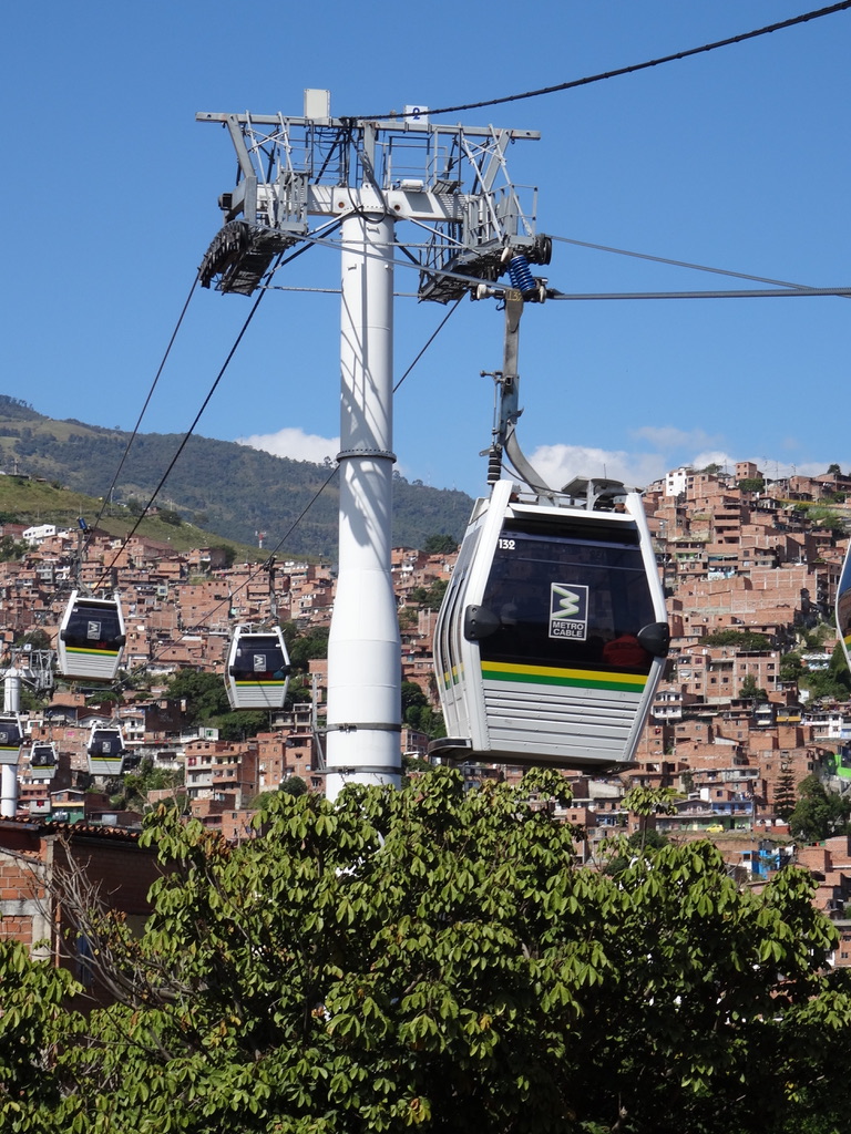 As I mentioned in a previous note, Medellin sits in a deep lush valley at about 5,000 feet high, with a river that literally bisects the city. The hills that create the valley are covered with former squatter settlements that have been formalized and now streets are paved and these neighborhoods (which house about .75 million people) are served by buses and electricity and all the basic needs. There are schools and libraries and parks. Most of these dwellings that hug the hillside are concrete frame with brick in-fill (basic housing, mostly self-built, lots of add-ons over time). Anyway, about a decade ago, the city installed an amazing gondola lift system (they have three distinct lines) integrating the city proper and its metro system with the marginalized residents living in the hills and it’s very inexpensive to use them. They say it is the first cable-propelled transit system in South America. It is totally integrated into the citywide metro system, including ticketing (Once you are on any train you can continue on without purchasing another ticket, including the cable car.) My research says that the cable system carries 30,000 people per day.