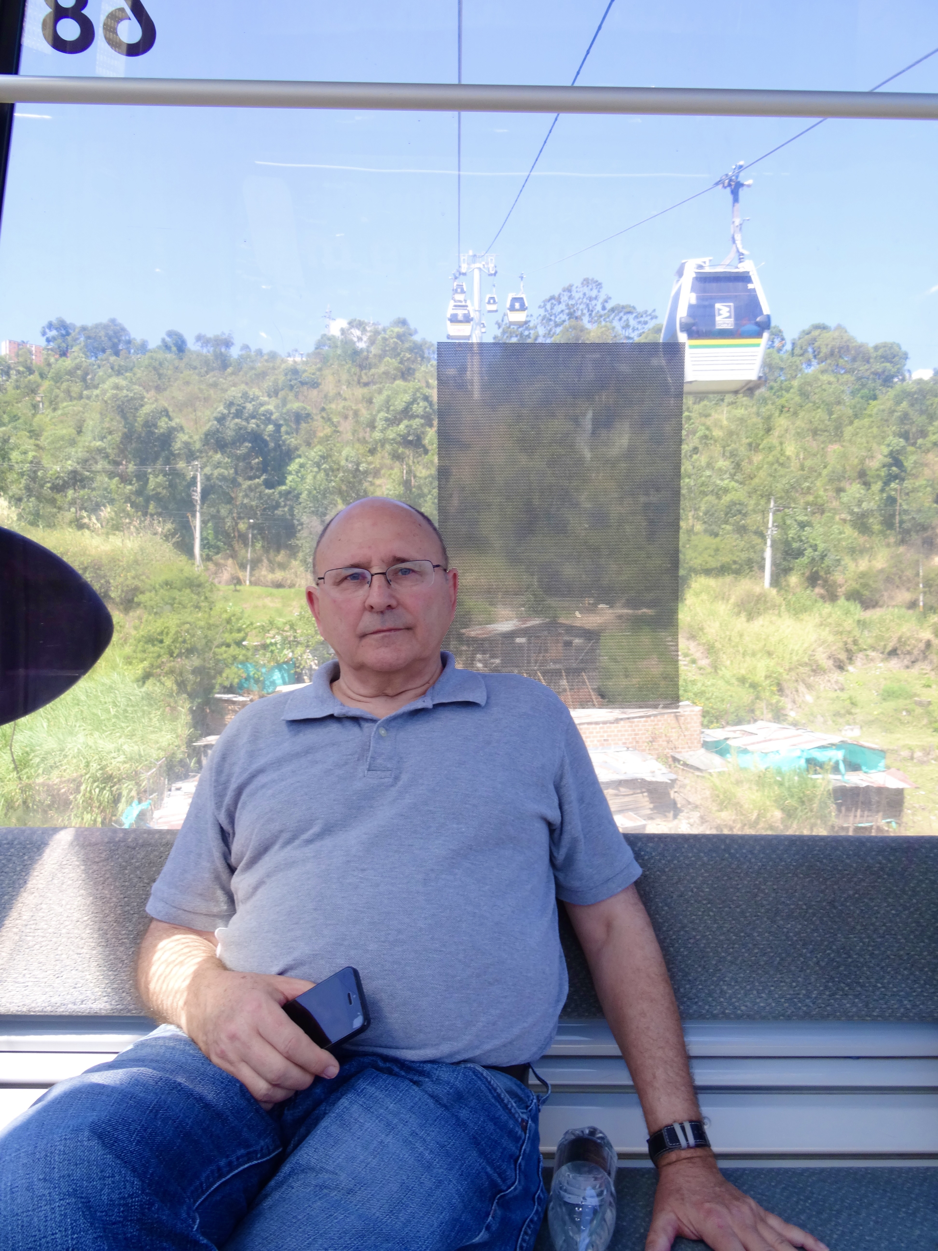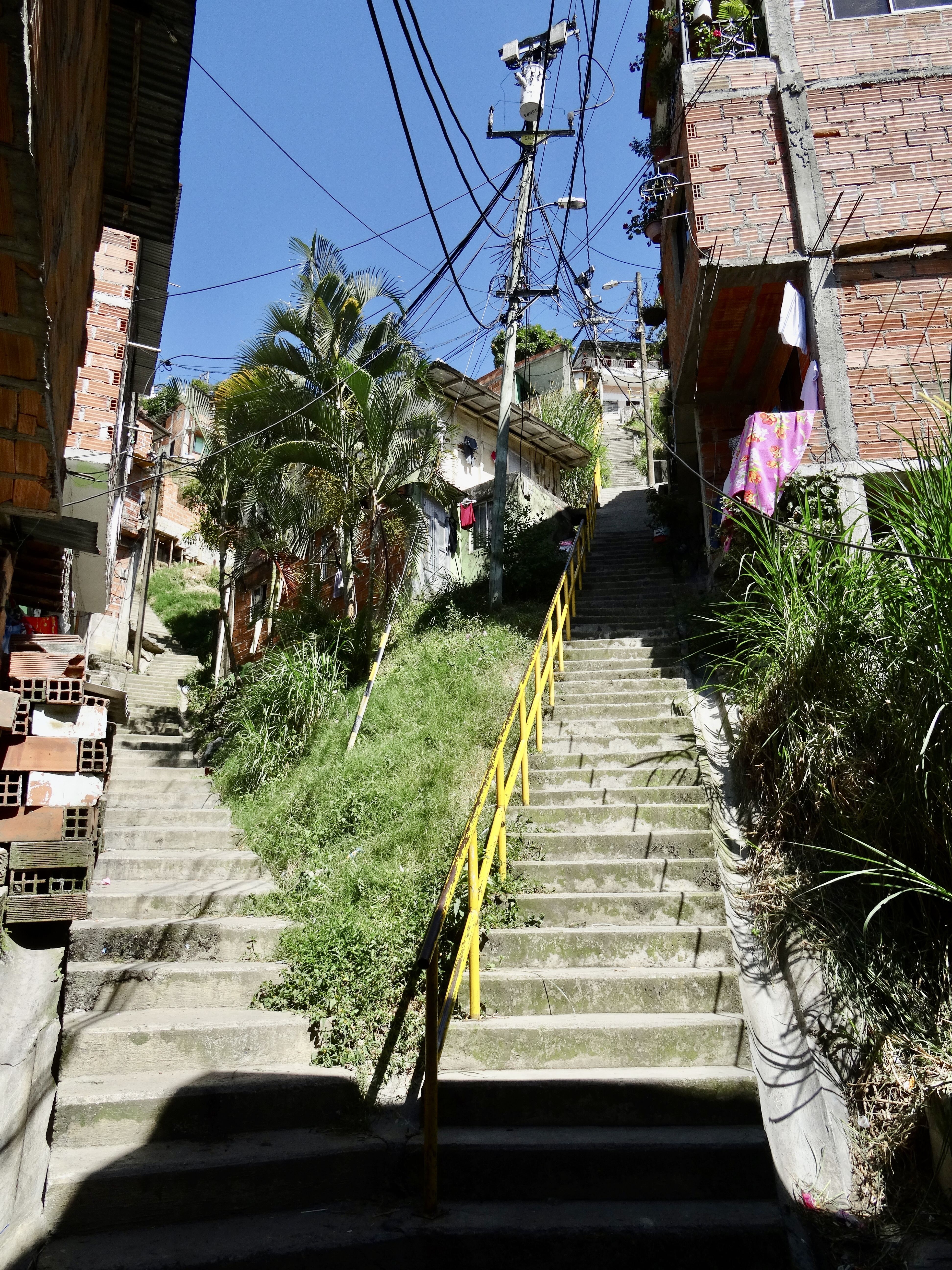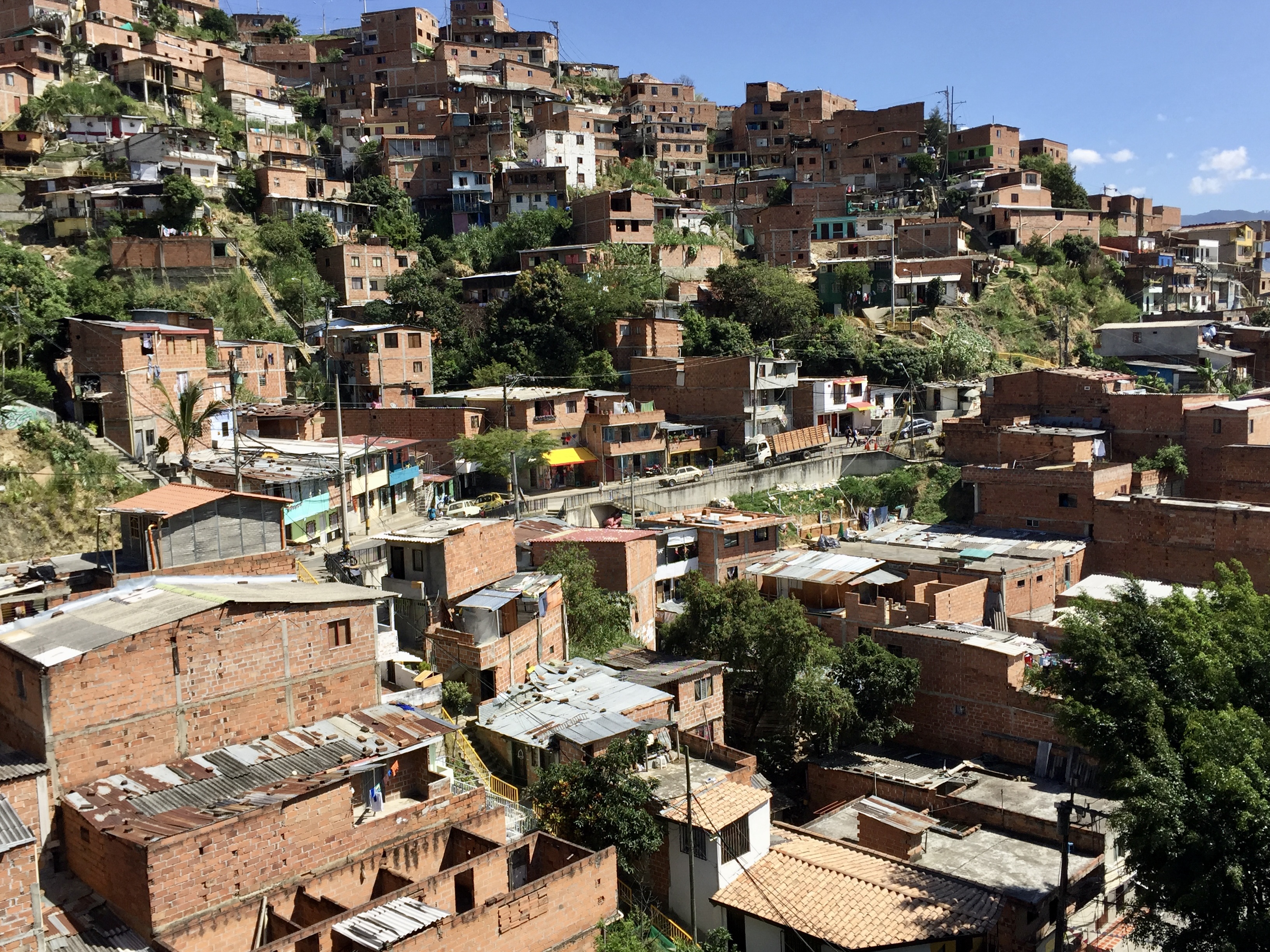 As I mentioned in a previous note, Medellin sits in a deep lush valley at about 5,000 feet high, with a river that literally bisects the city. The hills that create the valley are covered with former squatter settlements that have been formalized and now streets are paved and these neighborhoods (which house about .75 million people) are served by buses and electricity and all the basic needs. There are schools and libraries and parks. Most of these dwellings that hug the hillside are concrete frame with brick in-fill (basic housing, mostly self-built, lots of add-ons over time). Anyway, about a decade ago, the city installed an amazing gondola lift system (they have three distinct lines) integrating the city proper and its metro system with the marginalized residents living in the hills and it’s very inexpensive to use them. They say it is the first cable-propelled transit system in South America. It is totally integrated into the citywide metro system, including ticketing (Once you are on any train you can continue on without purchasing another ticket, including the cable car.) My research says that the cable system carries 30,000 people per day.