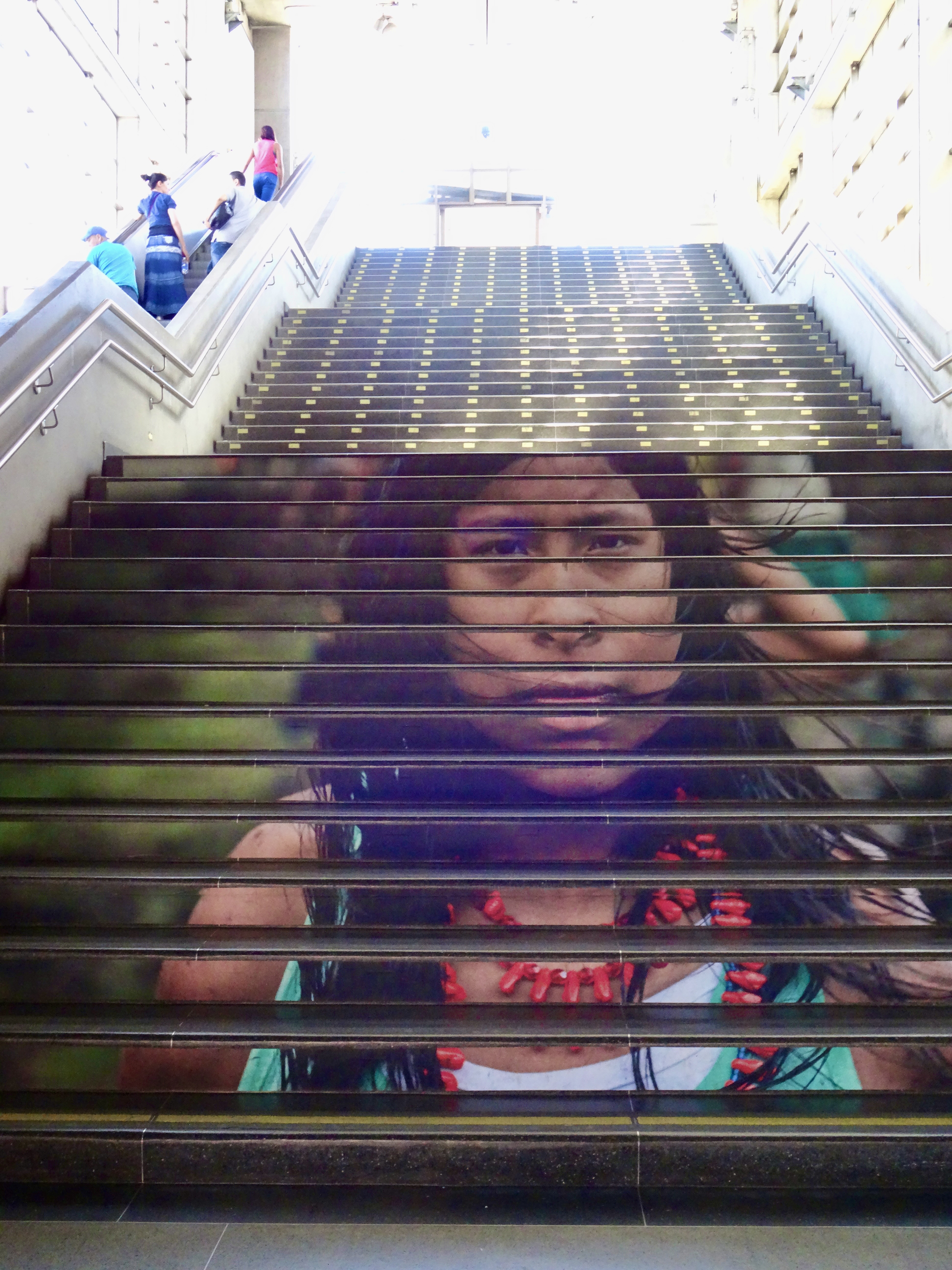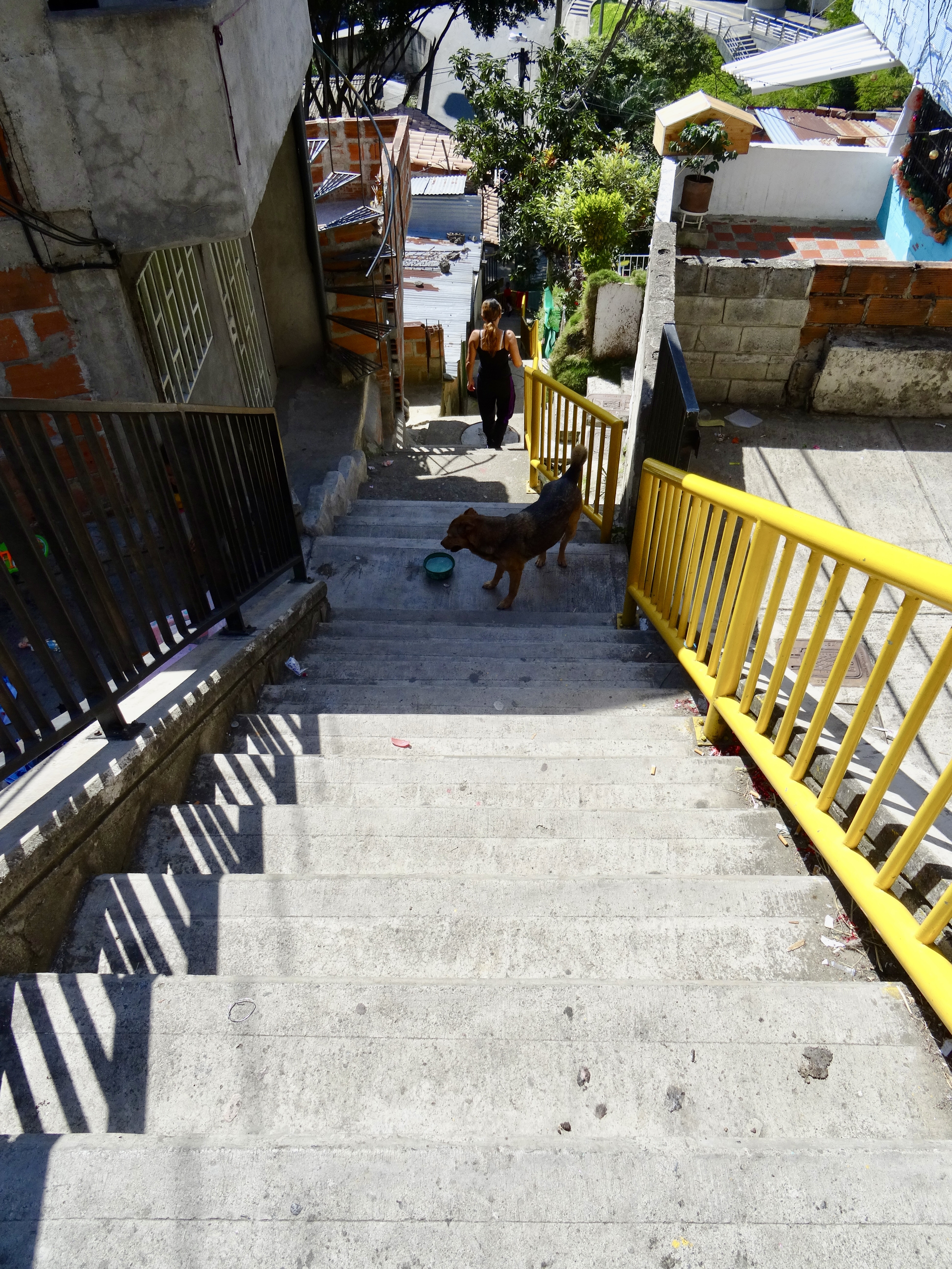 Then, despite some Colombian who was with family members (from the states, I think), using the system as a Disney ride and told us it was very unsafe to disembark and that we should take the “round trip” and then go back on the metro or a taxi, we got off at two different stations on the way down — strolled, smiled, photographed and wandered up and down different stair paths (where entry doors and houses abutted the narrow staired paths). Hopped on and off and then transferred to the Metro and headed back.. Decided to get out of the train station at San Antonio instead of changing for our train to Poblado to “check out the action”…