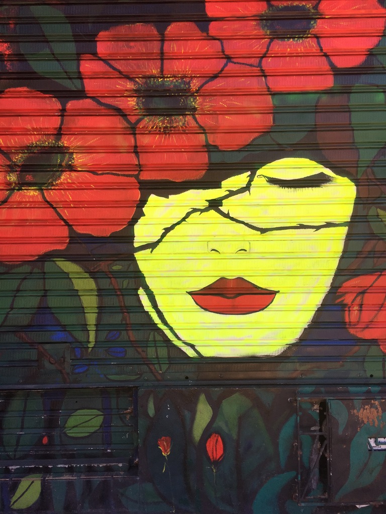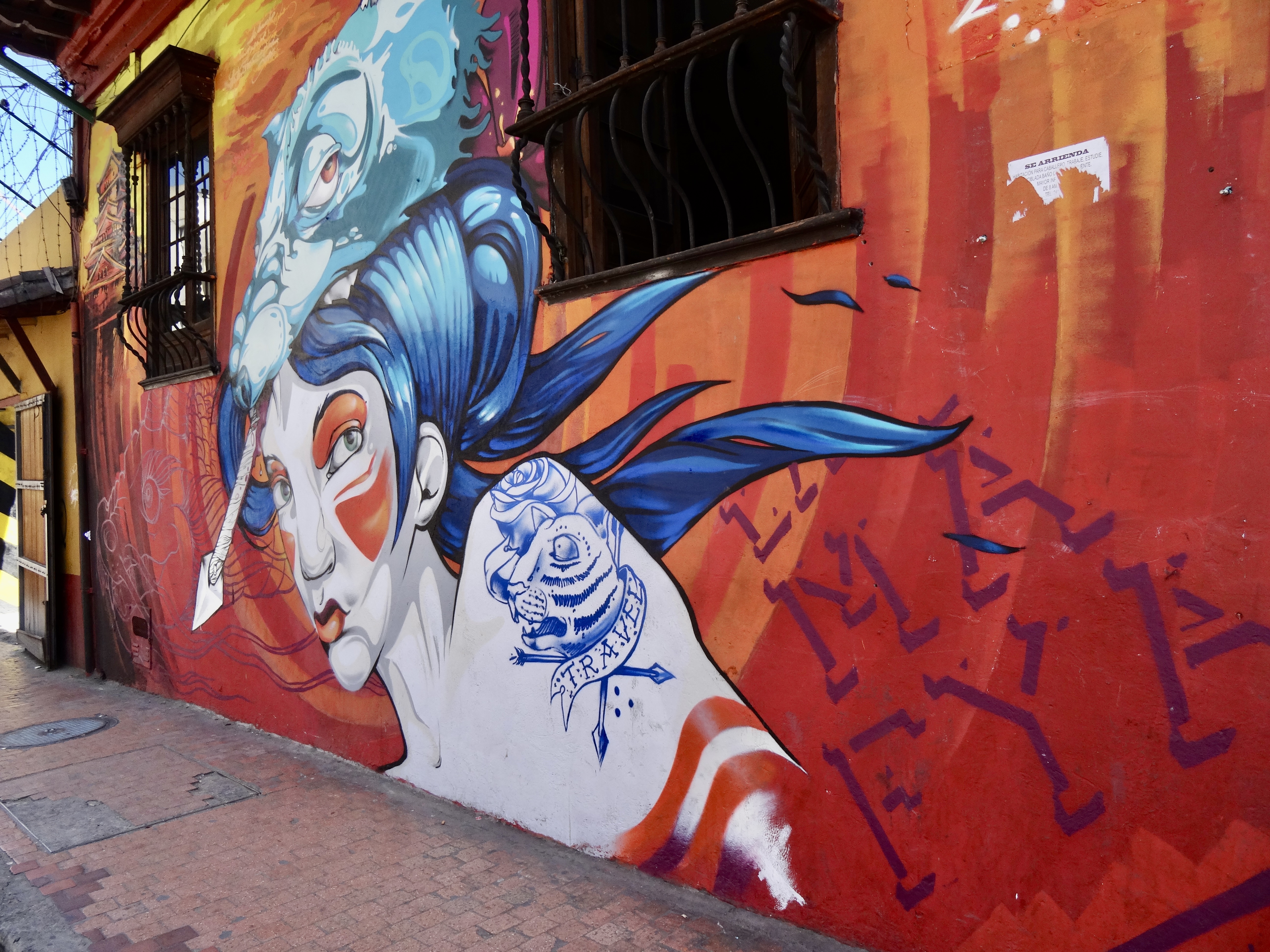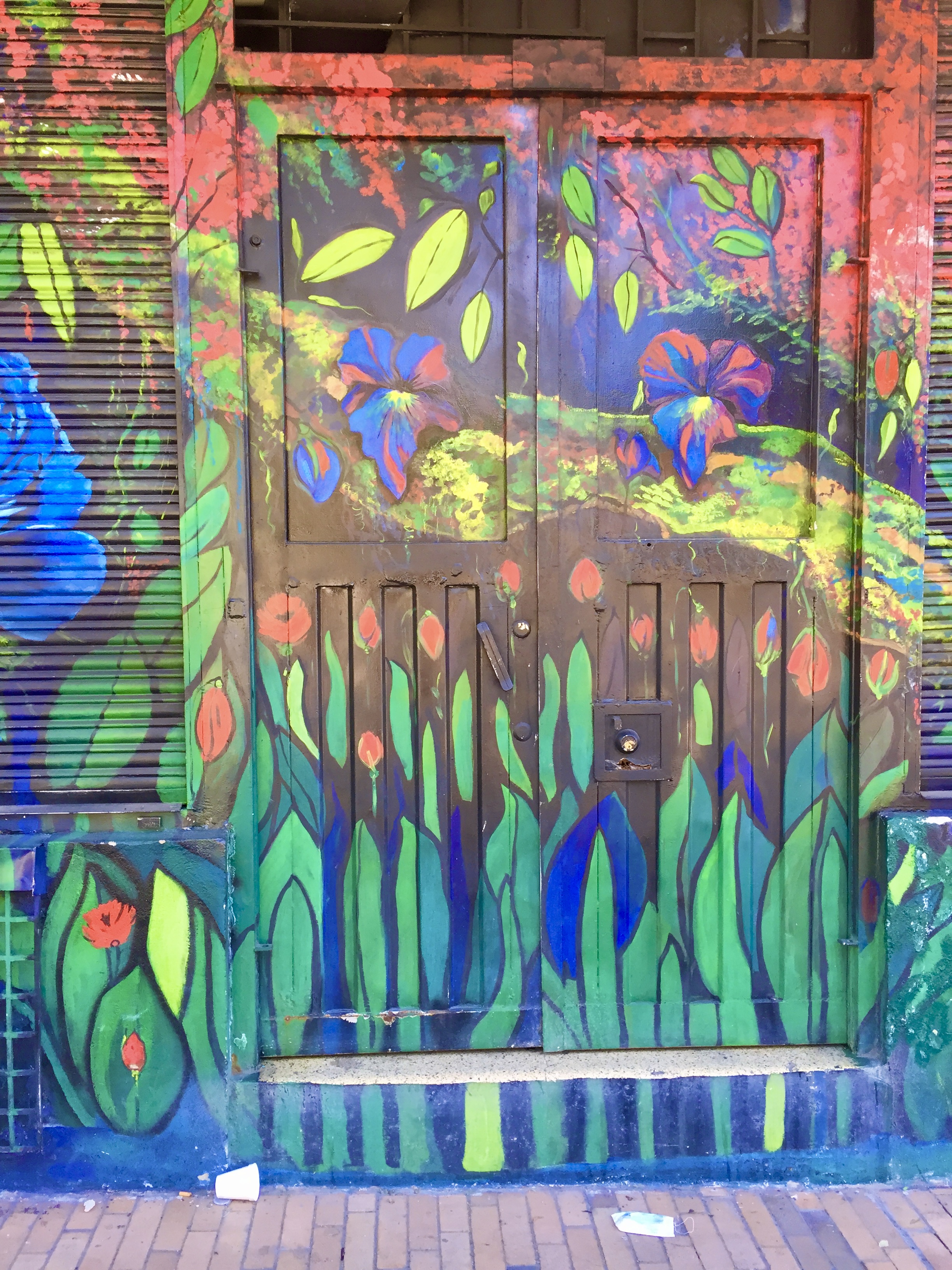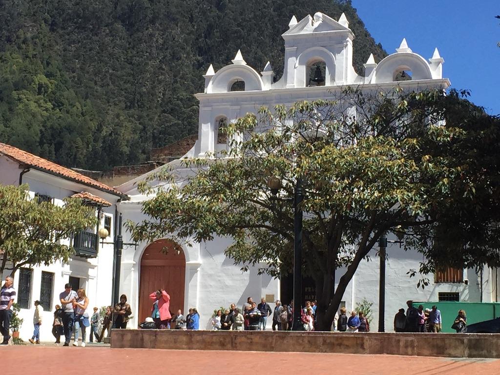 When we got out of the cab we looked at the name on the church and it was nothing like what we were searching for. Then we saw a nun and figured she’d know all the churches in bogota (maybe it’s on the test)… Of course she knew.. and we were somewhere between 10 and nineteen blocks away… Kept changing her mind.. Anyway, we decided to walk.. and once we walked about 10 blocks, we asked again and then it was just a few blocks up hill… As we walked we found ourselves in this amazing graffiti /mural area where every building was painted in great colors with huge depictions of various “statements” — some political, many just ornamental. So the unexpected walk was great. Then we came upon Iglesia de las Aguas.. the most delightfully wonderful church built in the 1600s; we peaked in and there was a lively mass going on… Naturally, we could not find the craft store, so we opted to walk to the restaurant I had seen from the taxi..