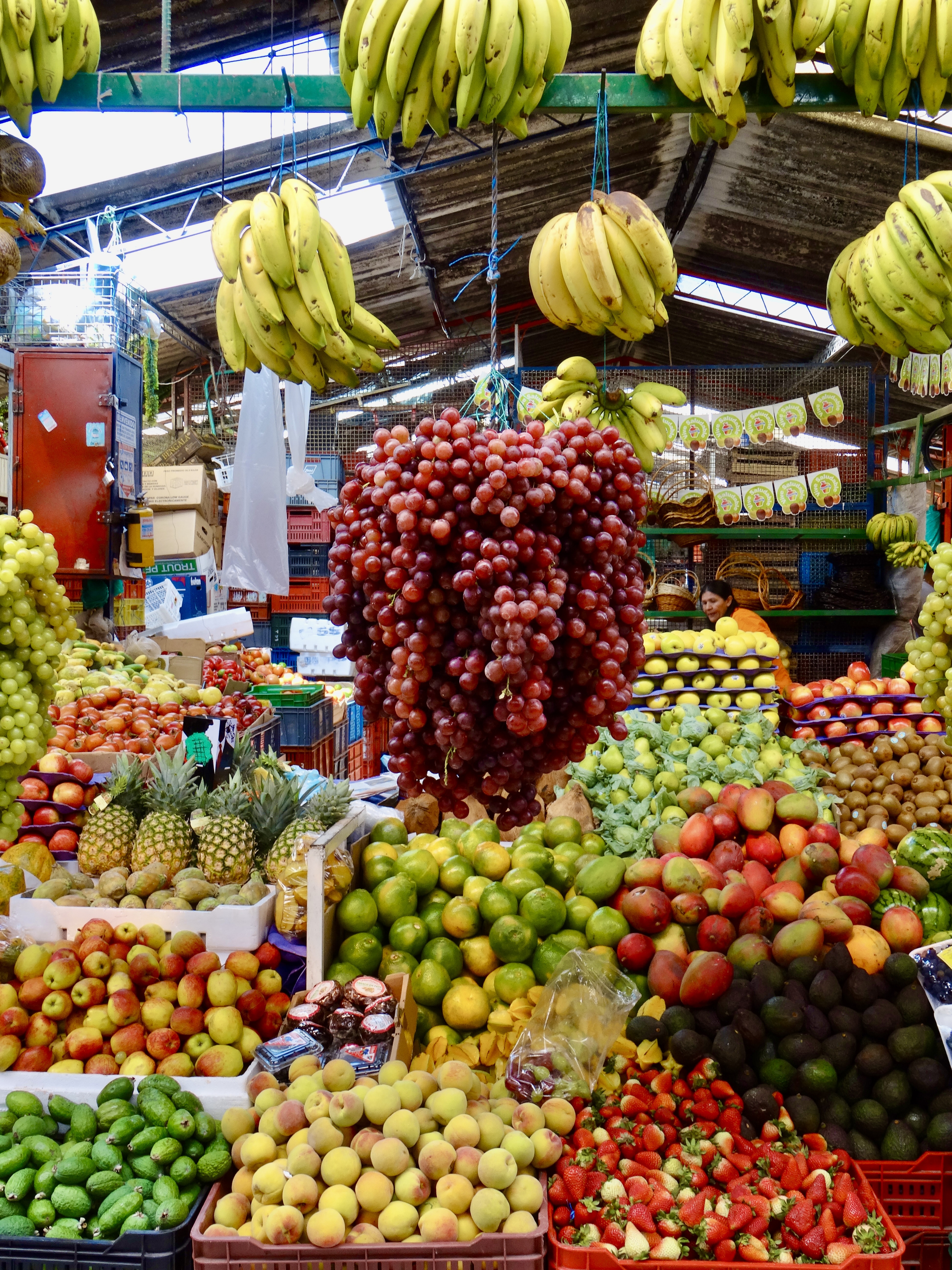 On the way to the market, we passed several of the BRT stations (Bus Rapid Transit) which we are determined to try to take tomorrow if time permits… We got to Paloquemao Market which unlike Bazuri Market sells only food stuff.. primarily fruits and vegetables.. It goes on for about 4 city blocks and is chock full of just fruits and vegetables in tiny stalls.. Seems as if there are two parts.. maybe one part is for commercial sales (restaurants) since those stalls specialize in just one item (avocados or corn or peas or oranges or whatever).. whereas in the other part the vendors have diverse products. We saw some fruits we have never seen.. and are difficult to describe. Meat and fish and cheese and other stuff are also sold.
