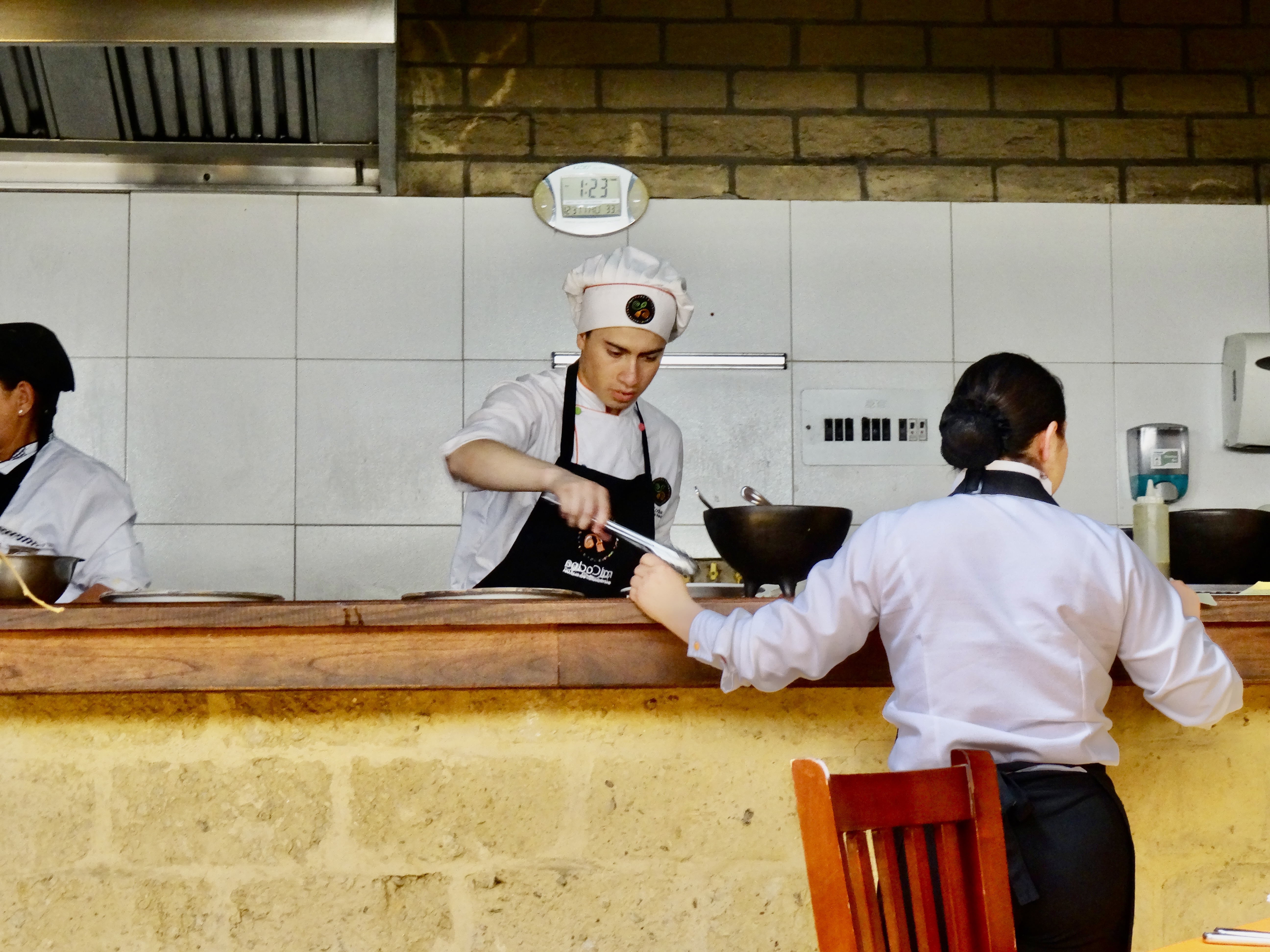 When Mike and I met up, we decided to eat at what looked like a cute restaurant (with a good menu) — turned out to be the town cooking school.. so we peeked into the kitchen .. and I think that the wait staff were all students in the school and our meal was cooked by students. Started with pastellitos that were filled with corn and peas and potatoes, then large scamp sauteed and served with brown rice that had cherries in it.