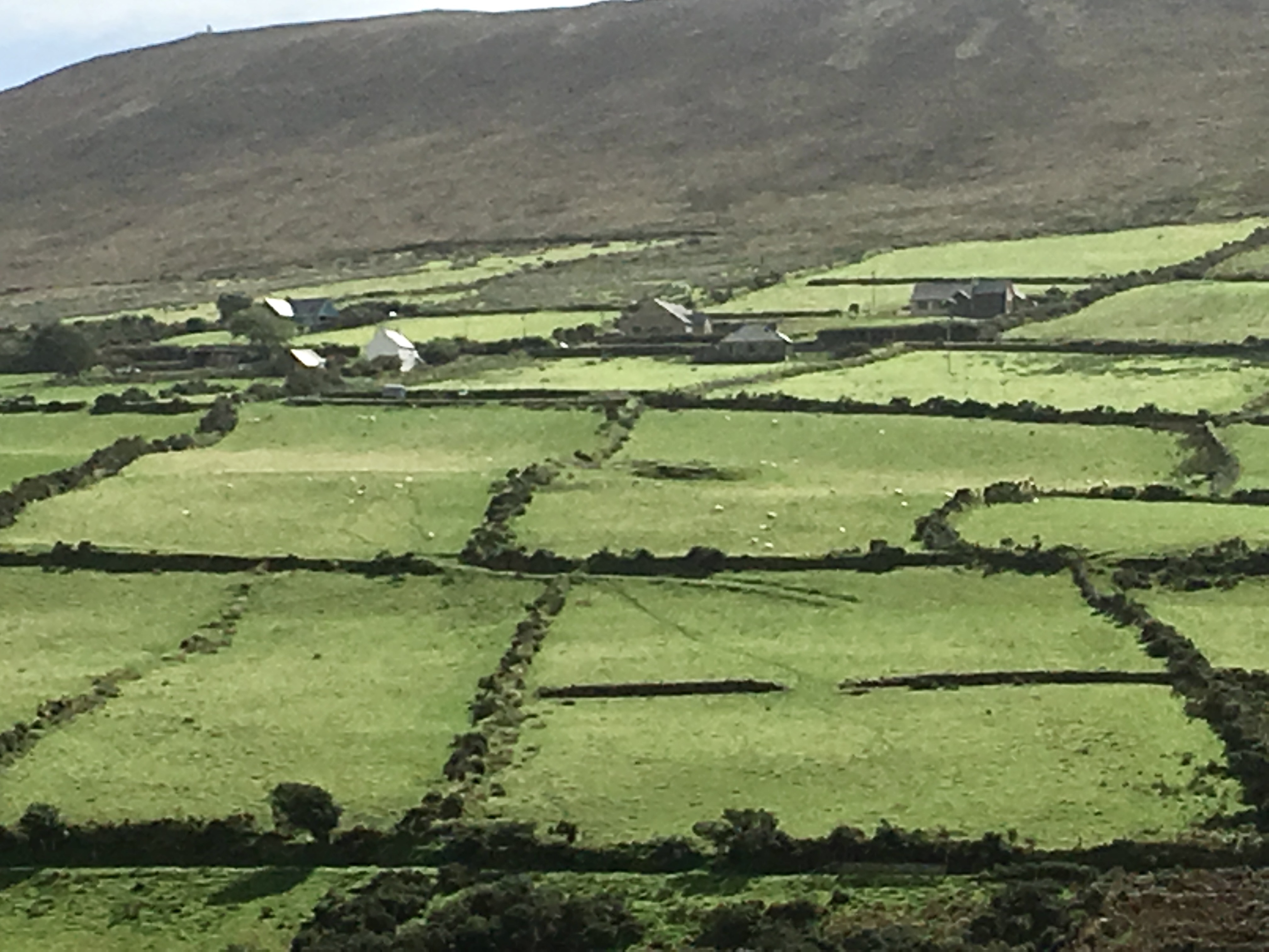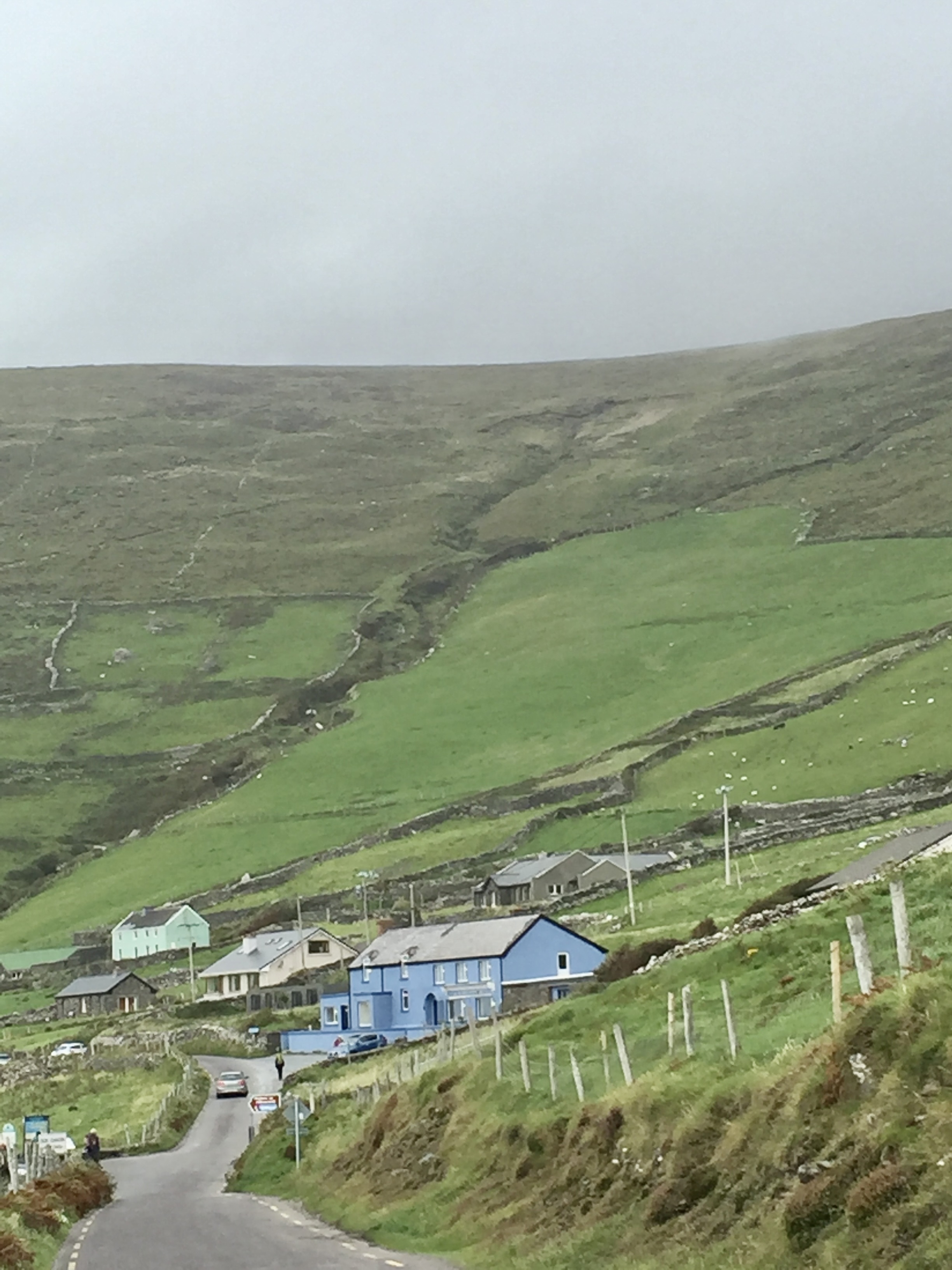 Anyway, as we left Killgorlin, we headed out toward Castlemaine and on to Inch (a tiny beach peninsula) and then on to windy roads that careened back and forth – stopped many times, with one vista being more spectacular than the other.. and those greens. You just cannot recreate them… The light was spectacular although always clouds hovering.. so stretches of brightness and areas of darkness. Reached Dingle at about noon, bought our tickets for tonight’s performance. Couldn’t check into our hotel (Benners) on the main drag until 4:00, so we strolled a bit, stopped for salads, and then headed to take a circular one-hour drive (assuming no stops) that circles the Dingle Peninsula. Yet more spectacular views and cliffs and sheep and vistas… Took about two hours and then headed back to town to finally check into the hotel (now about 5:00). But the hotel had a little problem with the key card machine, so we had to wait in the lobby for about 30 minutes until that got sorted out.