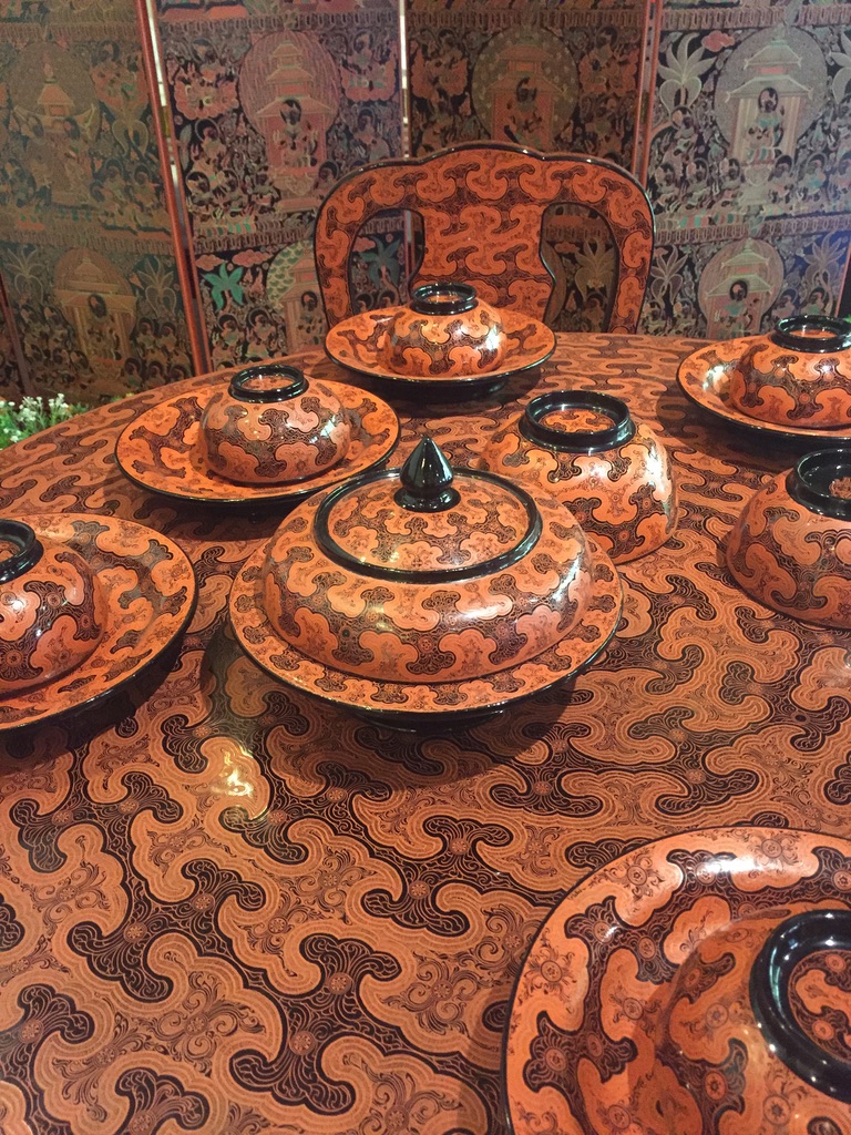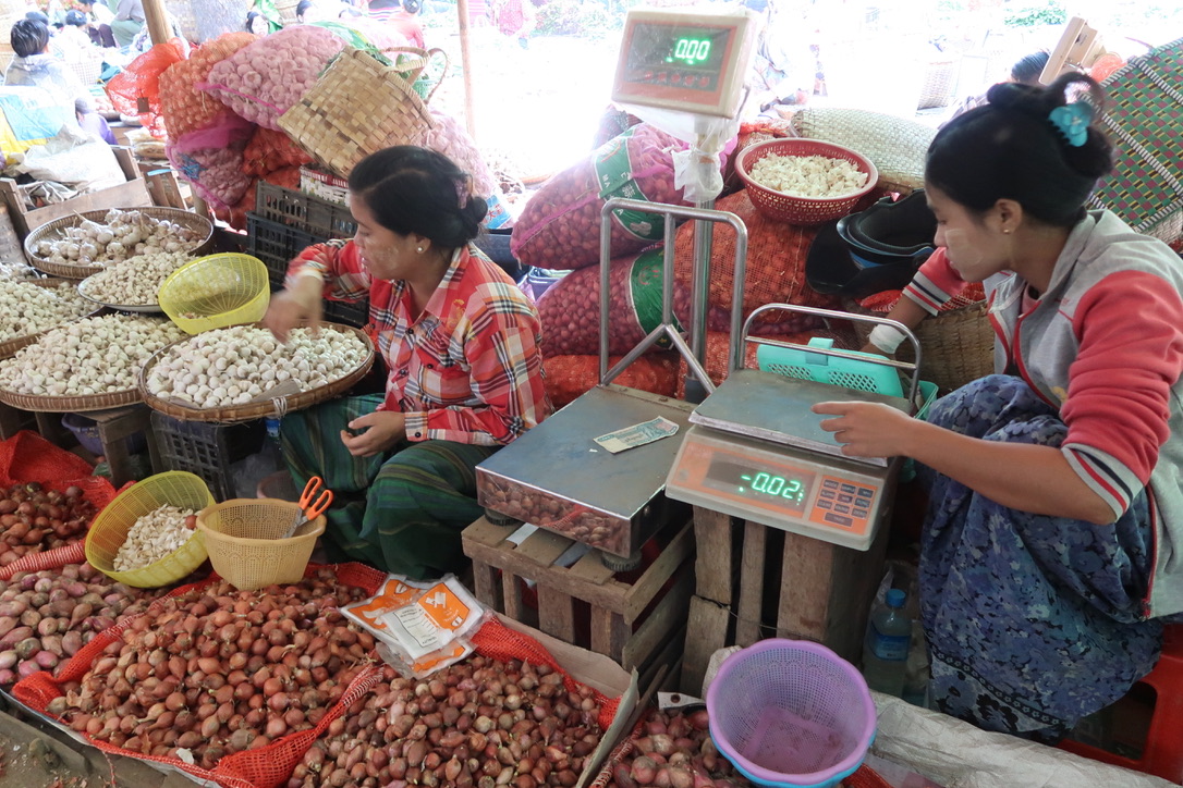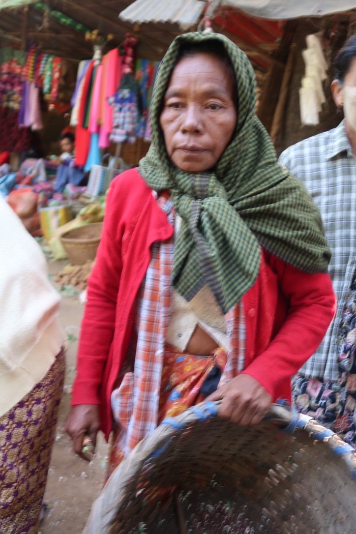 Anyway, the market was right up there with the best of them. Huge, sprawling, teeny stalls – some with tent like covering; others completely open, vendors all sitting cross-legged on the floor. People shopping for every conceivable kind of food and going about their daily chores. Some tourists (all with iPhones snapping away). Lots of vendors selling textiles, longyis, lacquerware… but the majority of the market is fruits, vegetables, flowers, spices, meat, fish. And of course there are little places to sit on tiny stools to have noodles or other fare. (We are trying to stay away from street food, but not totally successful, in an effort to stay clear of stomach issues now and when we return. We are however eating freely at tiny “restaurants” which are probably on par with the street food guys.)