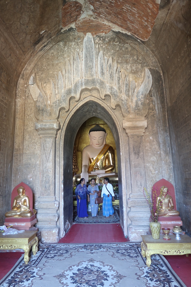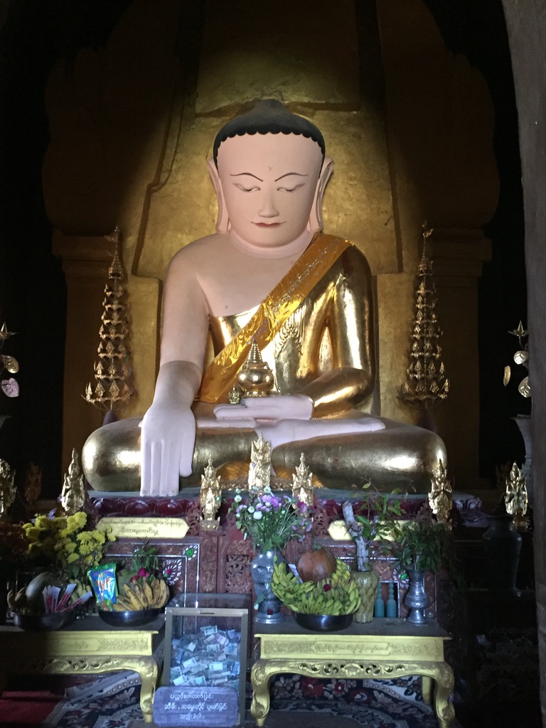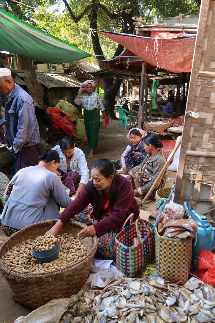 Set out this morning for the main market in Nyaung U (Bagan has three distinct areas — New Bagan (which isn’t very new), Old Bagan (which is where we are staying), and Nyaung U.. Nyaung U is the administrative center of Bagan and where the airport is located, as well as a lot of hustle and bustle. Frankly, the three areas blend seamlessly into one another and I’m not certain I could say what makes each different. We thought Old Bagan would have all the pagodas and temples but the temples are everywhere… You stumble on them as you drive or walk; they are situated far from the roads and also right on the road (sometimes without any demarcation); they are large and they are small. Some are considered very “important” and others less so. We stuck mostly to the “less important” ones since they didn’t have any crowds, no buses, no one there… just us. And we favored the less adorned ones – all brick and covered with cement or gild.