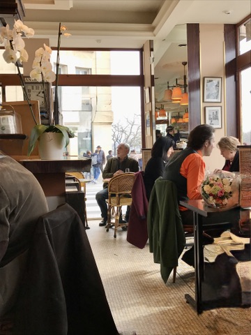 Rainy Thursday night dinner (late – after arriving by train from Geneva): Le Baratin – An old-fashioned French bistro located on a very small and hilly street in Belleville – an anchor of the neighborhood. Very simply decorated with wood tables and a narrow zinc counter in the bar area. The chef is Argentinian, I think, and the menu is recorded daily on a large blackboard (portable) that the waitperson somehow lugs to each table. We shared two appetizers (which were large enough to eat as the main course) – huge oysters in vinegar and room temperature veal tongue on a bed of wonderful lettuce and some kind of parsley salsa. We then shared the sweetbread main course which melted in your mouth. They have an extensive wine list (managed by the very present owner), and topped it all off with a tarte tatin… We taxied back in the rain, quite content. Three of the approximately 15 tables had non-French and we all wound up sitting on the same side of the room. To our right, was a guy who owns several restaurants in Toronto (He’d come to this restaurant three times before on three separate trips, but never eaten here because he couldn’t get a reservation.. He lingered hoping a table would open up but it never did, so he just had wine on those other occasions. This time he had a reservation. The place serves until they run out of food and that’s it! This guy from Toronto is some kind “award-winning” bartender. We chatted quite a bit and next time in Toronto ……. As it turns out on our other side were two young women (early 30s) who were also from Toronto and they were cooks at restaurants this guy on our other side knew. Small world. We and the Toronto bartender sort of closed the place up.