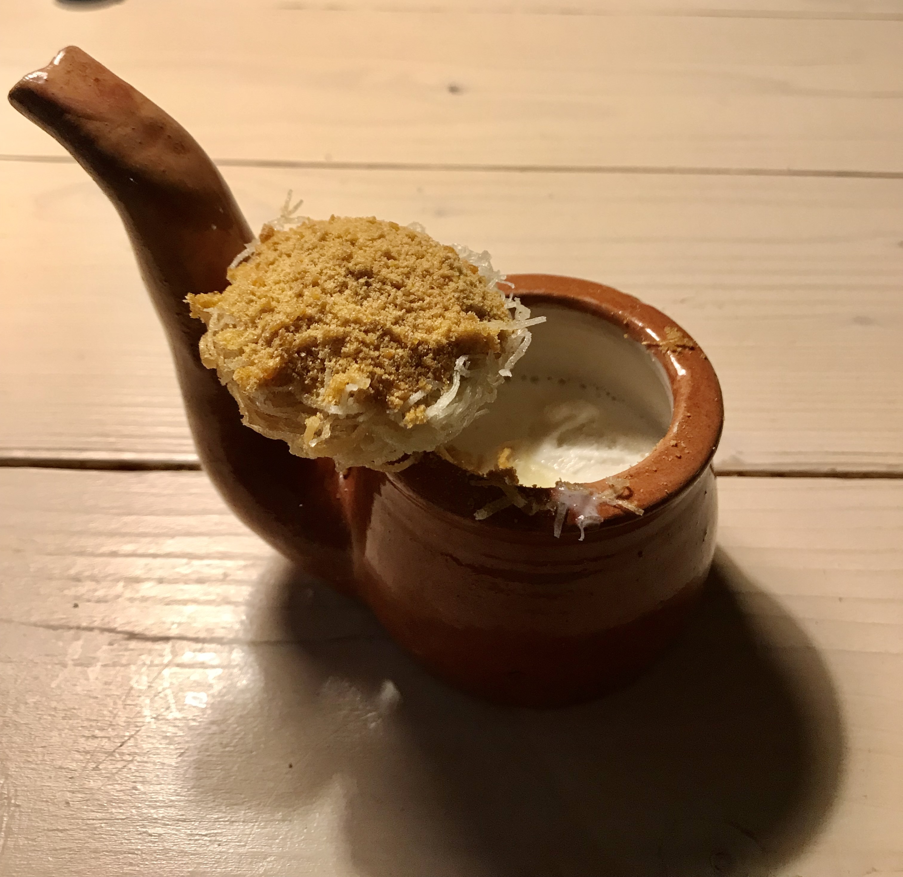 - Dessert was incredible – served in a ceramic vessel that had a spout; it had a birds nest kind of edible topping with graham cracker-ish grounds and some cream.. you eat this and then you drink from the spout what is sitting at the bottom of the vessel — some kind of yogurt-y liquid. Totally yummy.