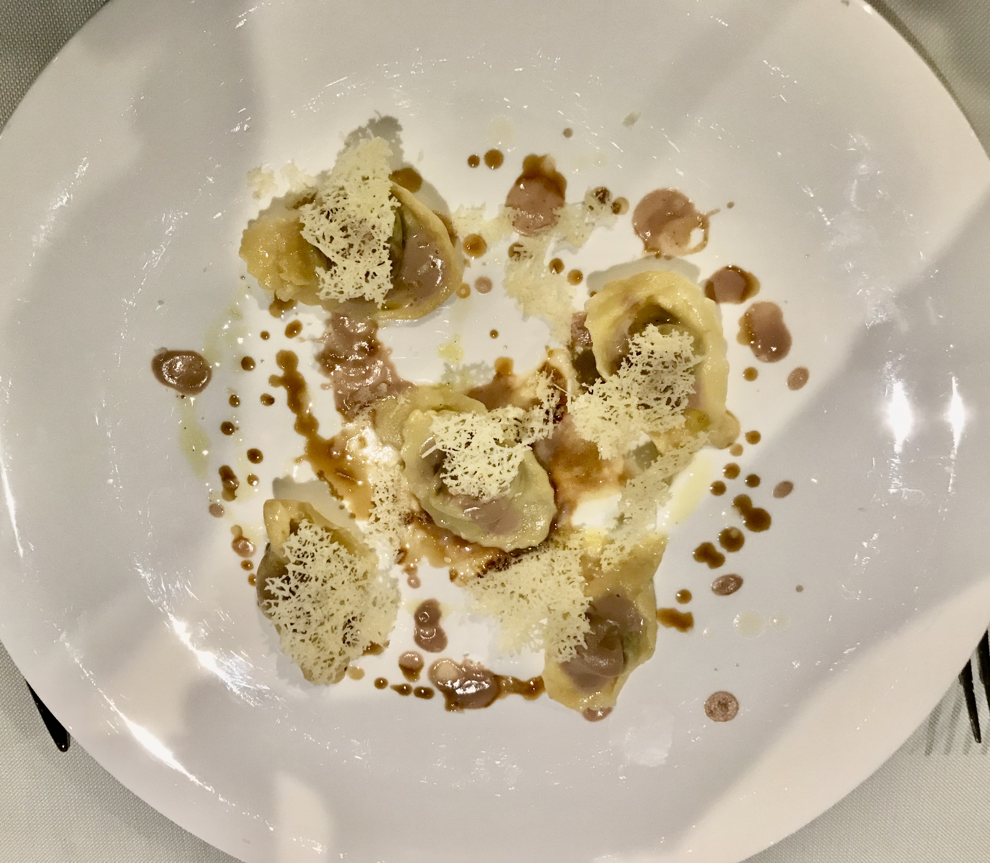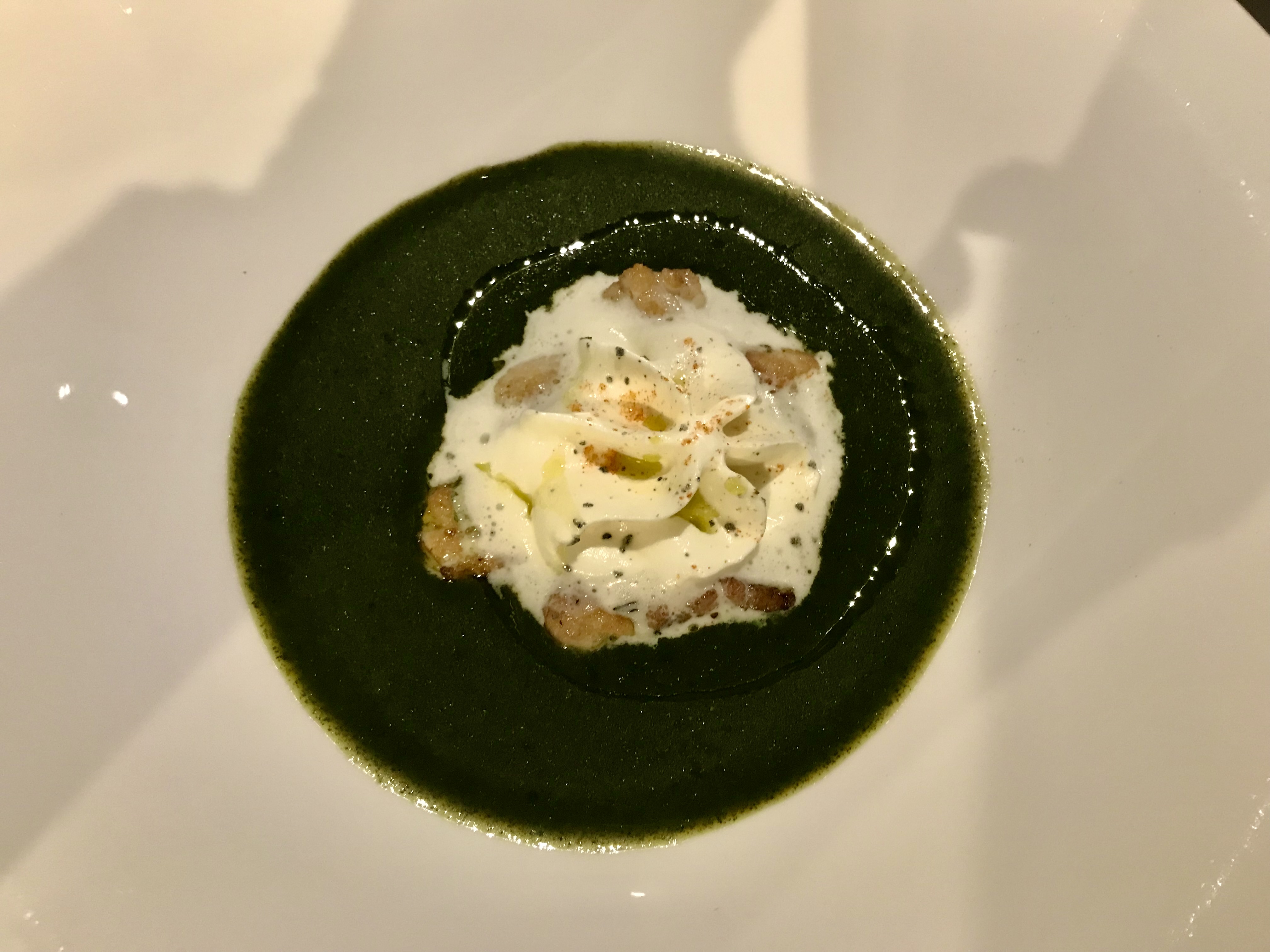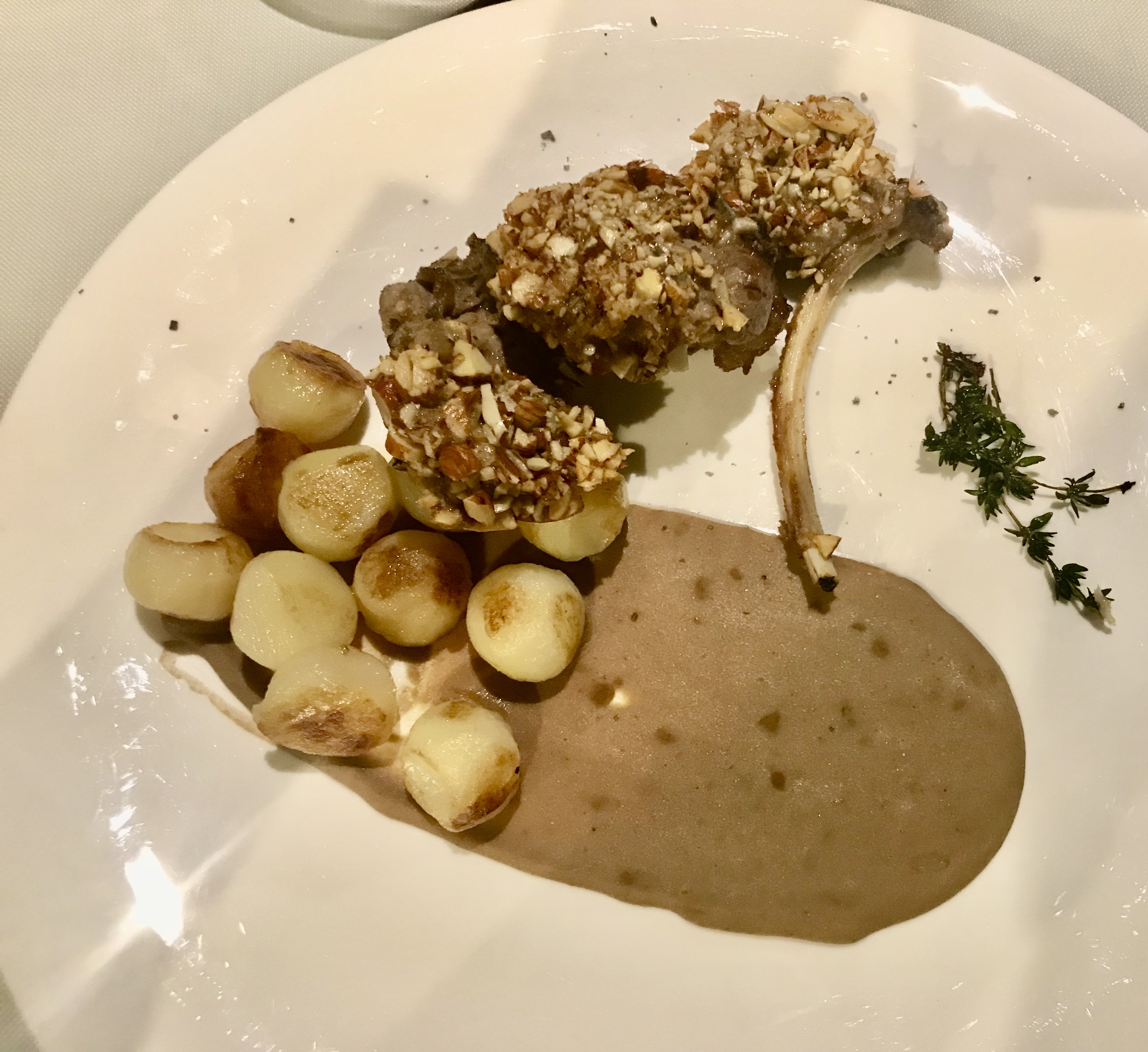 Started with a pasta with some kind of mushroom thing sitting on top of each pasta piece, followed by a nettle soup with foam and sweetbreads and ginger and vanilla, I think, followed by foie gras with wild figs and toast. The main course was walnut encrusted baby lamb chops with vegetable side. We shared three deserts, but they brought all five to our table. Crème brulee, homemade minty-mint ice scream, poached pear, something that was sort of like deconstructed baklava.