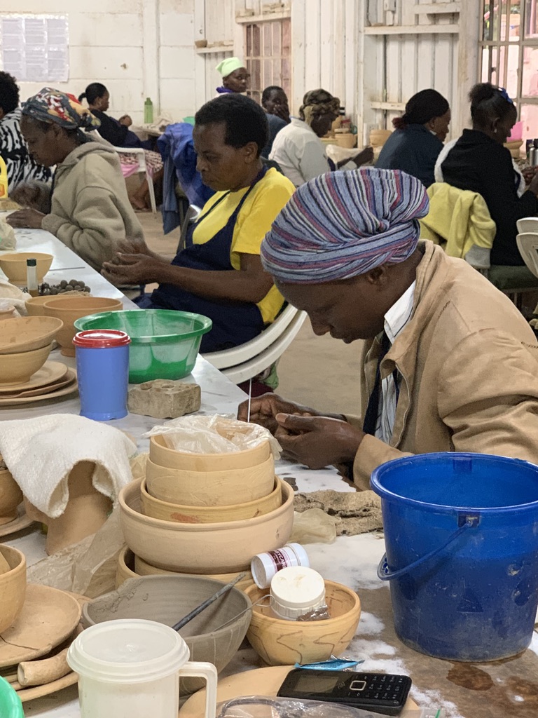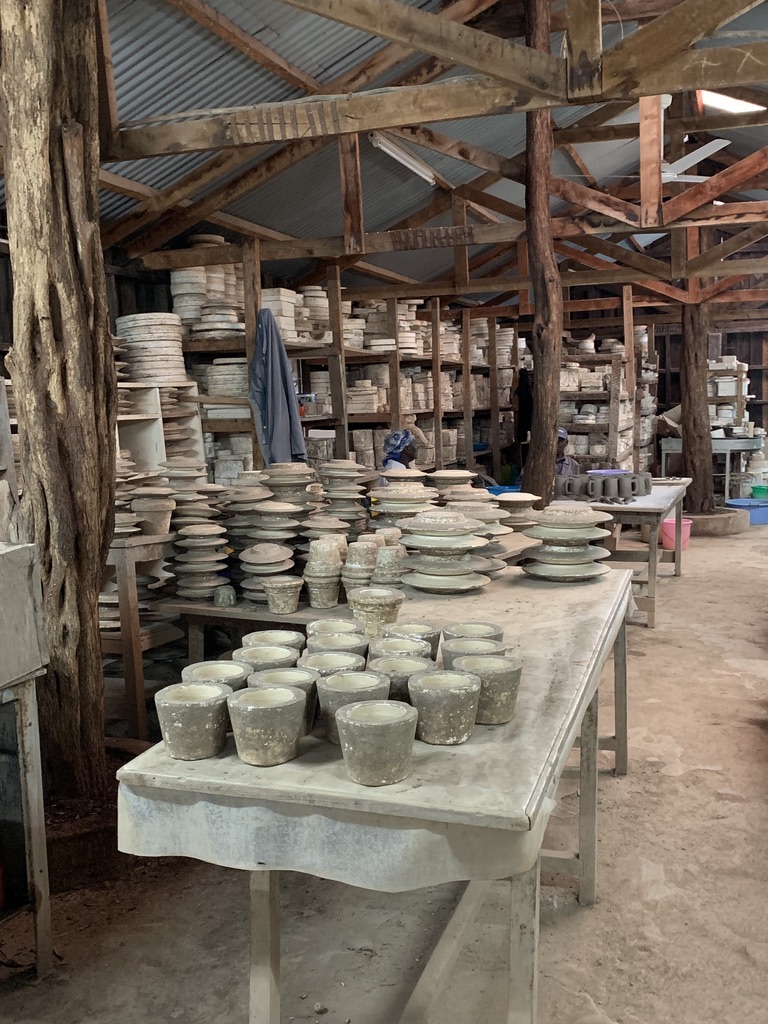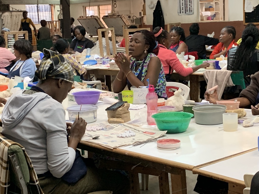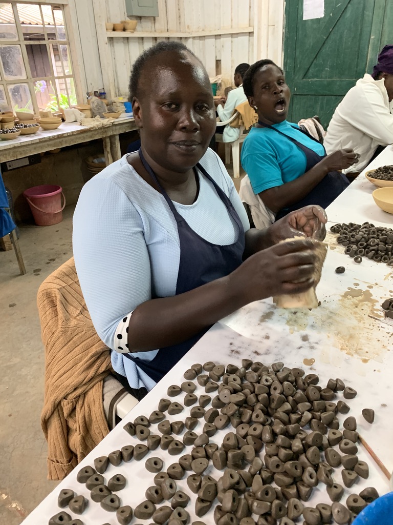 So, back at the bead factory. There was a ‘mandatory’ tour which proved informative and also disturbing. The bead center was started by some religious person who wanted to help unmarried mothers. Now, some years later it’s a thriving enterprise with at least 70 workers (mostly women – and the women make the beads; the few men working there make the mugs and newer items they have added to their portfolio). When I went inside the first building (really a series of huts) everyone was singing a religious song – it was Christian but they were singing in Swahili, and then there was a prayer. Apparently this happens twice a day. The bead-making process is very rote and the women have strict quotas they must meet each day. They do rotate the jobs.. two days you are making the clay beads; two days you might be putting the holes into the beads; two days you’re involved with the firing; two days painting (based on a very strict pattern and color scheme you are given); two days involved with firing once the colors are on the beads; two days stringing the necklaces.. etc. etc. Turns out that Kazuri has established quite an enterprise with orders from around the world.