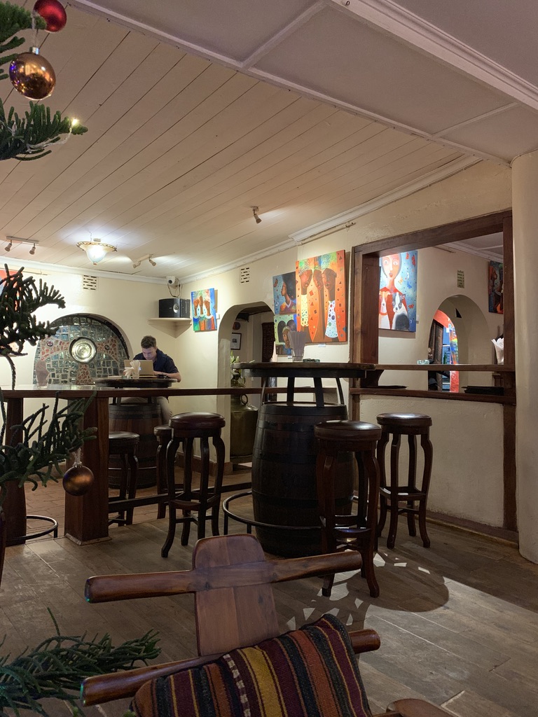 Talisman was a pleasant surprise – a “gastrolounge” in an old farmhouse with meandering rooms for the bar and the restaurant. Crows was a total fusion of Nairobi (albeit, missing poor people). Following drinks (I’m now really into these “dawas” we headed to one of the dinner spaces. The menu was totally eclectic – we opted for samosas, Moroccan spiced beef, and also the ostrich dish (great!) and couldn’t resist dessert – chocolate malva (sort of mousse with a champagne orange curd). The house and each room had several fireplaces, which was good because the rain was unrelenting and the spaces were sort of open… and clearly no heat.