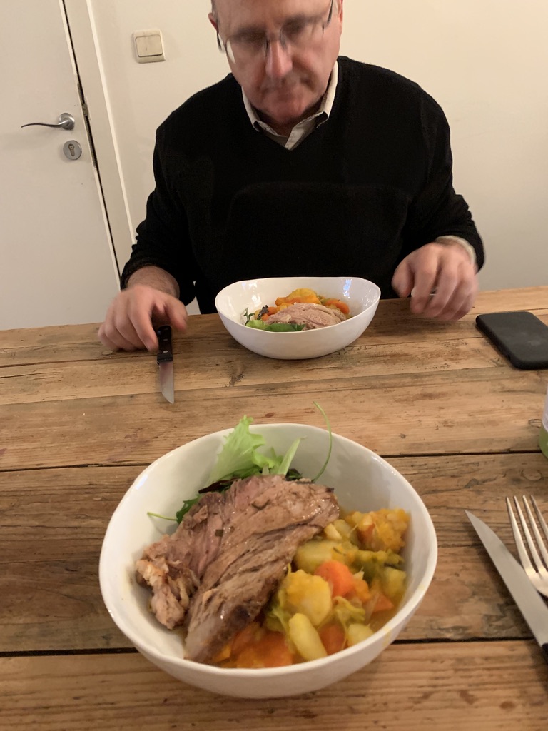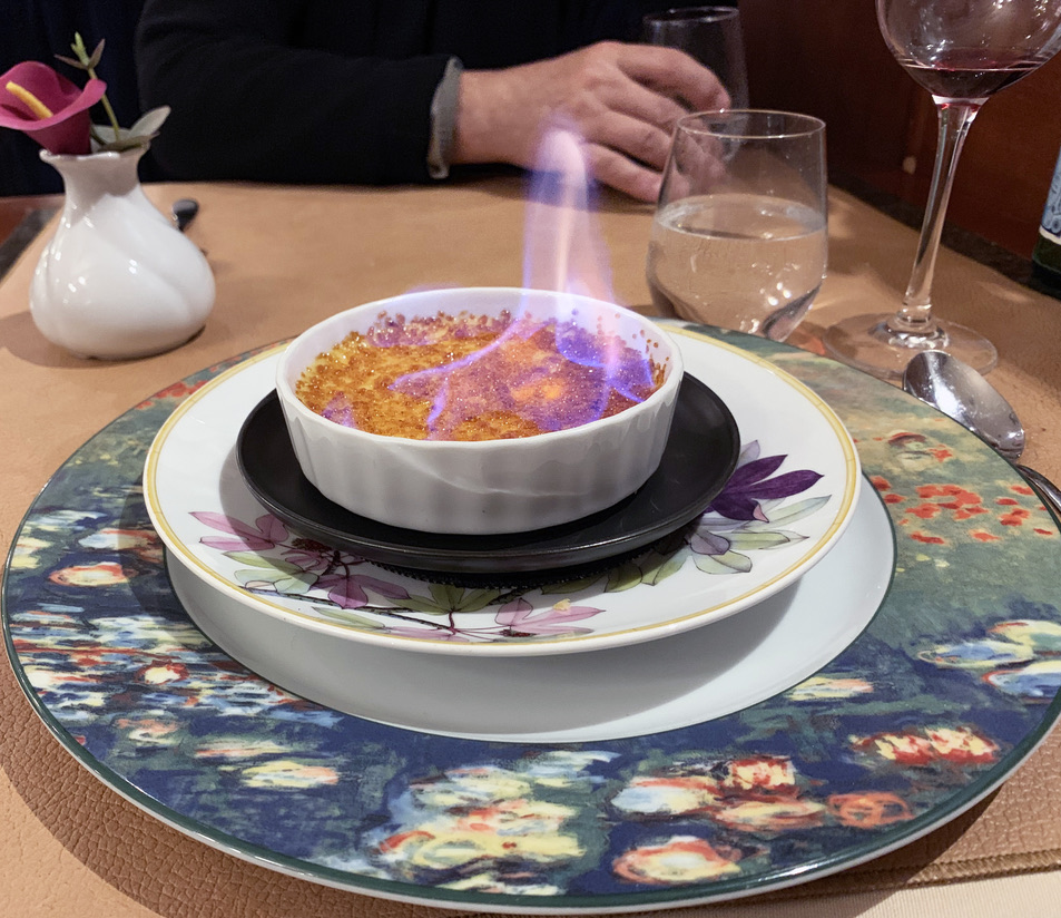 I had some kind of ratatouille with escargot, followed by amazingly tender rare duck served with cooked and peeled pear, some vegetables and a shot glass of mushroom soup. Before the meal began, they brought out a selection of all sorts of tiny treats including a shot glass of cucumber soup, something avocado-y, two wonderful cherry tomatoes in a great olive oil and vinegar, and about five other morsels. We ended with flaming crème brulee. A great surprise meal.