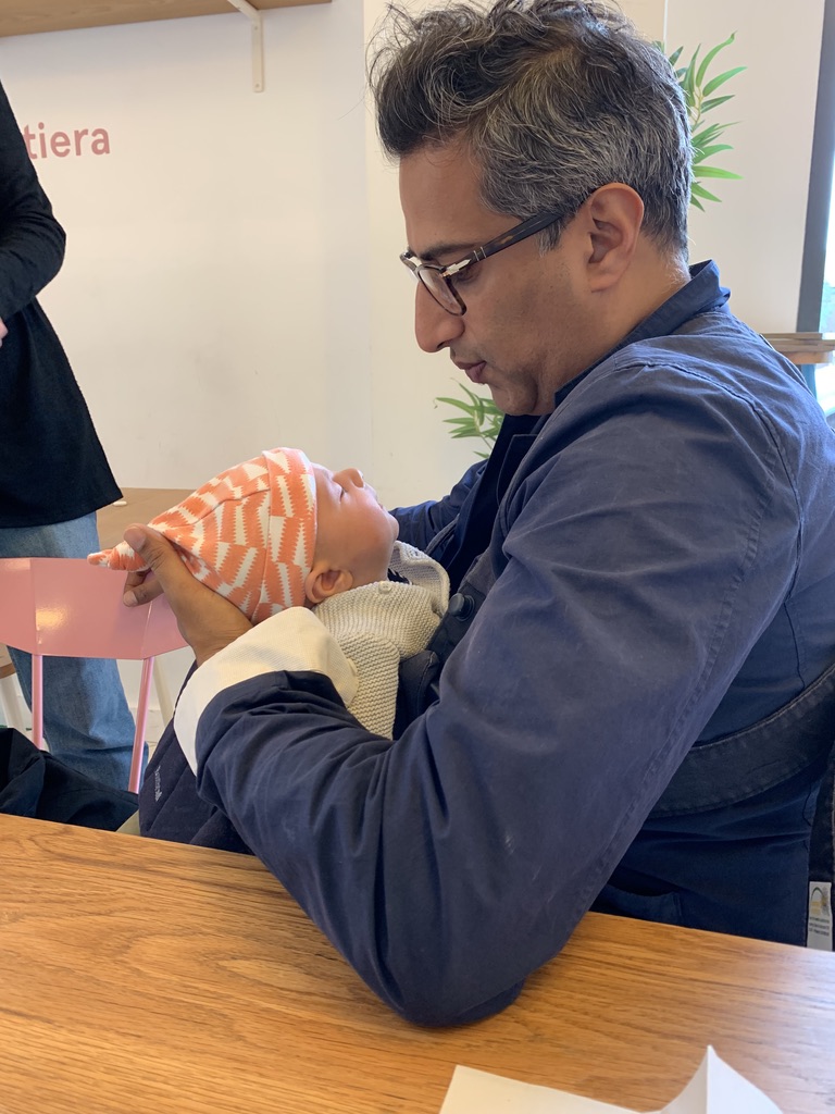 On Monday we opted to skip the hotel breakfast and walked to Ottolenghi Spitalfield (about 10 minutes from our hotel) for a great shakshuka breakfast. Then we headed to Hemma’s for a traditional Indian lunch cooked by Hem’s mom and dad. Totally yummy; you needed to roll us out of the house. After visiting a bit more, we all took a leisurely walk to and through the Olympic Park, with a stop for wonderful gelato and on to Stratford Station where we caught the train back to the city. We returned to our room and realized it had been extremely hot with no air circulating. We changed rooms — a pain in the neck but worth the trouble. And then a few hours later we headed out for dinner… gee do we do anything but eat and baby stare? Since it was a night where the following morning would be a work day, and it was almost 10pm, we figured we could get into Dishoom… Indian again, but perhaps we were inspired by the lunch. Great drinks and some lamb biryani, chicken tikka, some side dishes.. and we were in heaven.