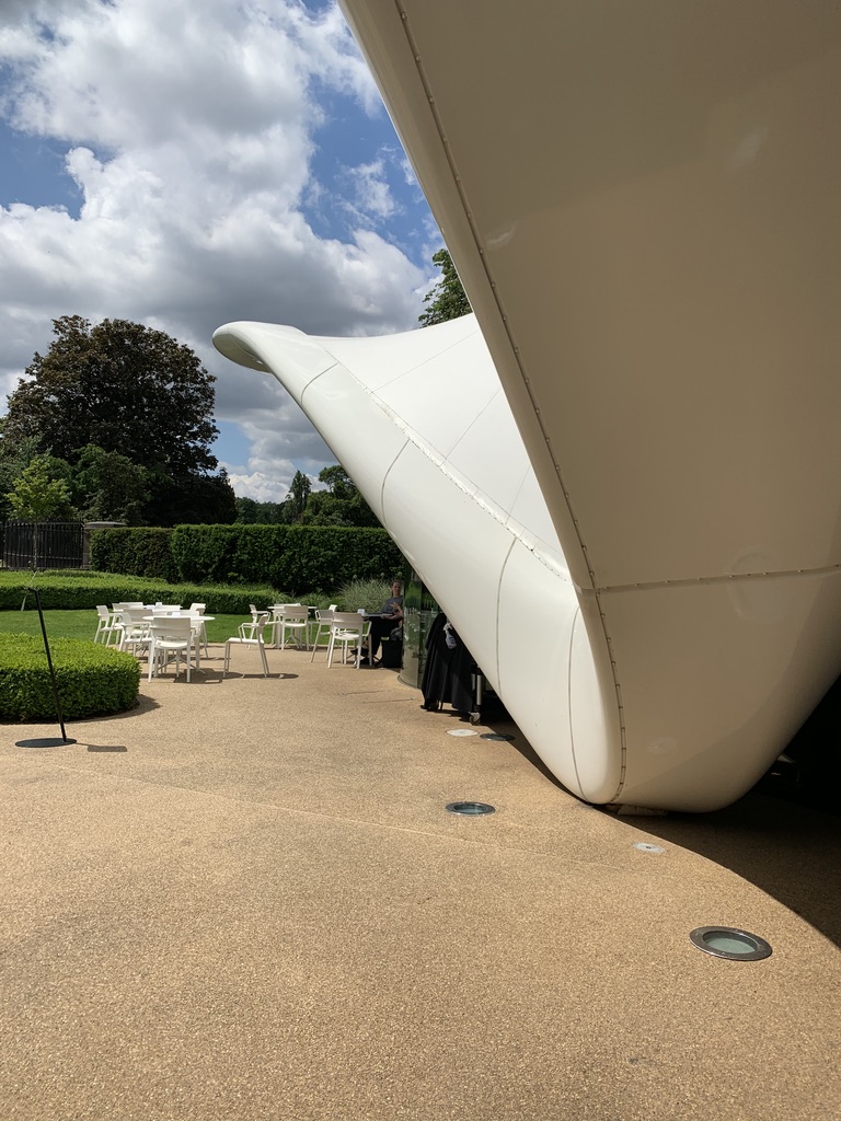 But Mike and I decided to head for the Serpentine anyway–which included a long walk through Hyde Park (we are racking up our walking mile at about 6-7 miles per day, per the trusty app on our phones). We stopped briefly in the restaurant addition to the Serpentine – a very chic space designed by Zaha Hadid – which I actually liked a lot.