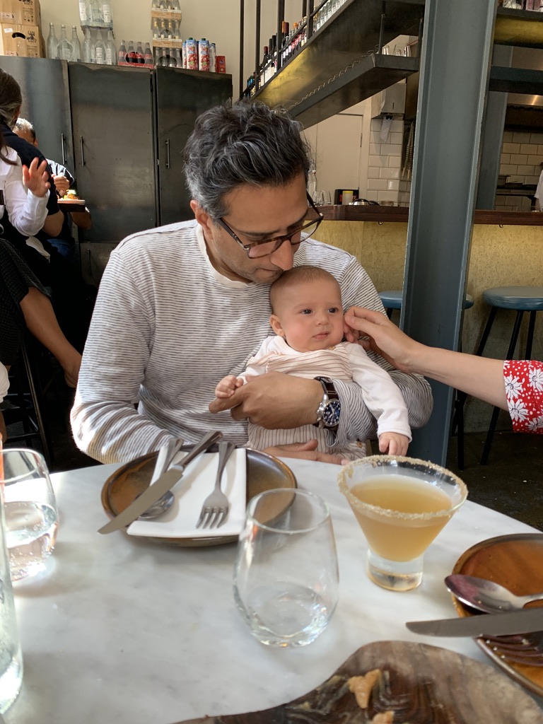 For those who were interested in our meal at Rovi, the new Ottolenghi restaurant, we had: Pickles and fermented vegetables with duck pastrami; Burrata with raw zucchinis, and lime and basil; Tempura stems with a lime leaf vinegar dipping sauce (beyond yummy); An asparagus dish (some kind of butter and jalapeno); Beef carpaccio (melted in your mouth) with Jerusalem artichoke and a dollop of what I think was a very soft goat cheese; Celeriac shawarma; Grill of chicken parts including heart, liver, etc.; And for dessert we had a chocolate fondant that came with chili and I think crème fraiche ice scream, and also tiny rhubarb donuts with vanilla cream.