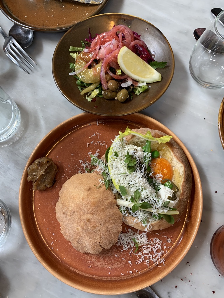 - Buttered Pide (sort of a flatbread), with runny egg, ricotta, some greens, and fresh peas