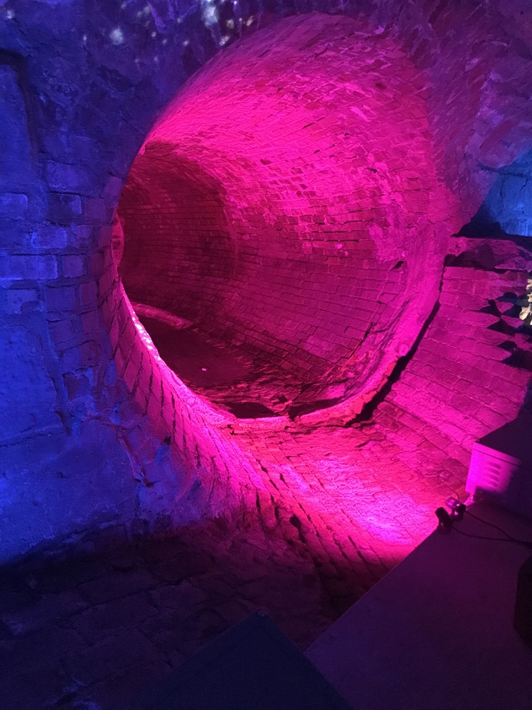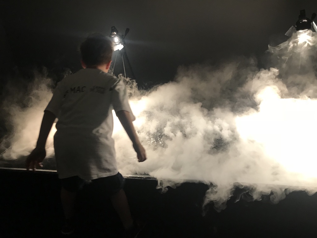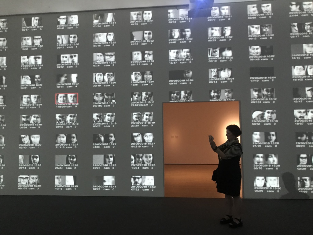 From there we walked (total walking today was about 6 miles – in the heat; it was in the high 80s today and quite humid; not my favorite weather; I wilt at 72) to the Museum of Contemporary Art. We strolled through great cobblestone streets and cute boutiques and literally hundreds of cool-looking restaurants; stopped for a salad and continued uphill (through a lot of construction and infrastructure renovations) to get to the museum – affectionately called the MAC (Musée d’Art Contemporain de Montréal). The current exhibition was the work of Mexican-born Rafael Lozano-Hemmer– a prominent international artist working in Canada. His work is large-scale, participatory installations that generally incorporate technology, light, and public spaces. He considers them “anti-monuments,” and they are often displayed outdoors to increase accessibility. These works were exhibited inside the museum (thereby limiting exposure). The exhibit was somewhat participatory and several pieces had subtle political content. I believe that all or part of the exhibit will be coming to SFMOMA later this year.