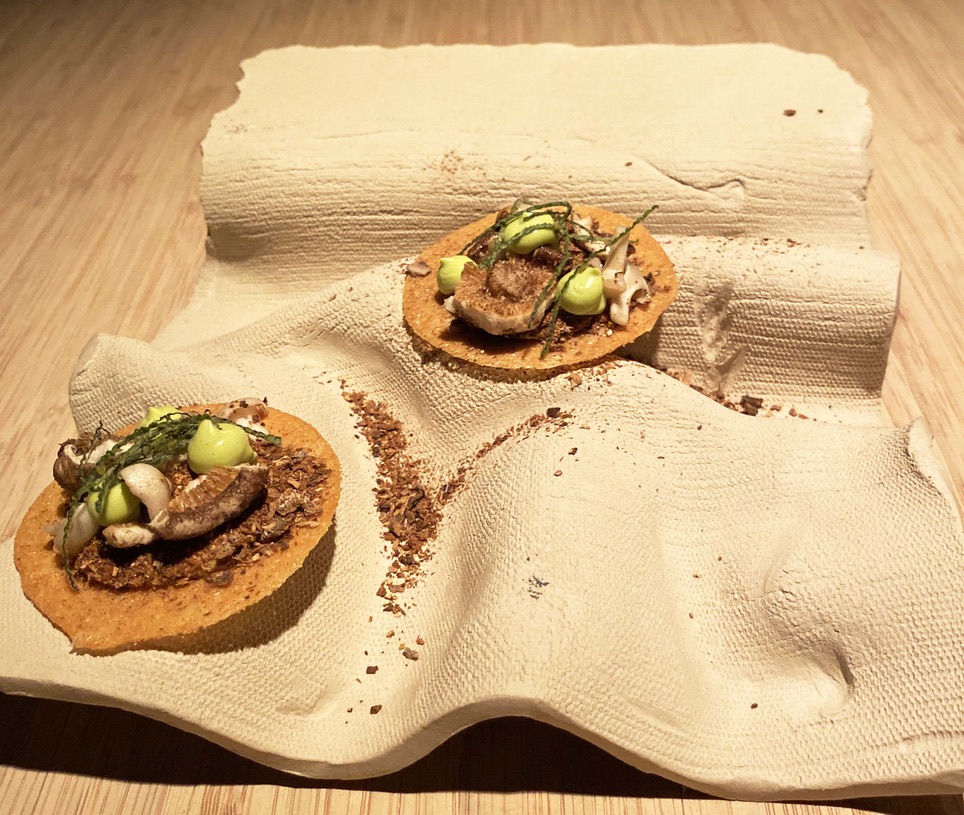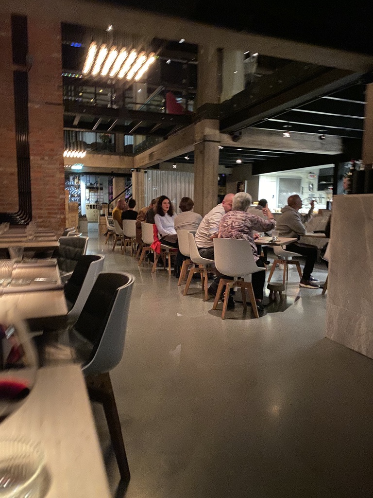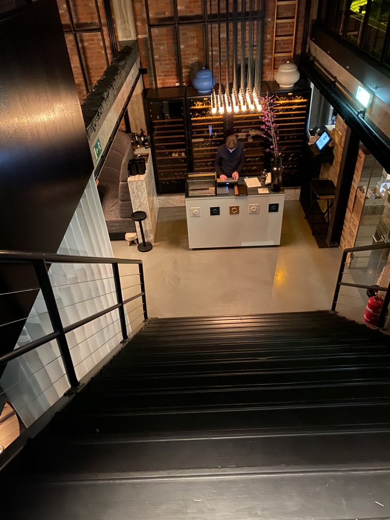But first a bit about our Michelin star dinner last night at Zarzo – a fairly unpretentious space in the central area of Eindhoven. It’s sort of Spanish fusion, a bit difficult to describe, except to say it was fantastic. We had the 5 course fixed meal (they had 6 and 7 course meals as well). But in addition there were several surprises that showed up at the table in addition to the selected meal. We started with an amazing chilled basil ad tomato “gazpacho” served in a wine goblet. We asked how they made it and I think they cut the tomatoes into quarters and spread them out and put salt on them and they stay overnight. Then they create an emulsion of basil which is pressed so much that it’s just a liquid to which they add Spanish extra virgin olive oil and then they add some of the tomato. I’m not planning to try it, but it was amazing. They then brought two or three other sample tastes (including a sour cherry with what I think was a pesto, small bites of raw mackerel with some kind of dipping sauce, a homemade wafer with a wasabi-like paste and herbs and dried mushrooms – each dish served on a plate or platter made special for that dish) before the actual meal began. Then we had veal tartare served along with some kind of amazing potato (I think) bread and some dipping ingredients. The veal tartare had caviar, crème fraiche and herbs.