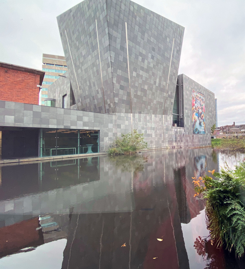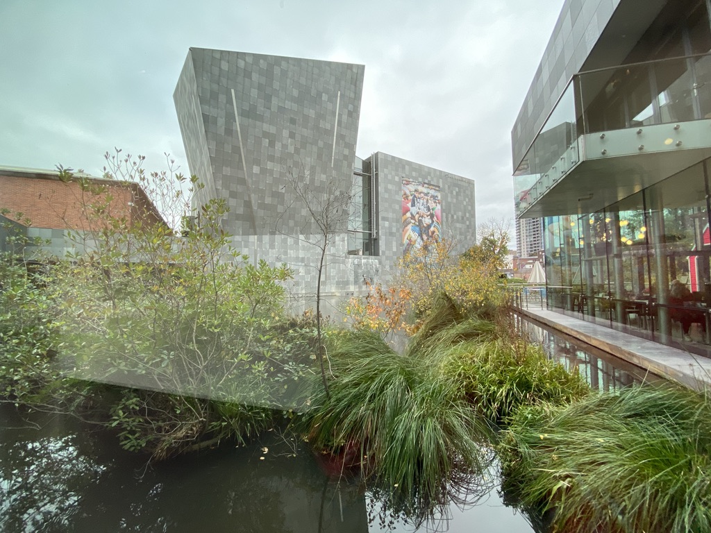Then we drove to the Van Abbemuseum which –keeping with the theme – had devoted about 2/3 of the museum to artists working on sustainability issues from a more global position. Driving is fine because no one here drives very fast, but the big challenge is making sure not to hit any cyclists. Fortunately they seem to totally follow the rules, the lights, and stay on bike paths which are everywhere and soften the streets. Bike paths are wide, go in both directions, and have their own lights. Anyway, the museum is about 85 years old and was totally renovated about 15 years ago, including the construction of a new building that wraps around the old one from the rear and the side – creating a rather large complex. The museum sits on the River Dommel so it has an unusually natural setting, albeit within the heart of the city. I think they widened the river a bit and added some kind of “fish ladders” and created a bank along the river that abuts the museum. There’s a sort of “lake” feeling which is felt when you sit in the museum café (which can be reached by a little footbridge that brings you into the back side of the museum. The façade of the new building is covered with a natural stone that came from Lapland.
