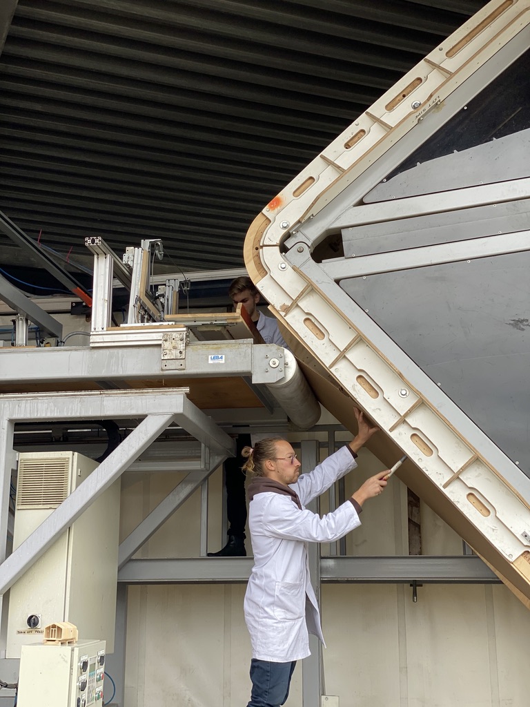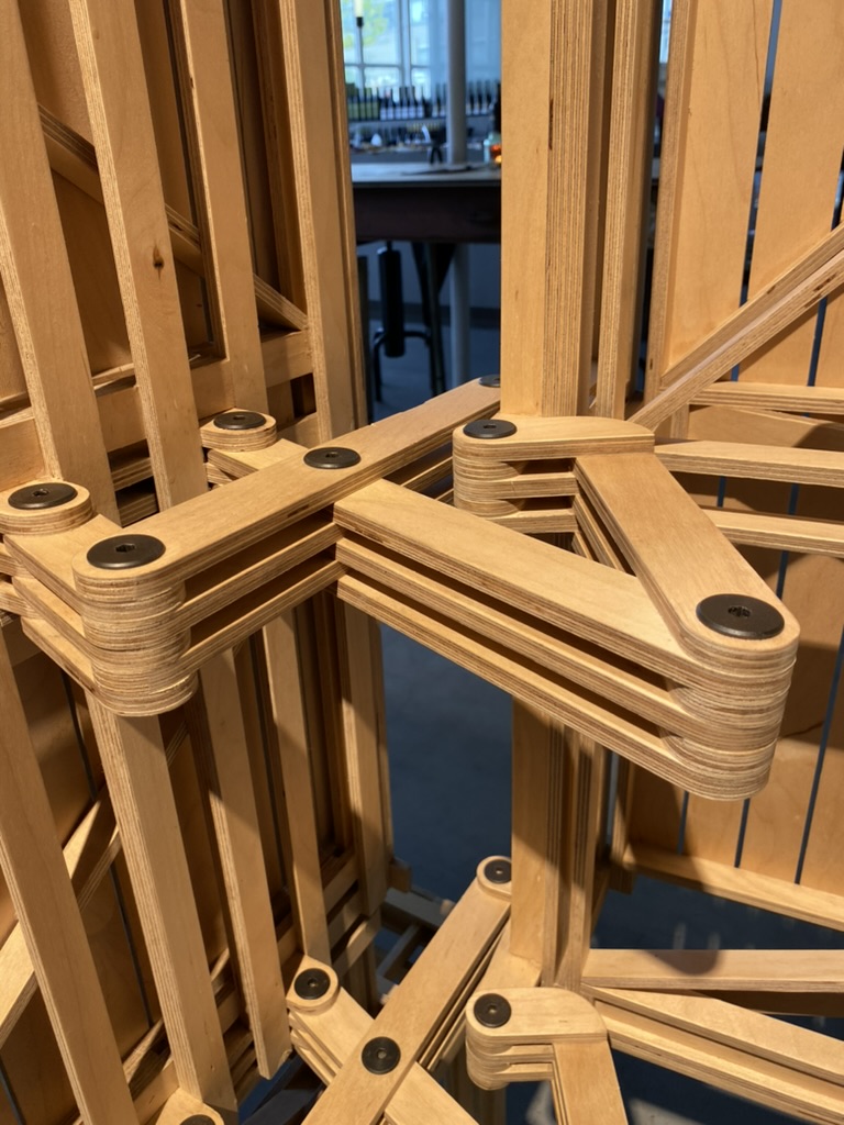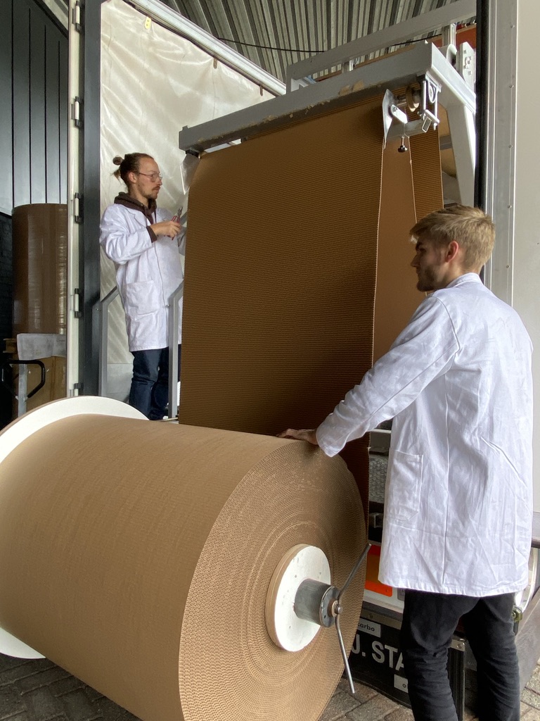 It’s a long story as to its origin and the making of the machine that actually fabricates the house, but it’s made of 12 layers of corrugated cardboard with a thin piece of wood separating each set of the six layers (for rigidity and also to enable the insertion of electrical tubes and other utility needs) and then covered with a plastic like (but definitely not plastic – they described it to us in English as “the raincoat”) and then another layer of wood. The units are modular and can be created using as few as two sections or as many as needed. We say one with five sections and one with just two.