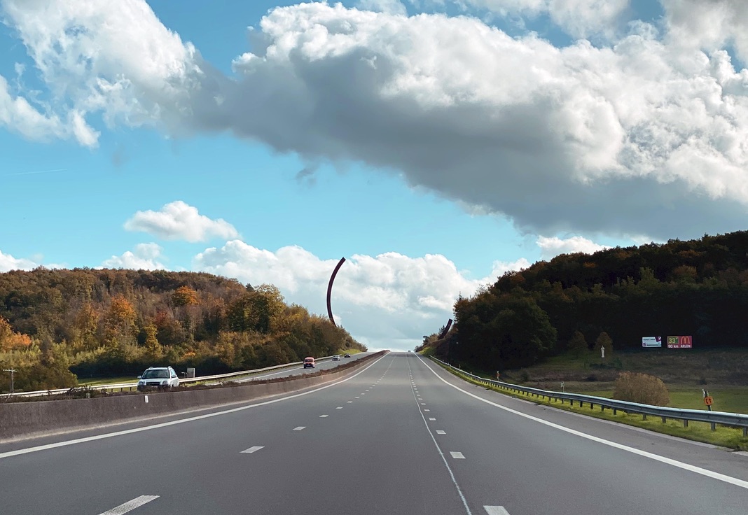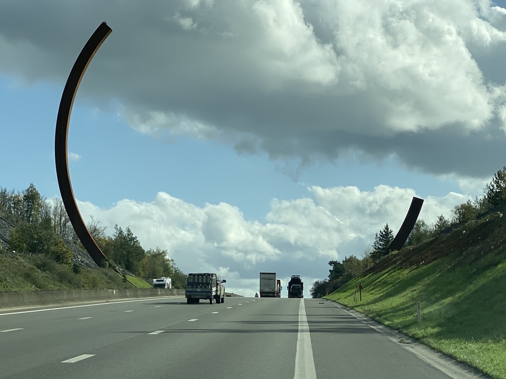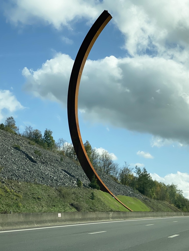 Had quick breakfast near the railroad station in Maastricht, where we went to purchase tickets for our train much later in the day. Wanted to avoid any lines and be sure we could get the train we wanted. Then started our drive to see the L’Arc Majeur – located somewhere about 15 miles beyond Namur in Belgium. I had seen an article about it and we decided to visit. It’s a 200-ton sculptures composed of two arches that don’t complete a circle and are of different sizes – it gives the impression of a semi-circle or a circle set into the road. It was originally commissioned by French President François Mittérand, but was abandoned at least three times. And now it sits on the highway #411 in Belgium and was inaugurated yesterday (we are such trendsetters to come and view it the very next day!; guess if we were really on the ‘in’ list, we would have been invited to the inauguration. Funny, we thought about going yesterday and had no idea there was the official “opening.” The sculptor is Bernar Venet. It took 6,500 hours of work by welders and steel fitters to create the piece.