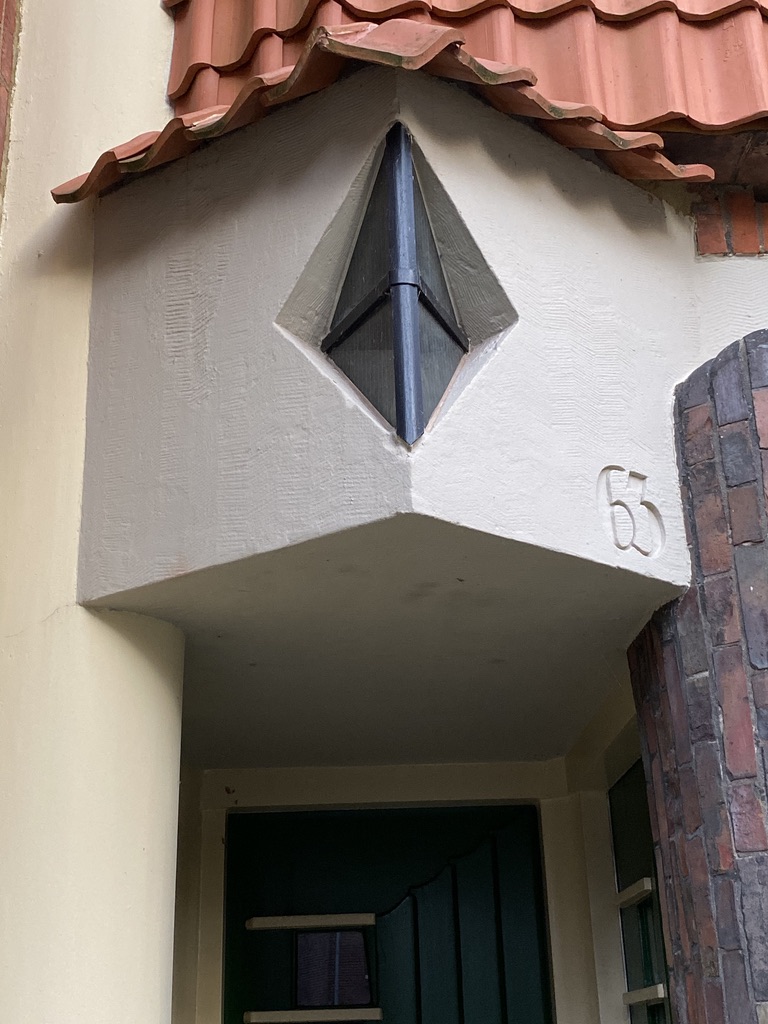 So, we got there and were walking around the perimeter and then I decided to try the main door (leading to public spaces) – It was open so we walked in.. We were checking out the lobby (cautiously, knowing that perhaps we weren’t supposed to be there) when a woman appeared. She asked how we got in and we explained that the door was open. She was a bit flustered but then we struck up a conversation. Turns out she founded the little museum and is very active in the social housing movement. Apparently one day she stopped at the post office and admired the building and was told it was to be demolished. She thought that was a terrible situation and fought to reclaim it as a museum to honor Dutch architecture, Het Schip, and social housing. She’s been managing it ever since. She gave a us a quick history of the place including the fact that there had been a small school at the site and deKlerk literally designed Het Schip to be built around that school – above it and adjacent to it and behind it. The school is no longer there and additional housing was created.