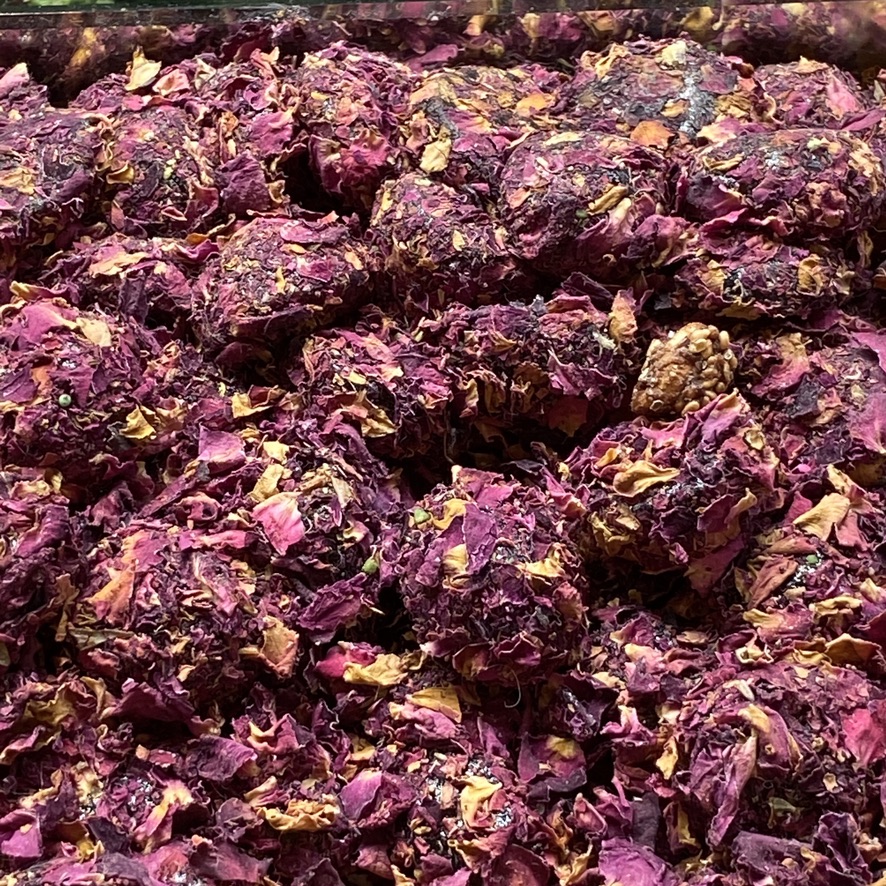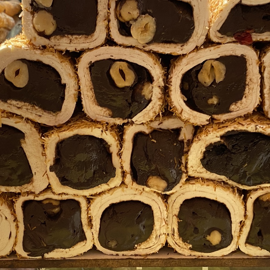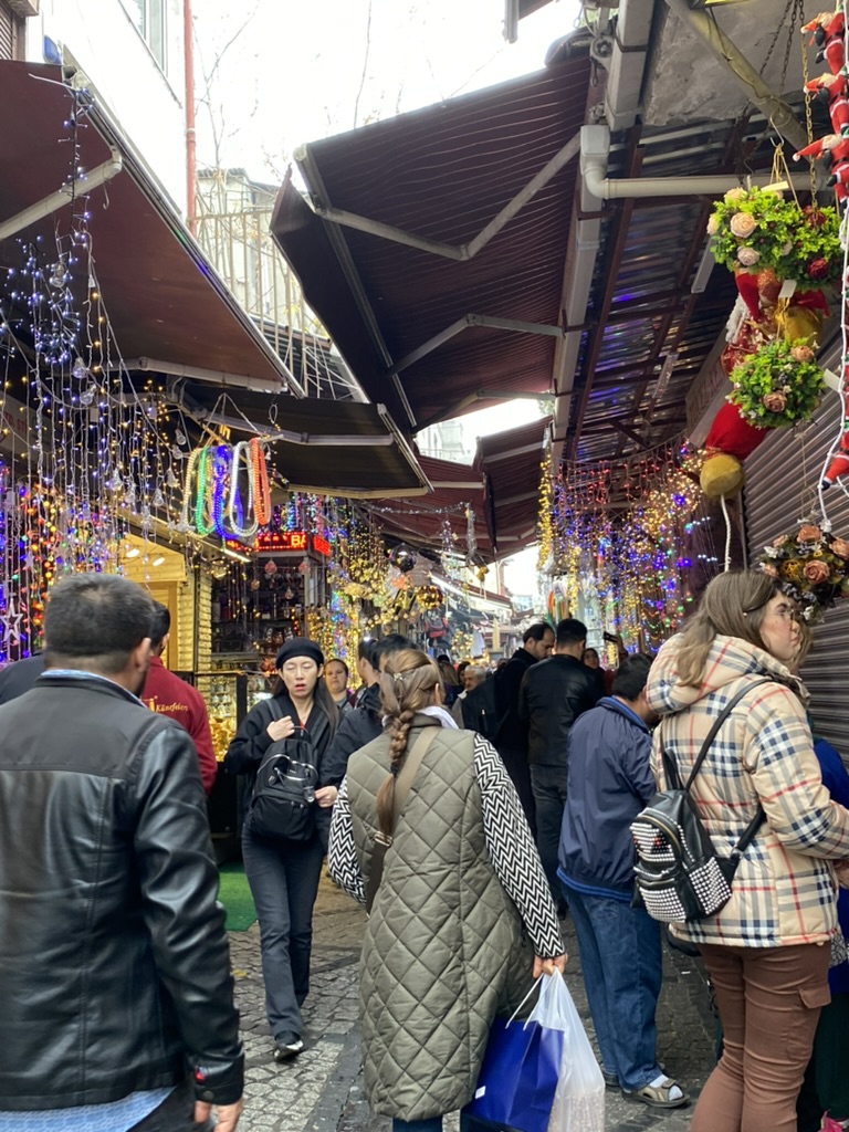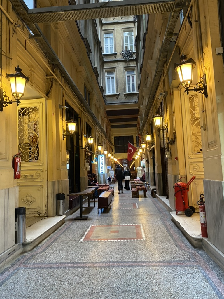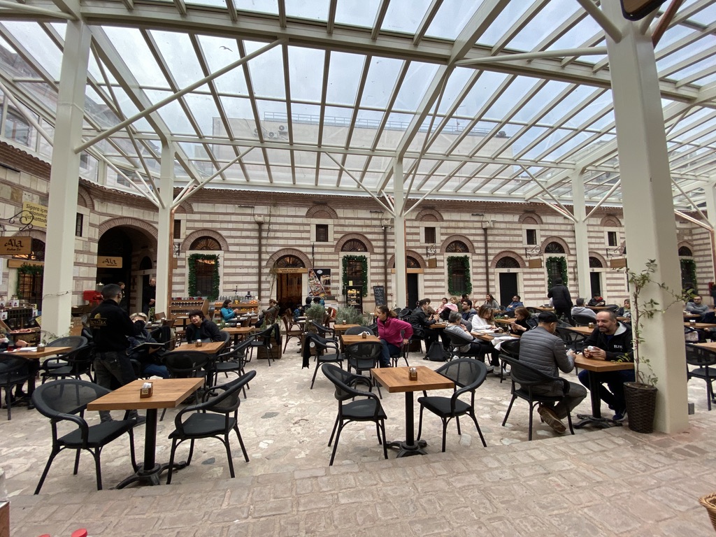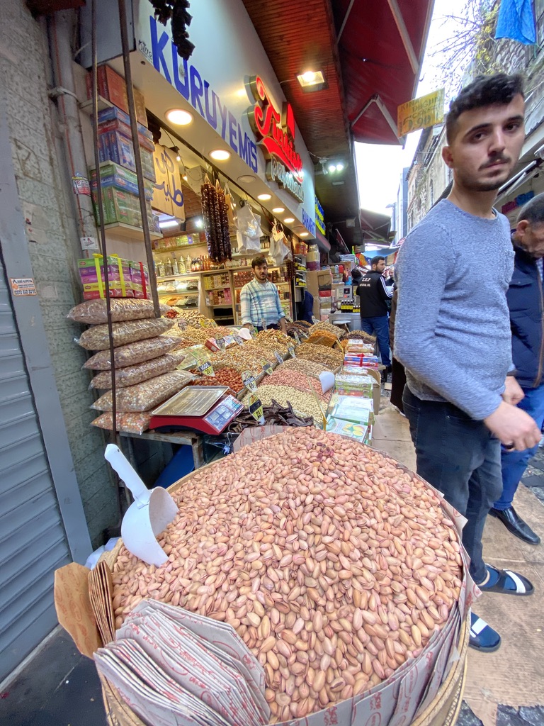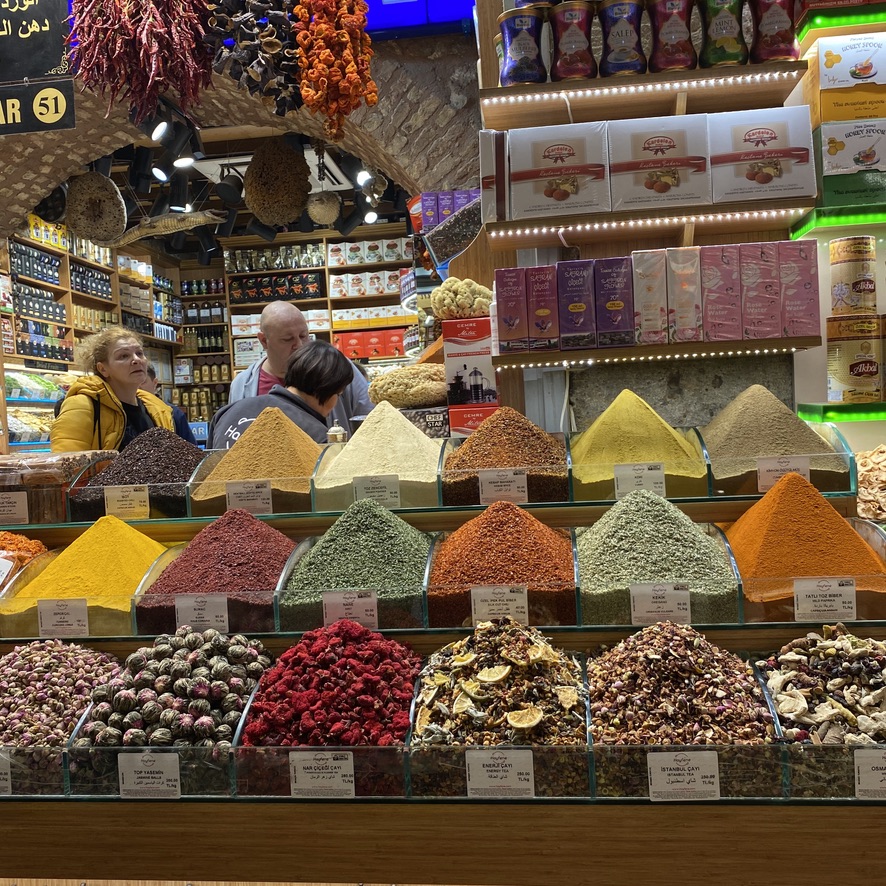 Today, we started with breakfast on the rooftop again (shakshuka for me; poached eggs over spicy avocado for Mike) and then headed out to visit the Rustem Pasha Mosque which we had heard was quite beautiful and much less of a tourist attraction than the major mosques. This one is located amid a thriving market with hundreds of stalls surrounding the complex and shops built into the wall as well. We walked from our hotel (about 1.5 miles) and finally located the entrance to the mosque – through a narrow passageway within the market and up a flight of stairs. But alas, the mosque is undergoing some restoration, so it was closed. We then strolled to the Spice Market and stumbled onto a beautifully restored courtyard that had recently been restored and converted into an outdoor café circled by small shops that sell the same things on the menu – baklava, halvah, coffee, teas, and a large assortment of nuts, along with traditional coffeepots and other tea and coffee paraphernalia.