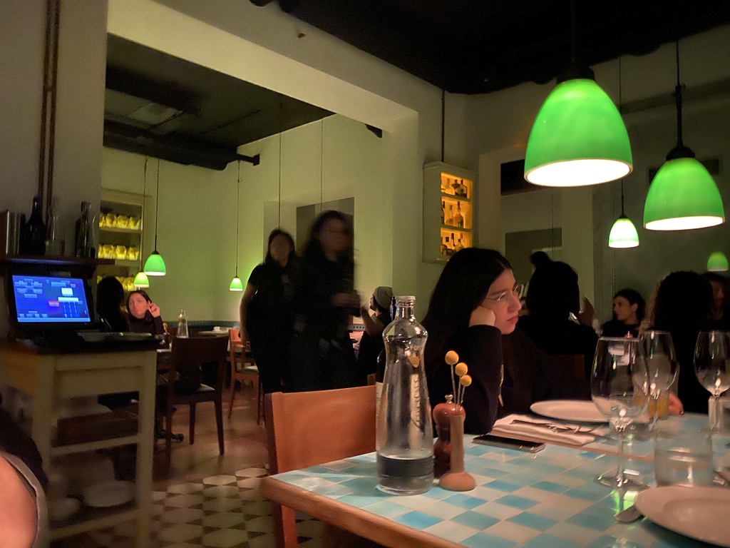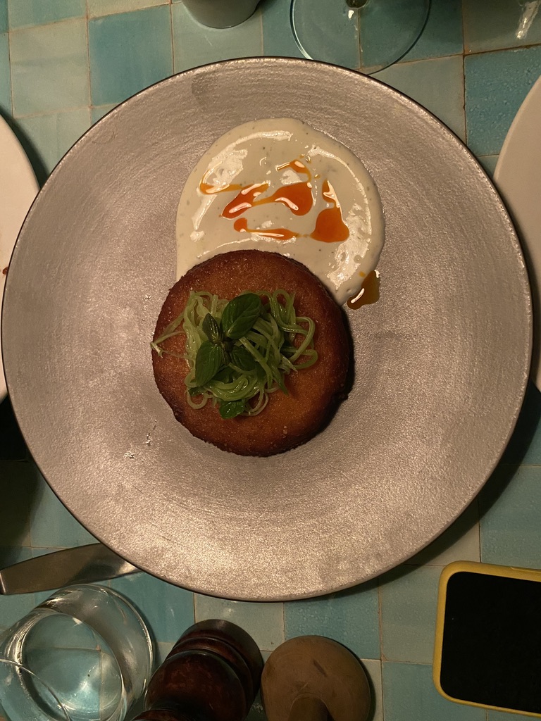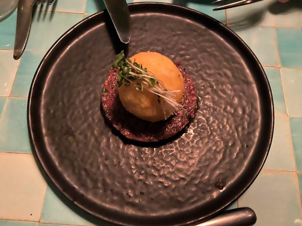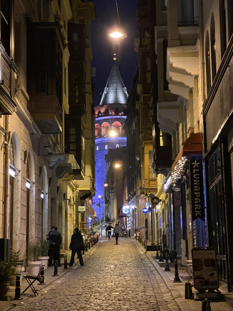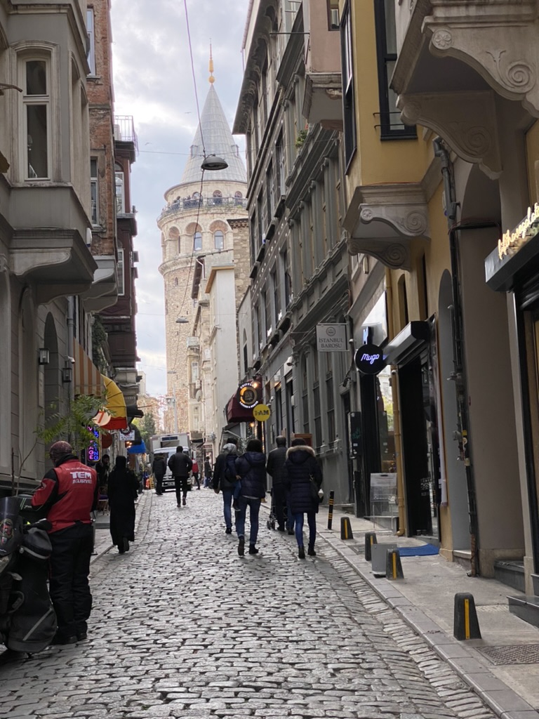 We feasted on four appetizers and the octopus for the main course. It’s apparently octopus season and all the restaurants are featuring an octopus dish. We had what they called Kefta Decomposed which was a wonderful steak tartar that came with a crusted potato on the top – in the shape of a golf ball – and when you cut into it there was an egg with the yolk totally raw and swimming into the meat; manti (of course!); a fried local cheese with honey, chili oil, tamarind, and hazelnuts; lamb sweetbreads with some kind of carrot spread and walnuts. The meal was great and it was a much livelier place than Asitane would have been. We walked back to the Georges, admiring the amazing Galata Tower always in our view.
