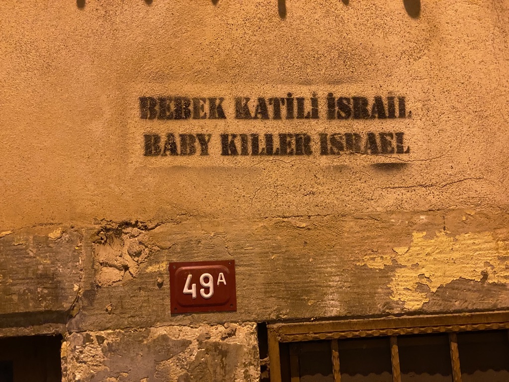 Thanks for all the good karma regarding our luggage. We received the bags at our hotel in Istanbul last night. It’s been hectic here in one of our favorite cities. We’re staying at the Hotel Georges, a delightful 21-room, 150-year-old former residence of a prominent physician/psychiatrist. It’s located on a very narrow, cobblestone street in the maze of the Galata District and the Beyoglu neighborhood. It’s four stories (and we are on the top floor with a delightful little balcony) and they have a rooftop restaurant – where after our ordeal with the bags and getting from the airport to the hotel (at around 10 pm) we decided to try it, rather than strolling for another restaurant. Food was great. We shared two appetizers and a main course of octopus (which was prepared with a light citrus sauce, but with a bit of spice).