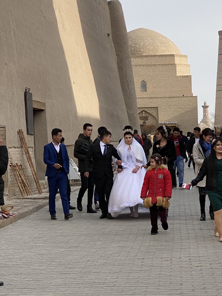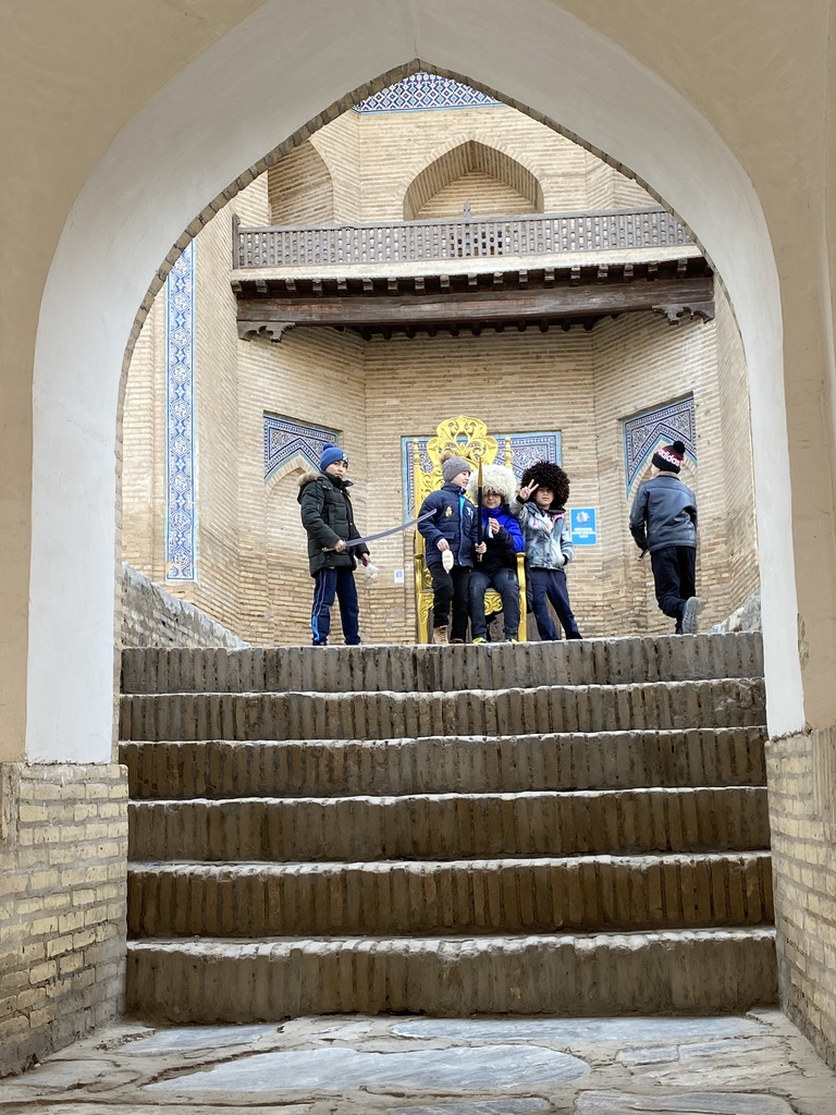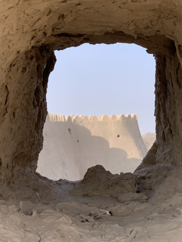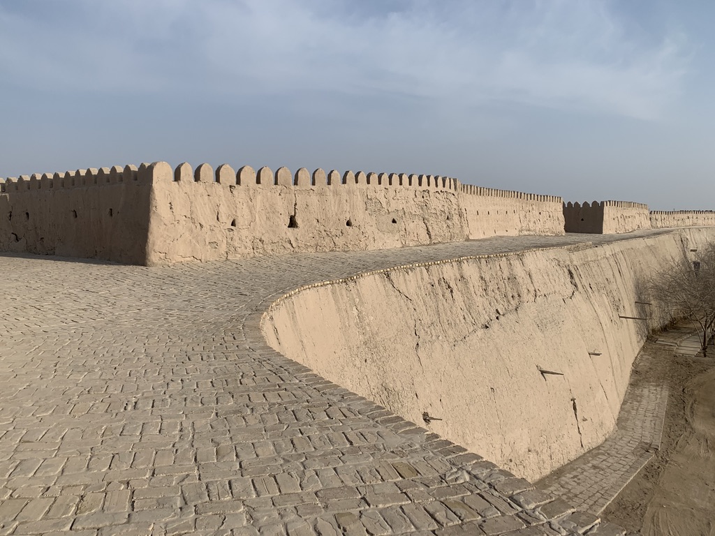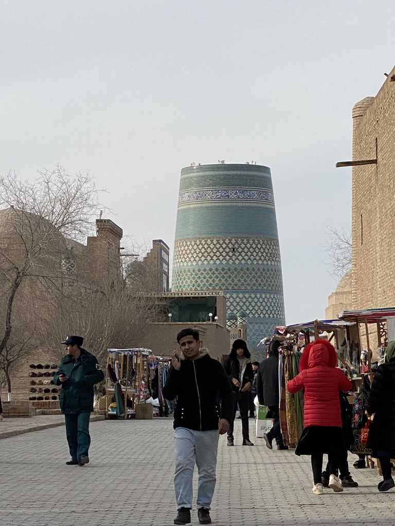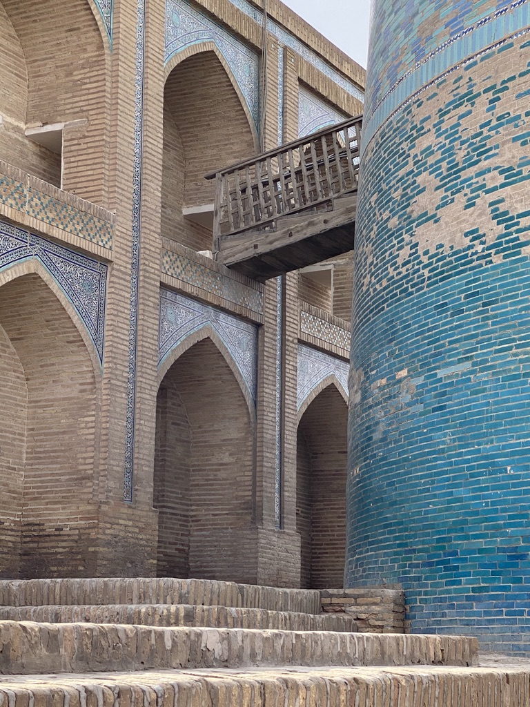 It’s a small city of about 90,000 people located on the western edge (toward the north) of the country… actually right on the border with Turkmenistan. There are really two parts to the city – an “outer town” that is known as Dichan Kala, and an “inner city” called Itchan Kala which is surrounded by ancient fortress walls made of brick, mud, straw, rammed earth… They say the foundations for these walls were laid in the 10th Century. Parts of the wall were redone in the late 1600s and are about 30 feet tall. There are literally scores of “towers” and minarets within the Itchan Kala (which is where we are staying and there is a very tall one that we can almost touch from our window). There is also a very large tower (far more squat than all the others which have a graceful and elegant base and rise to the top), called Kalta Minor – it’s a large blue tower very centrally located. Apparently it was supposed to be a minaret (probably intended to be taller than most of the others, as one can judge from the width of the base. But the Khan who had “commissioned” it died well before it was completed and the next Khan decided to leave it be…