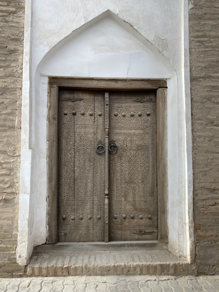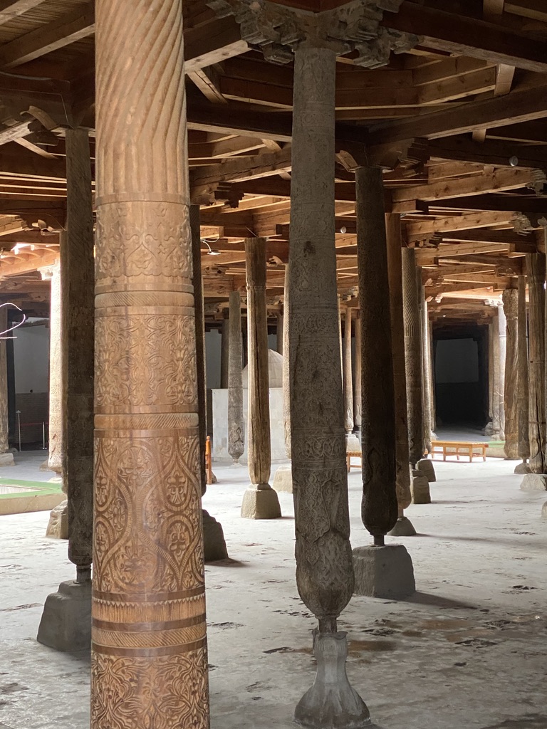 There are about 300 families who live in mostly mud and dry bale type houses throughout the inner part of the city, within the Itchan Kala. One of the most fascinating buildings we encountered in our walk yesterday was the Dhjuma Mosque from the 10th Century (and rebuilt in the 1700s… using 112 columns that were retained from the original structure. All over these ancient cities and towns there is construction and reconstruction going on as efforts are made to shore up existing ancient structures and everywhere you can see settling of the structures with many leaning or bowing. Remember, no rebar or steel in the construction. The techniques to do this are interesting.
