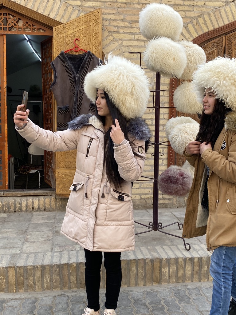 We had had lunch at our hotel, and thus decided quickly not to have dinner there… So, we asked the front desk guy who speaks some English to suggest restaurants. He said many would be closed due to the weather and winter season. But he told us that the “Terrace Restaurant” was open. We trekked in the totally dark “streets” that were very difficult to navigate given the uneven stones, unpaved, mostly dirt that was not level…. Took us about 10 minutes to do the supposed 4-minute walk. Naturally when we got there, the restaurant was closed. So we meandered back to the hotel to have dinner which was not too good. I had the famous Khiva green (dill) noodles which was edible.. Mike had some kind of beef which he likened to shoe leather with limp French fries. So much for that meal.