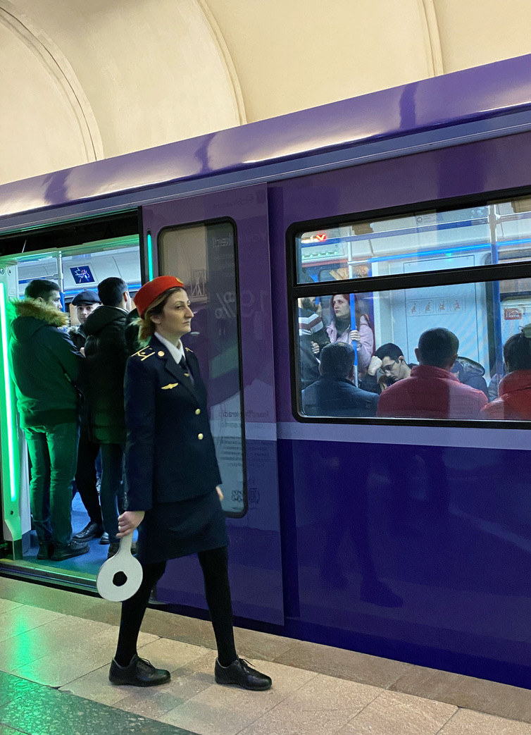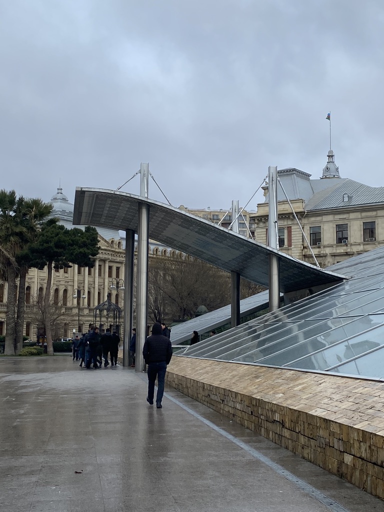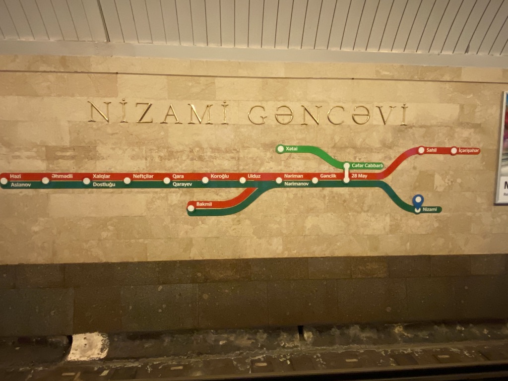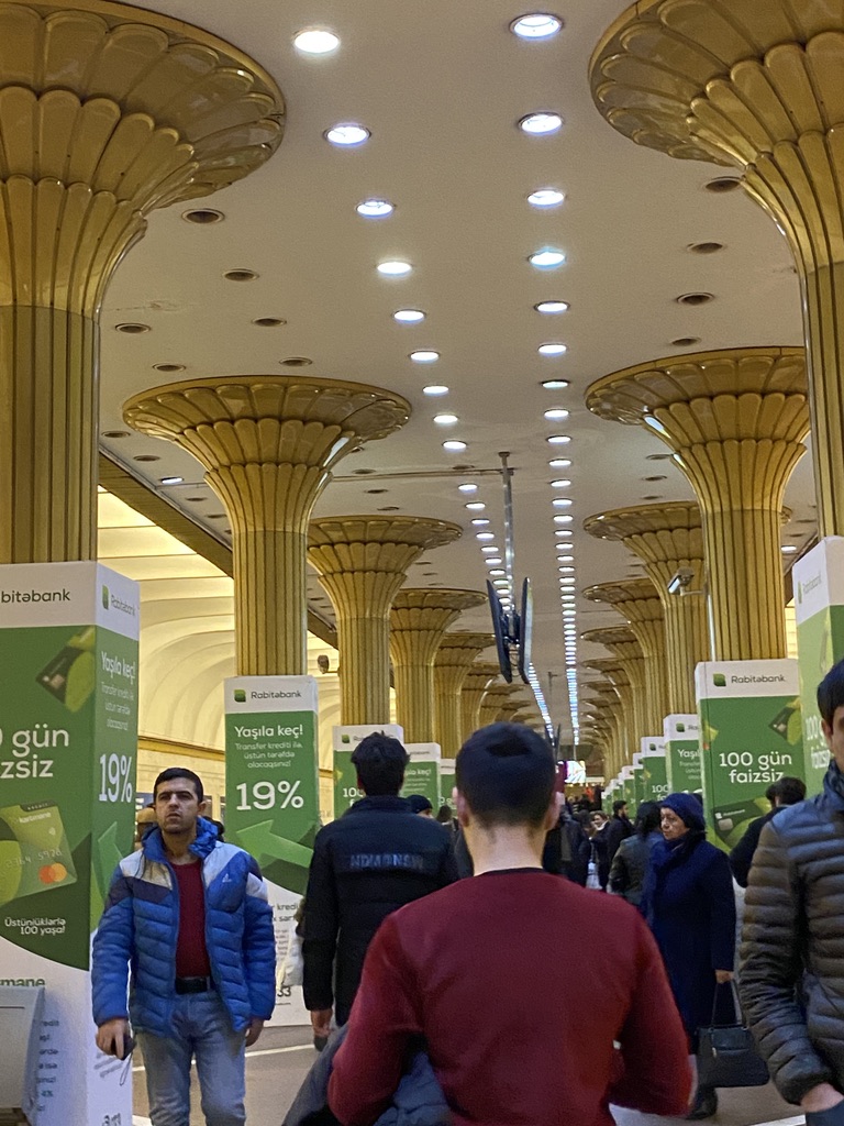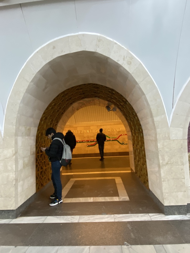 Stopped at the concierge desk to ask a few questions about the metro and it was clear that the hotel staff thought it was really funny that we wanted to take the metro; they were even more surprised when we asked a bit about neighborhoods where wealthy people lived and those where lower income people lived, and which metro station would get us to the different neighborhoods. Anyway, off we went. The walk to the closest metro station to the hotel was uphill and through a really nice park. After about 15 minutes walking in the wind and rain, we arrived at the station. It took us a little time to figure out the system and how to purchase a ticket. You need exact change and the machine instructions were only in Azerbainjani (or at least that’s all we could see on the screen). We finally figured it all out and it turns out that there is an English option, but the button to click to change to English is not very prominent. We got the “cards” and off we went. The system is really very simple – only two lines: the red and the green.