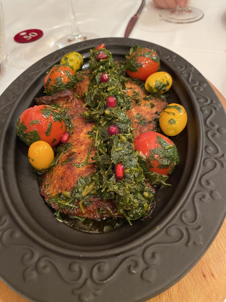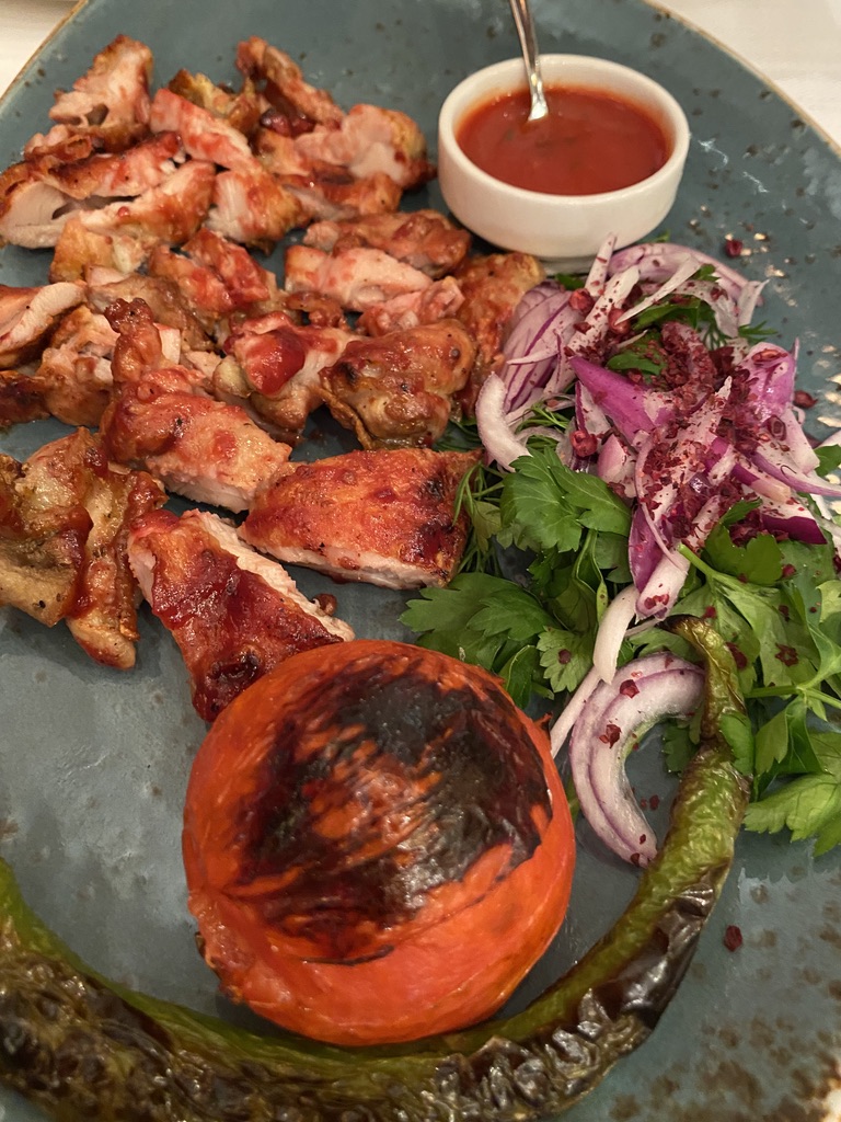 The concierge suggested a place called Sumakh. It was incredibly good. I think we are making up for all the rather boring meals in Uzbekistan. Menu looked so good, we definitely over-ordered. Started with a wonderful eggplant appetizer (char burned and smashed to add tomatoes, peppers, onions, garlic) served with home-baked bread; followed by a pasta (dumplings stuffed with lamb in a pomegranate sauce – yummy); and then two main courses: sturgeon topped with greens and served with three dipping sauces and garnished with cooked cherry tomatoes and kumquats; and chicken and plum sauce. Again we had a bottle of local wine… and tonight NO dessert. Would have had to roll me out.