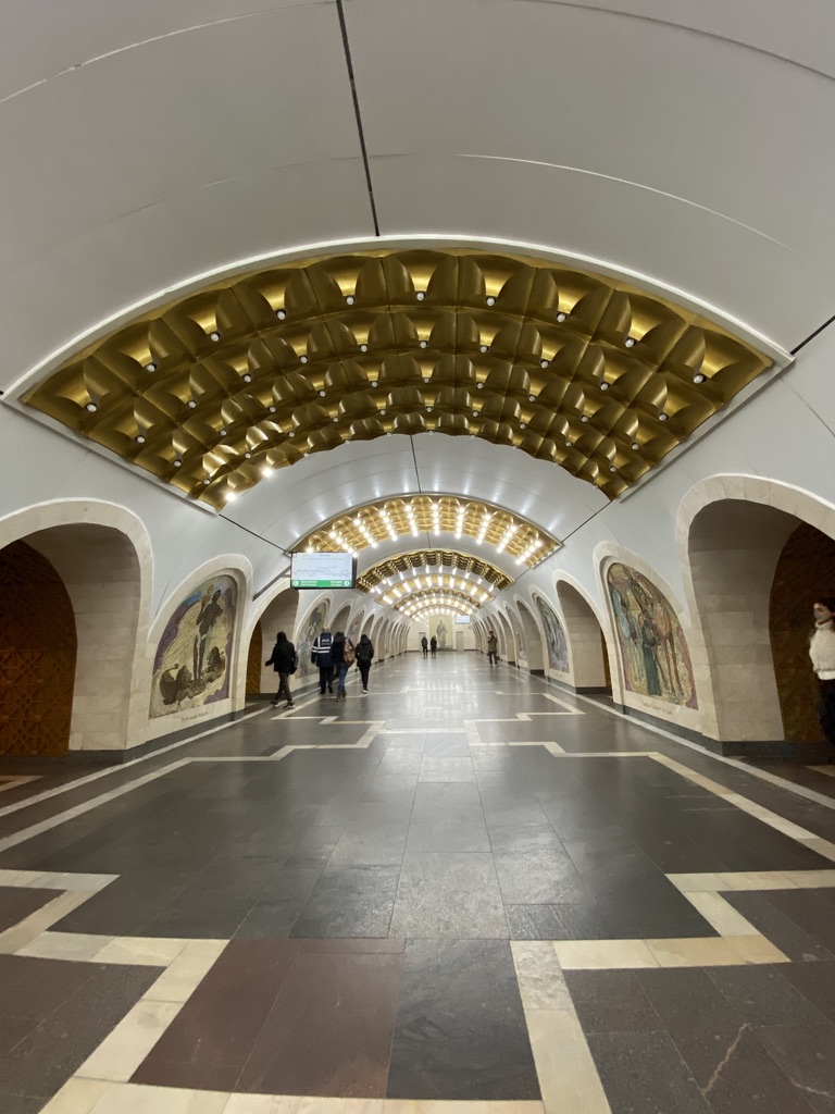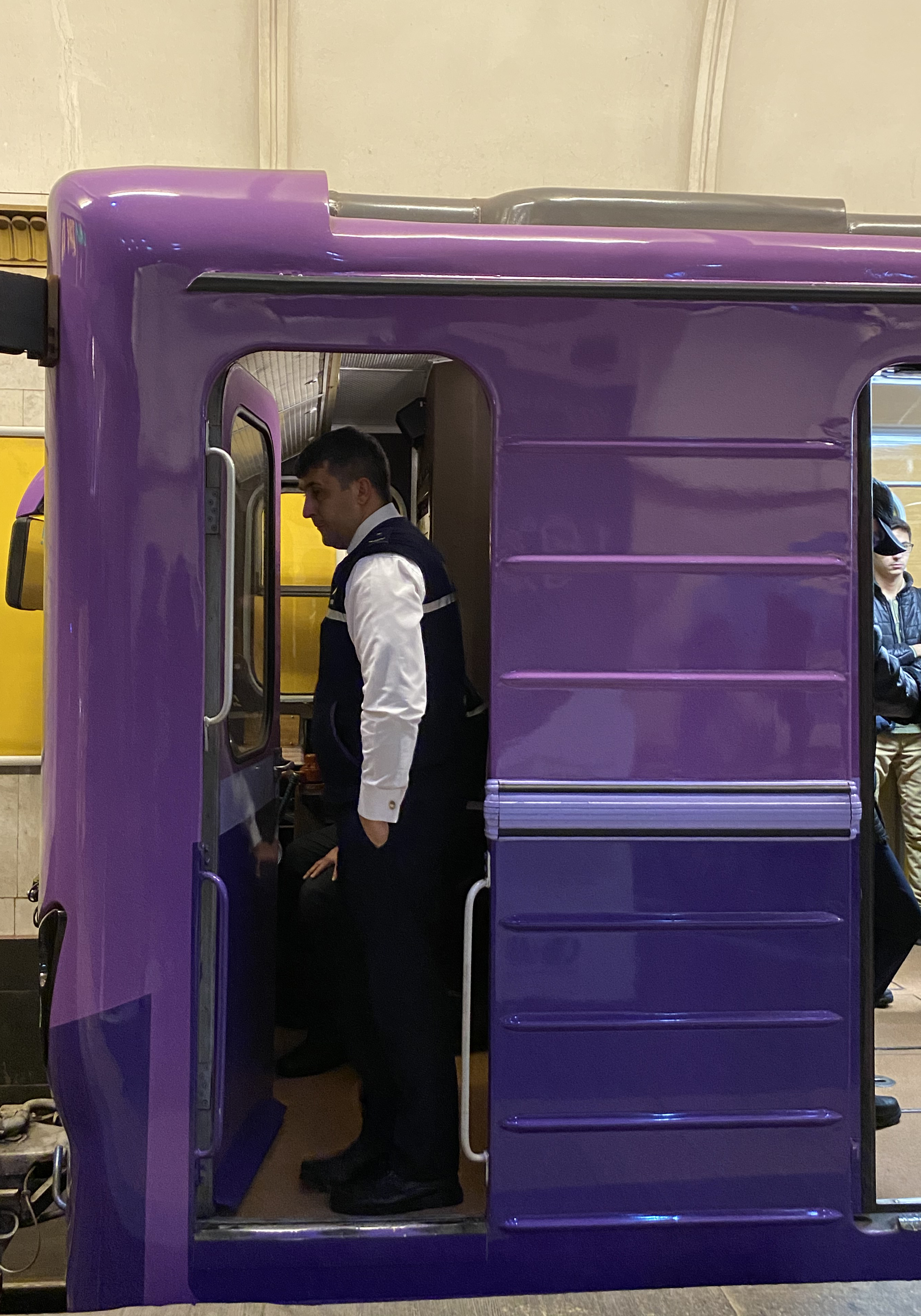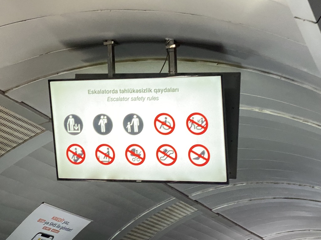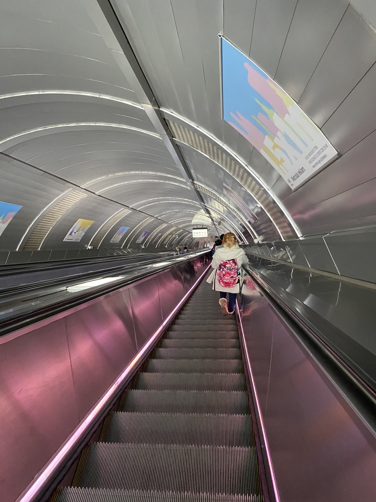 The stations are immaculate; no litter; no gum on the floors; no trash. There is one station monitor who seems to have a ping pong paddle-like thing in her hand – one side is red. We never figured out what she does with it. But once again, she doesn’t look like she likes her job. The trains were quite crowded and looked like 1960s vintage although they have clearly been refurbished and painted. People were polite. One funny thing is that when the train approaches each station, in addition to having an announcement about the name of the station and the next station on the line, classical music plays. Each station has a different classical piece. I suppose this is their way of letting blind people know the station and also a secondary way for all passengers to identify each station. And perhaps it’s also a way to make each station feel very palatial and to have a kind of grandeur to match the stations.??? Oh, as you can see in the photo of the sign—many things are prohibited on the stations and trains, including spike heels/