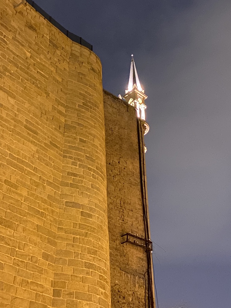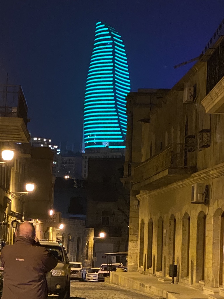We walked back to the hotel at about midnight, stopping frequently to photograph the Flame Towers which put on quite a light show every night — changing colors through lighting on each of the three buildings.. Blue, then red, then green then what look like people carrying the Azerbaijani flag (which is naturally red, green, blue), then what looks like water flowing on the buildings, then a scene of people with umbrellas, then flames, and then repeat… It is amazing to watch from different vantage points throughout the city and very mesmerizing. We trudged down the cobblestone streets, walking for a while in Kichiqala which seems like restaurant row. We returned to the hotel and Mike decided to try out the whiskey bar located on the lobby level… Finally we reached our room at about 1 am.