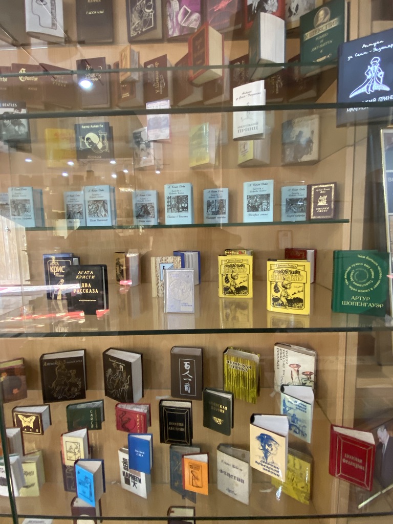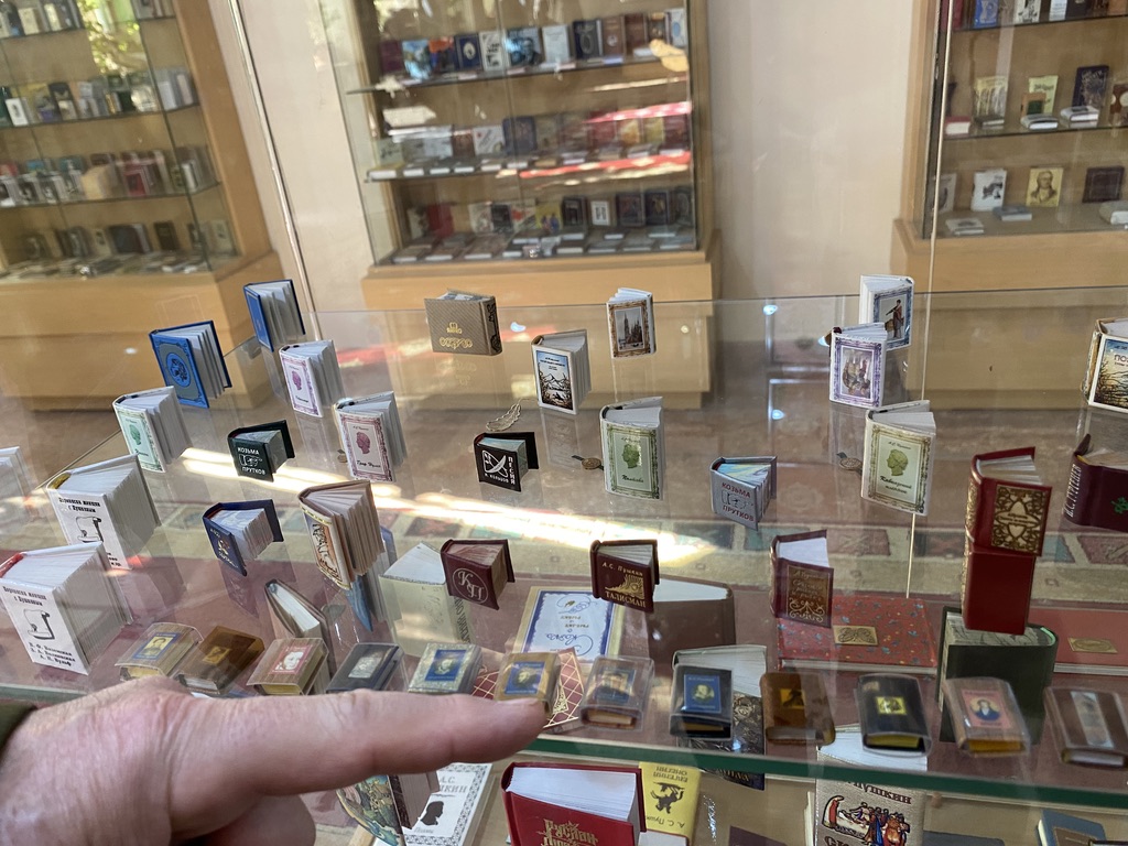 We strolled and strolled (my foot seems to be a little better, but I’m still a bit hesitant on the uneven pavement and steps) and wound up at the Museum of Miniature Books – which houses a collection of more than 3,000 tiny, tiny books – some of which are as small as 1” x 1”. They have little books from all over the world including the Communist Manifesto and the Bible. They have a whole section of dozens of books about 1.5” x 1.5” of Lenin’s work in many different languages. Most are bound as books while a few are single sheet folded accordions – obviously to my liking!