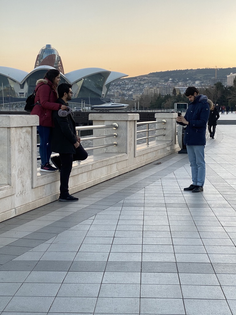 We then wandered to find Abad… a shop we had heard about that is government-run and sells crafts that are made throughout the country. The young guy who is cashier was most excited to learn we were Americans as he hopes to attend Illinois Institute of Technology (IIT), but worries about a visa. Again, we heard that America was great, and he, too, wanted to go into aerospace engineering and work for NASA. We bought a few things and then stopped at the hotel to drop off the bag… and headed to the waterfront which is across a big boulevard from the Four Seasons. You get there through a very modern underground tunnel with escalators and marble floors. Again, no trash, no graffiti, not even a cigarette butt. And with people constantly sweeping whatever little remnants might have dropped. It’s a grand walking boulevard that edges the Caspian Sea. No cars, pedestrian only. With an area for skating and skateboarders. We strolled for about a mile and reversed our path.