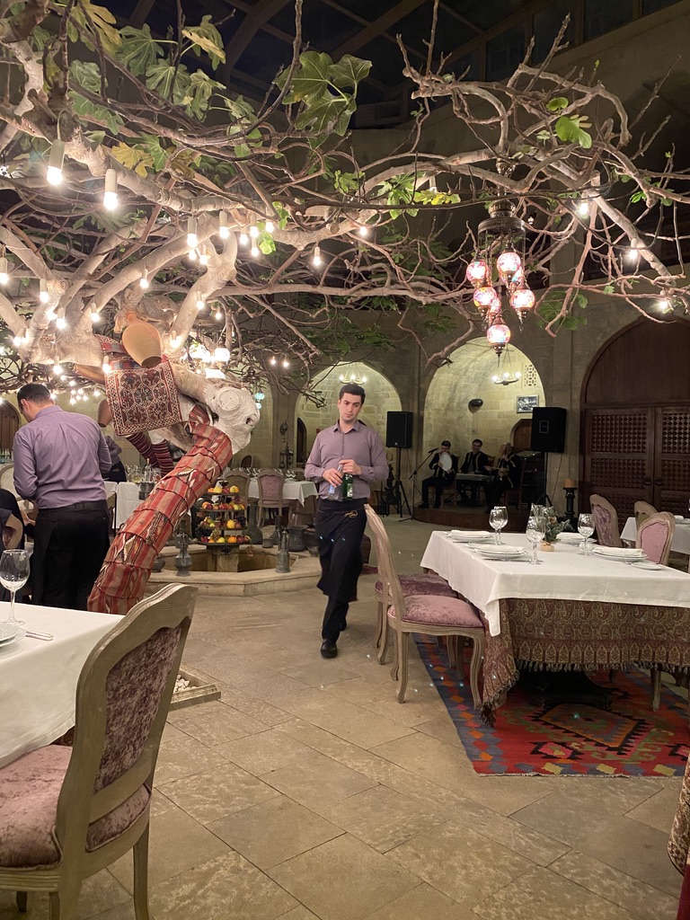 We then headed to Mugam Club for dinner.. a delightful place located within a 16th Century building that we believe was a caravansary – now a restaurant with lots of little rooms that come off a main space that is really a courtyard but which has been glazed over. For the foodies… we started with something called eggplant Langham (stuffed small eggplants – stuffed with the meat of the eggplant ground with nuts and pomegranate) and some kind of dolmas made with pistachio leaves instead of grape leaves. Both were very tasty and served with wonderful local bread. We then had two main courses.. a rice pilaf with chicken and apricots… and a lamb shish-kebab. Everything was wonderful except the lamb. We tried desperately to explain that we didn’t want the meat over cooked and wanted it to be “red” (rare), but maybe they thought we meant to be sure to cook it so that it was not rare. Anyway, the lamb was leathery. We should have learned by now that it is very difficult to order meat unless it is within a dish that has other items and is sort of stewed. Otherwise it always comes over-cooked. We had a nice local wine and then some mint tea.