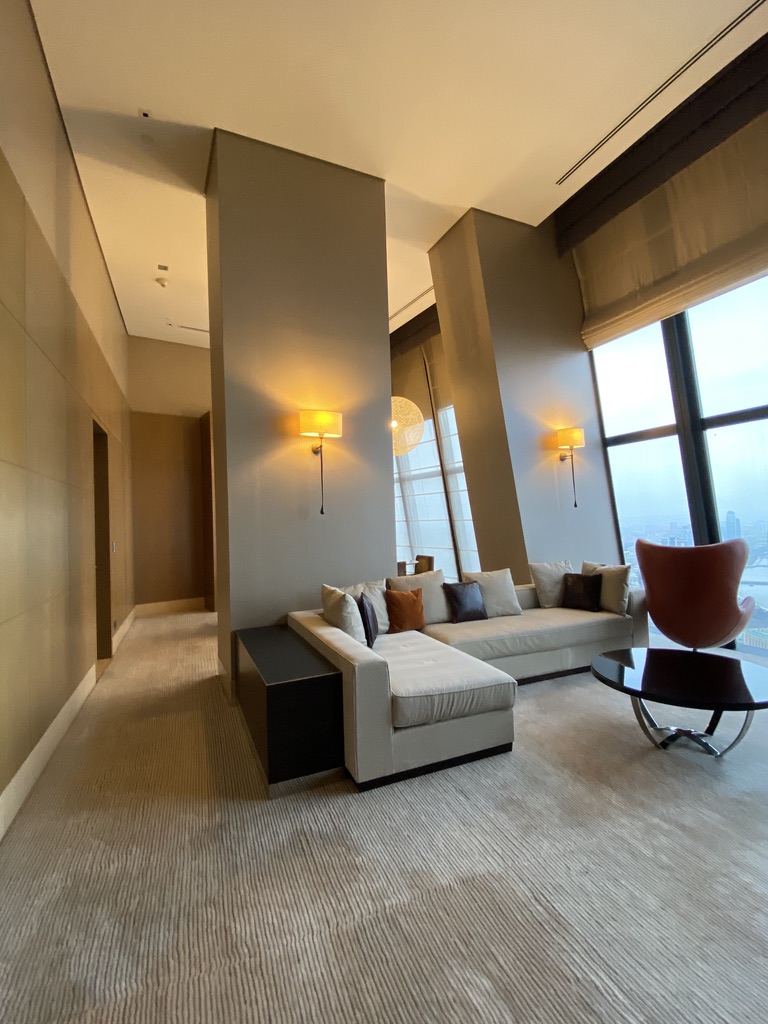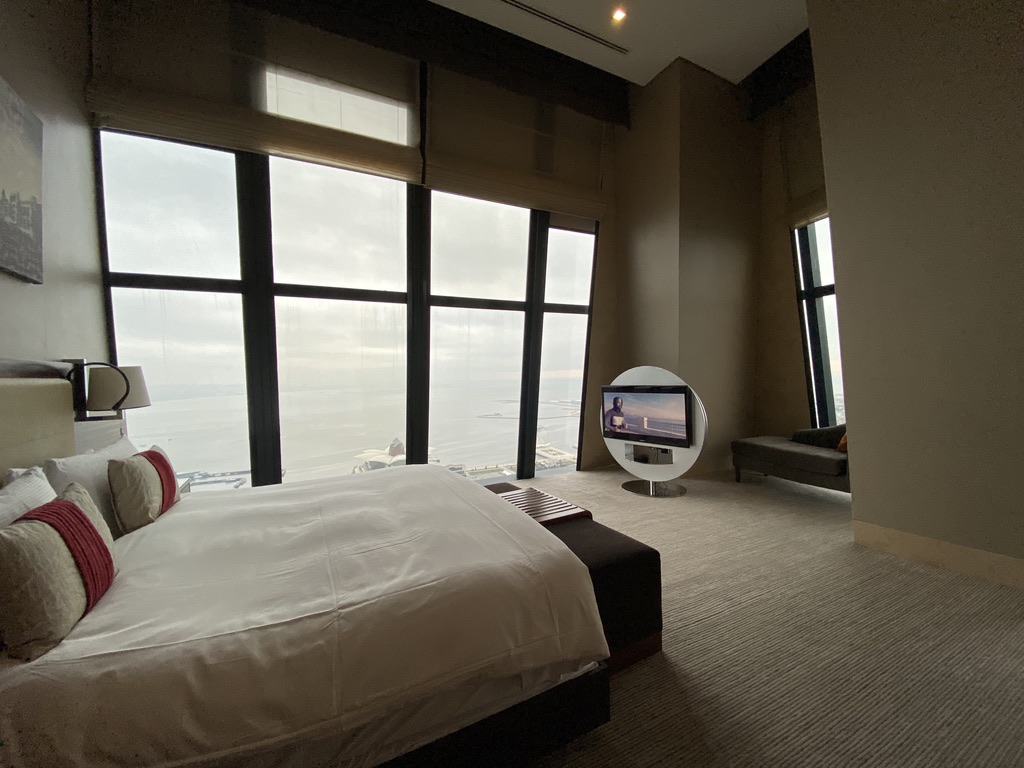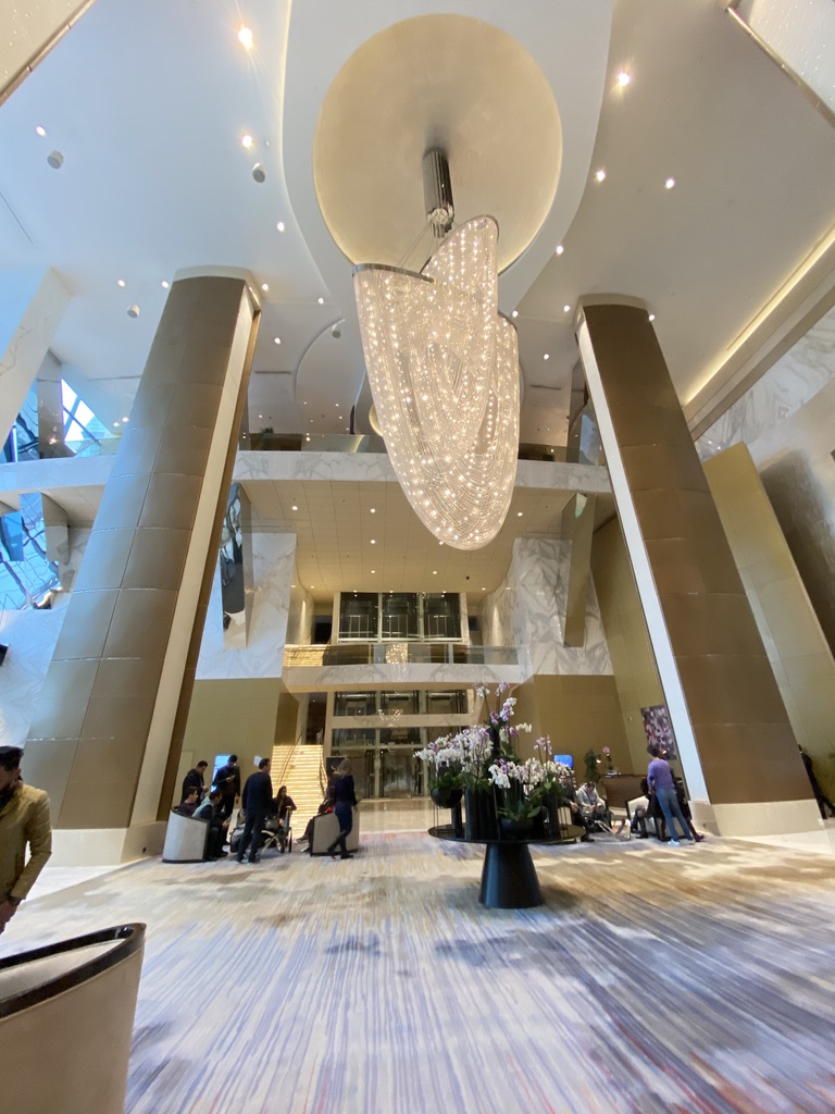 As it turns out only one tower is occupied by the very luxurious Fairmont Hotel (whose lobby was filled with women in very elegant burkas and hijabs), and makes the Four Seasons look like a hovel. The other two towers are unoccupied, although recently a Lamborghini showroom opened on the ground level of one of the two empty buildings. One building is intended to be residential (but I get the sense that marketing may not be going so well) and the other will be commercial (offices). As of now they are just canvases for the nightly light shows. Once inside the lobby with its soaring 50’ ceiling height, we went to the concierge and asked if we could get to the top floor. We thought there might be a bar or restaurant, but those services are on the lobby level. We explained our professional interest (aargh!) and a young bellman standing near the desk then said something to the concierge and then told us that he would take us up to the top floor to see the view (and also show us the luxurious suite — $1,000 per day – on that top floor from which we would get really good views), just in case on a return trip we might decide to book that suite!