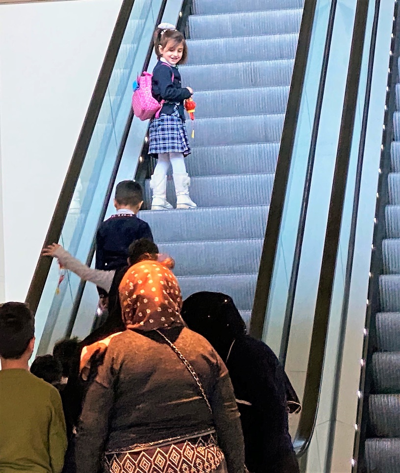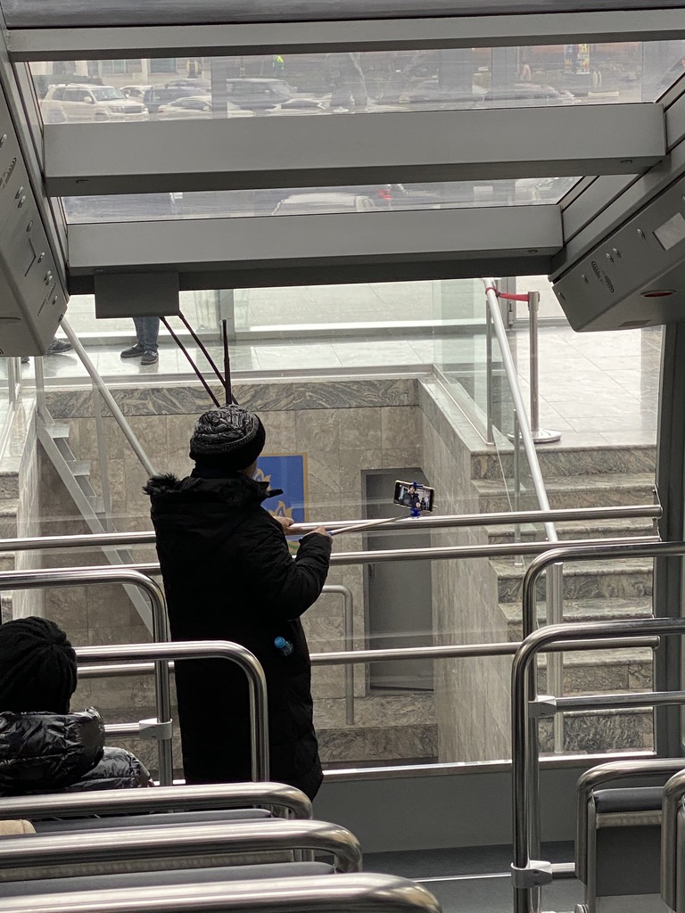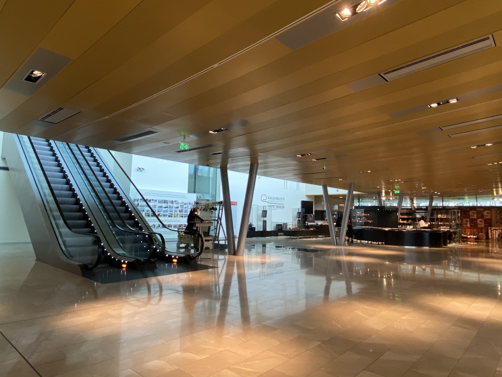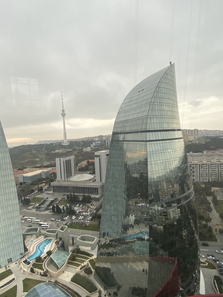 Decided to take a taxi to the trio of Flame Towers – which we see not only from our hotel room window, but also as a backdrop to nearly every part of the city — as they tower above the city because of their height and location at the top of a hill. It’s a love/hate relationship, I assume. The tallest of the three towers is about 600 ft tall. They symbolize flame/fire which is central to Zoroastrianism (fire worship) which has roots in Azerbaijan. One can love the amazing light show it projects nightly and some might even like the architecture; but it comes about because of the narrow distribution of wealth and is an homage to wealth and corporate power. Anyway, given the inclement weather, we figured this would be a good thing to see from the inside.