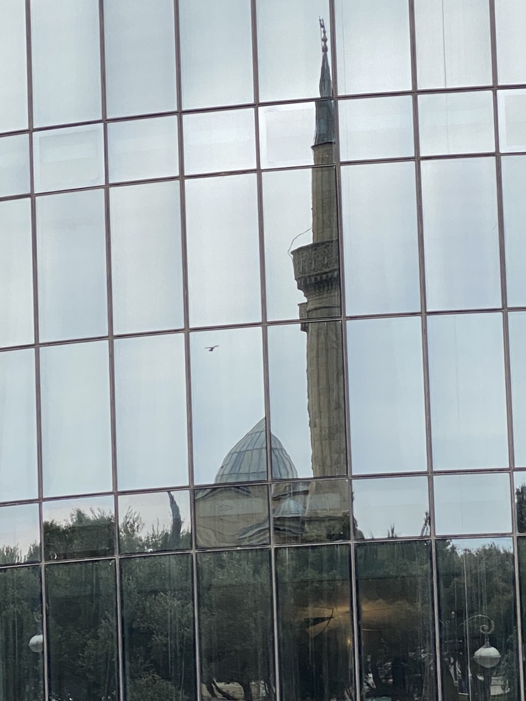 And up we went.. stepping out of the elevator to an amazing view of the whole city (we could see our hotel and the entire old city), including parts we had not yet visited. The young guy is a film student and wants to create action movies (!!) and loves American film and the US. He spent quite a bit of time with us. We found out that the buildings took three years to build and cost $350 million, which is incredibly cheap compared to what it would cost to construct in the US. From this vantage point we could also see the Carpet Museum (whose design looks like a rolled up carpet in section) and the Music Museum which are both located close to the sea — a rambling walk downhill through a series of parks from the Fairmont to the Caspian Sea. Given the weather we thought we might visit; we were told we could take a “cable car” from just across from the Hotel all the way to the museum… Turns out it is a funicular.. so we navigated crossing the street to the funicular station (which I think was probably funded by the Fairmont since its logo is on the entryway. Naturally, when we got to the entry of the funicular, it was closed for lunch so we hung around—checked out the Turkish mosque. Another man was waiting for the funicular; he was visiting from Pakistan (he carried a selfie stick and took nonstop photos – including one with us and one with him and Mike).